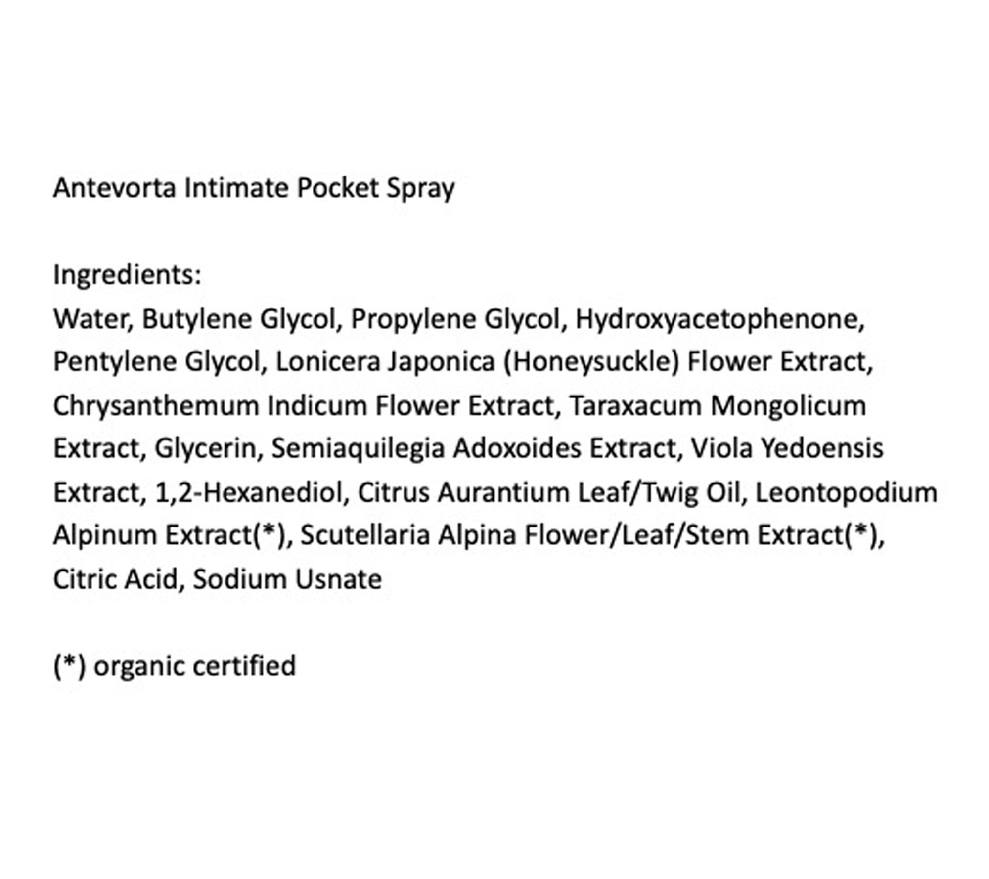 Antevorta Intimate Pocket Spray was developed to help refresh all skin types. The refreshing spray has a light herbal scent that dissipates quickly. Suitable for the full body including under arms.