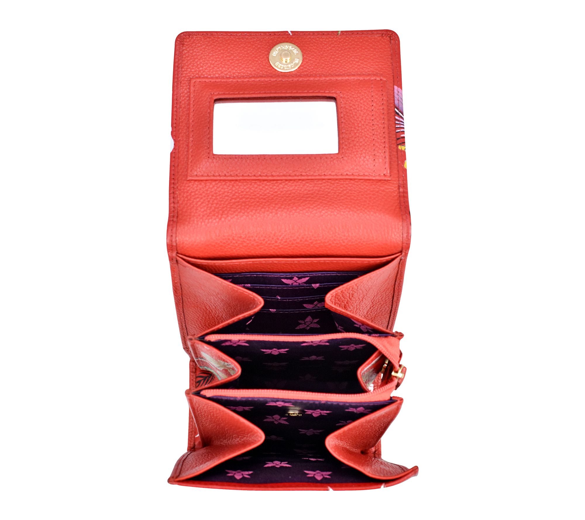 • Inside eight credit card pockets; mirror under flap; detachable key fob