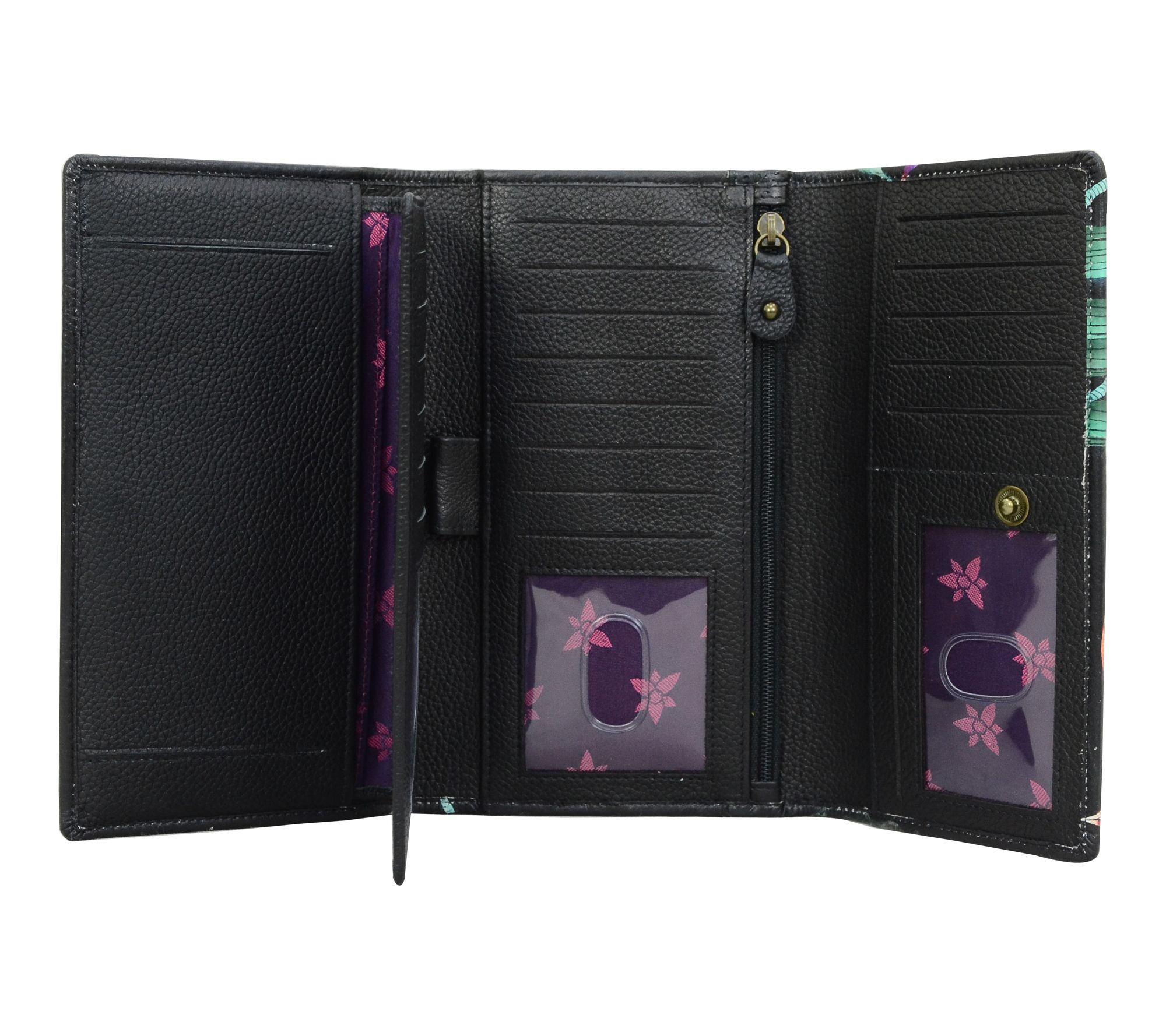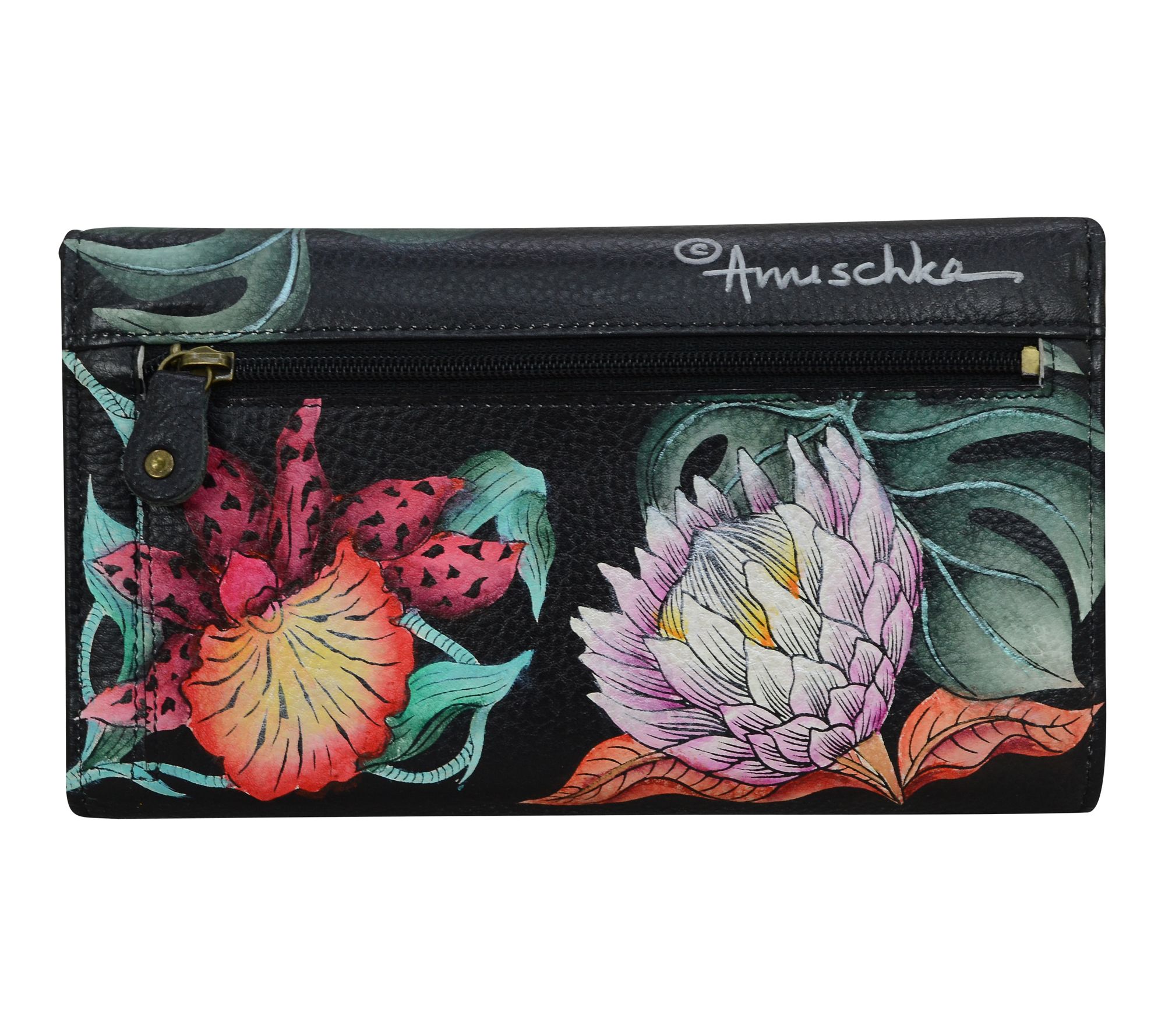 Artistry meets function in this painted leather clutch, designed to bring a vibrant touch to every errand or elegant outing. With advanced RFID protection, you can organize cards and essentials while traveling or tackling busy days. The flap entry and removable check book cover add flexibility for shopping trips or special events. From Anuschka.