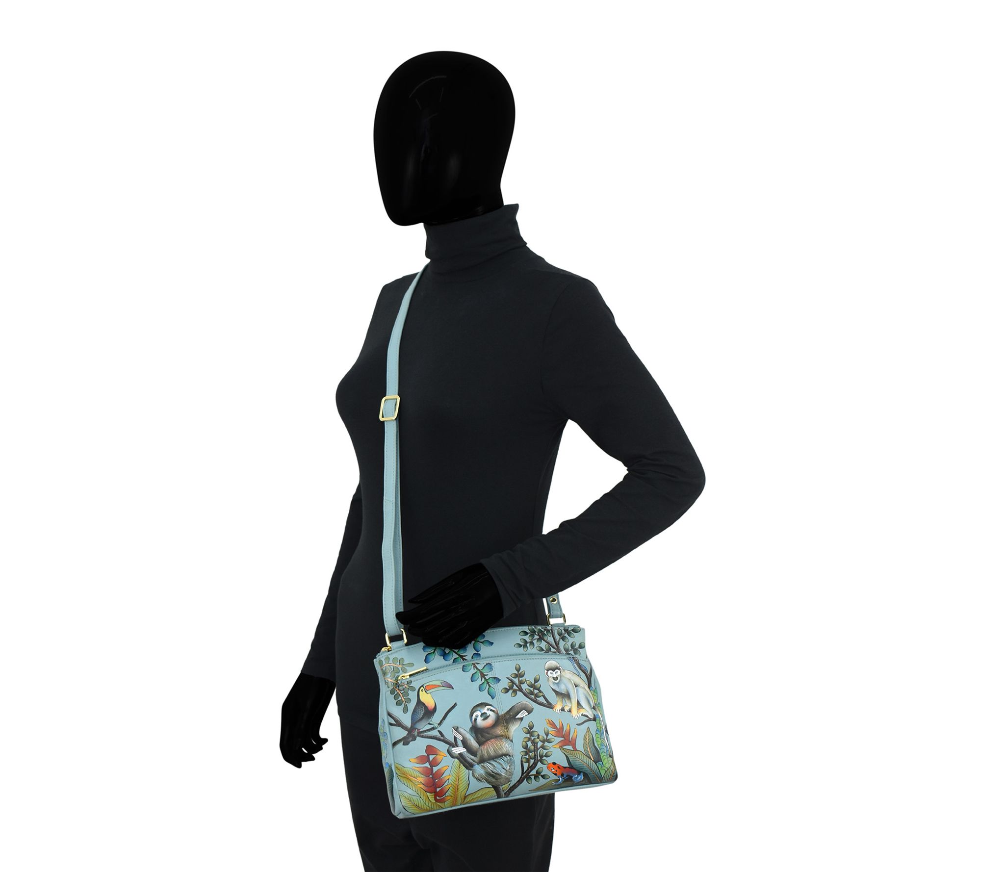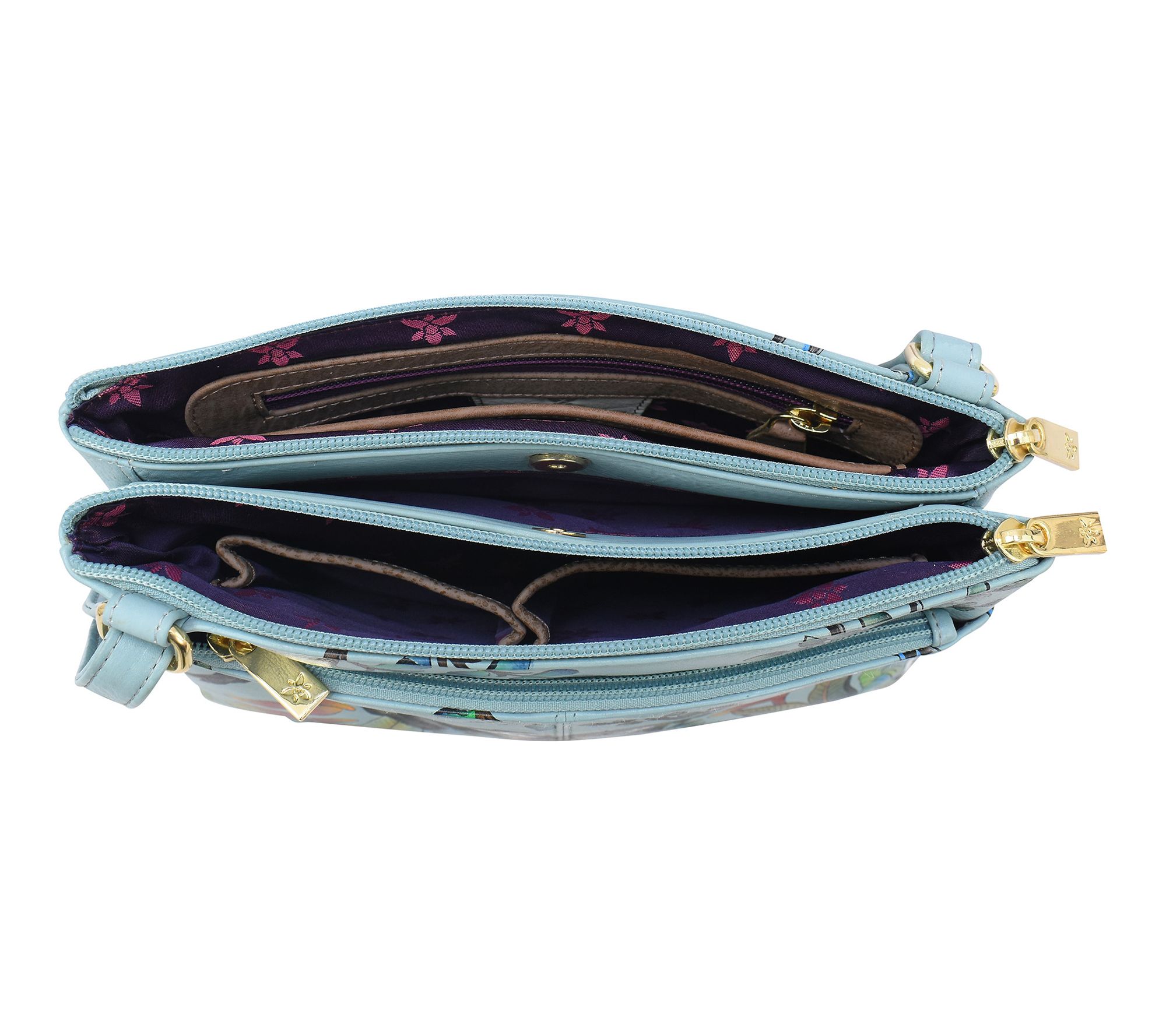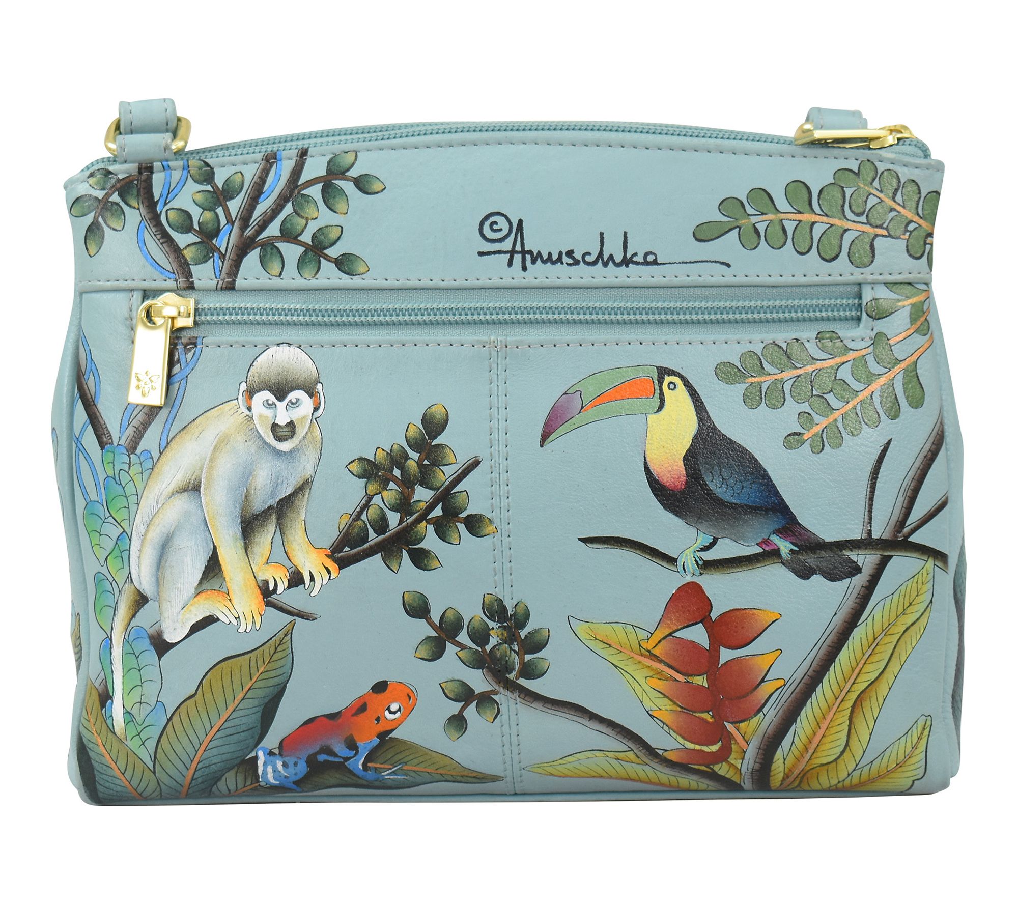 Vibrant artwork transforms this painted leather crossbody organizer into a standout accessory, bringing personality to weekend outings or daily errands. Multiple compartments keep essentials organized, while the hands-free design makes traveling through busy days effortless. From Anuschka.