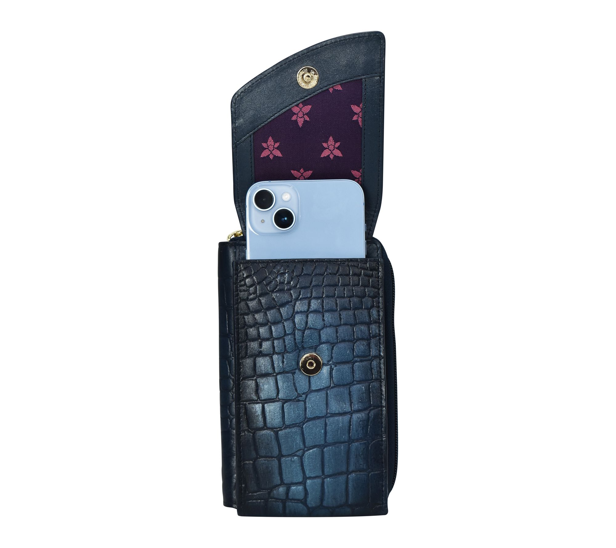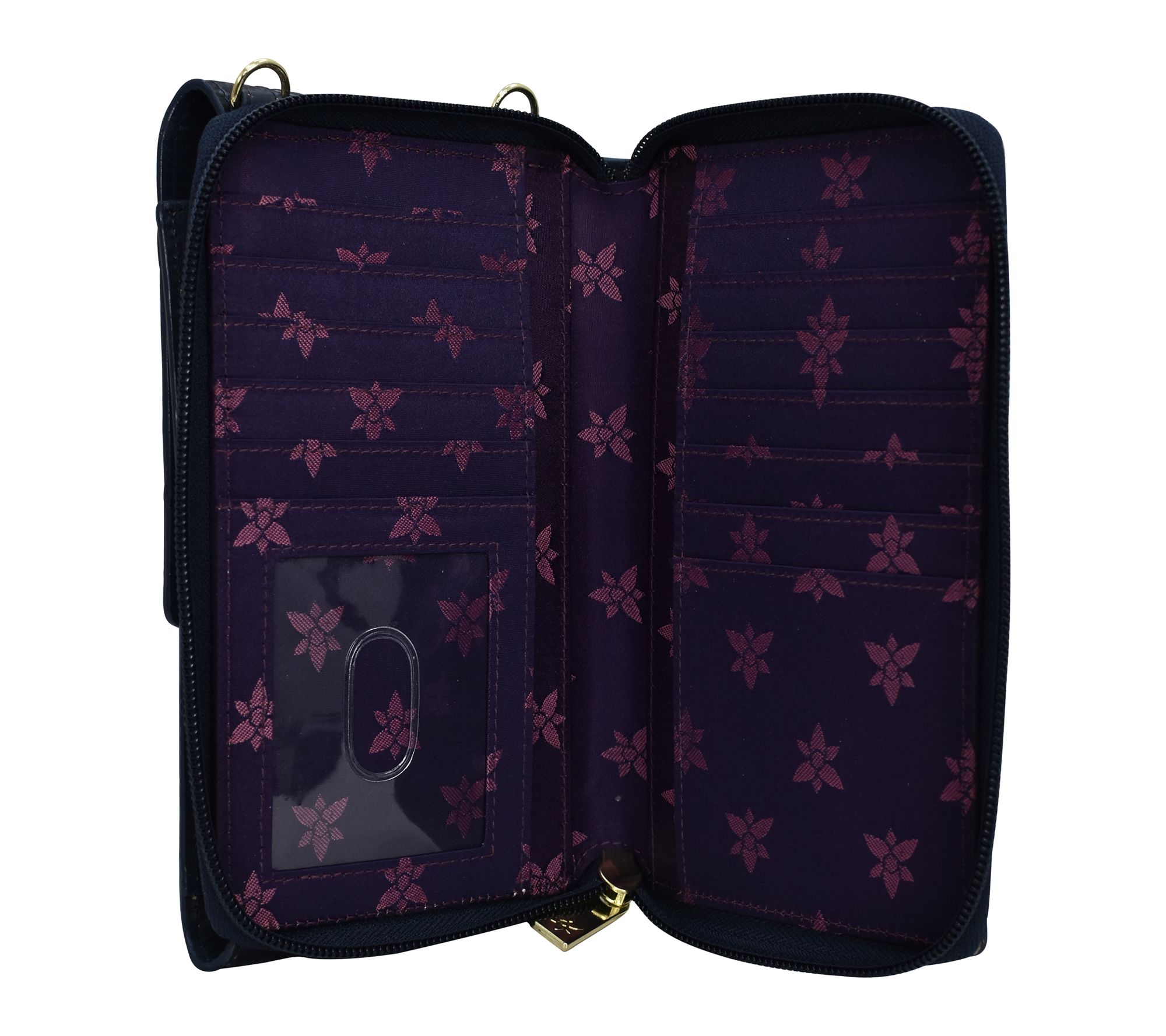 • Front phone compartment with magnetic snap button; button closure; all round zippered organizer compartment