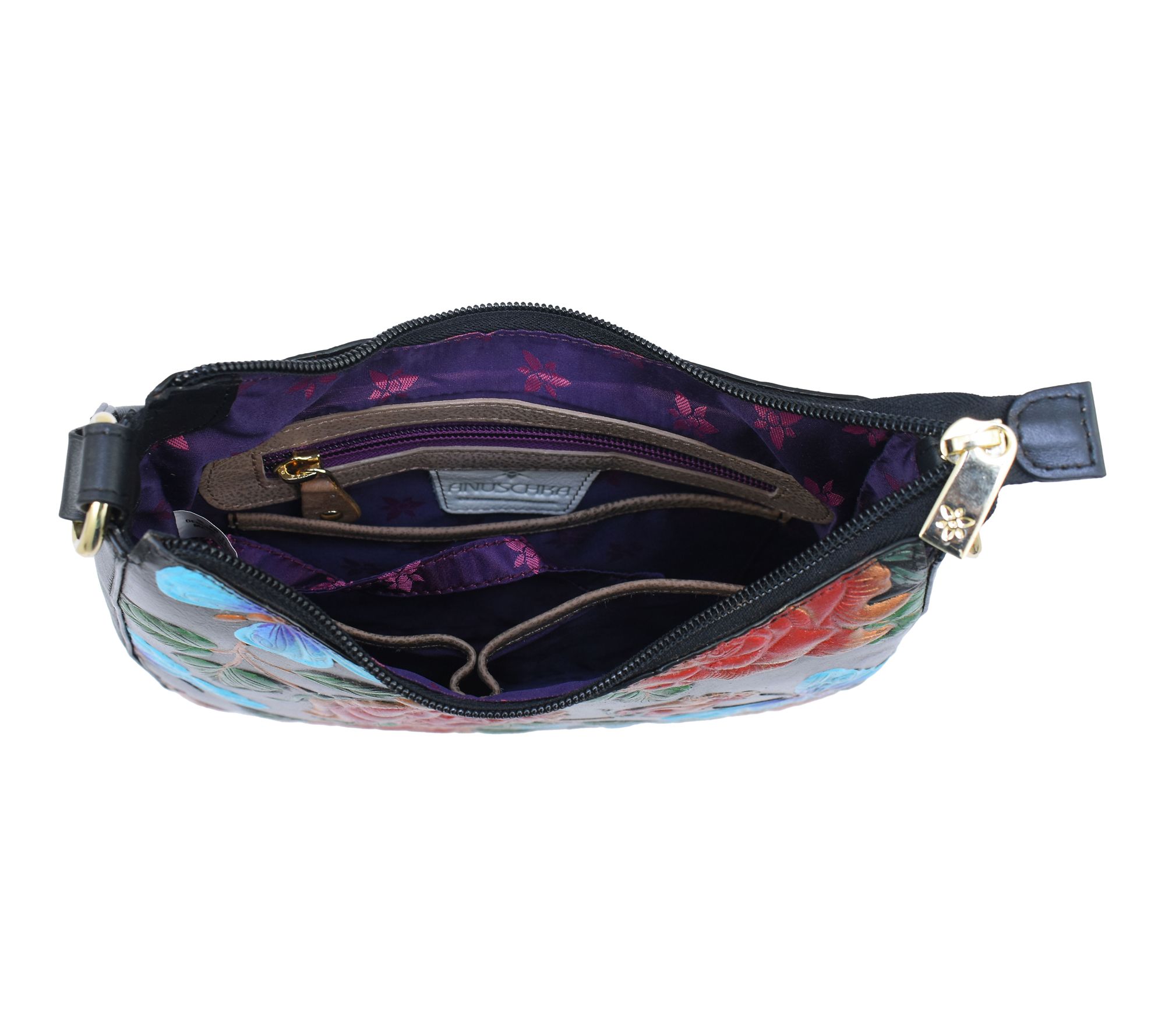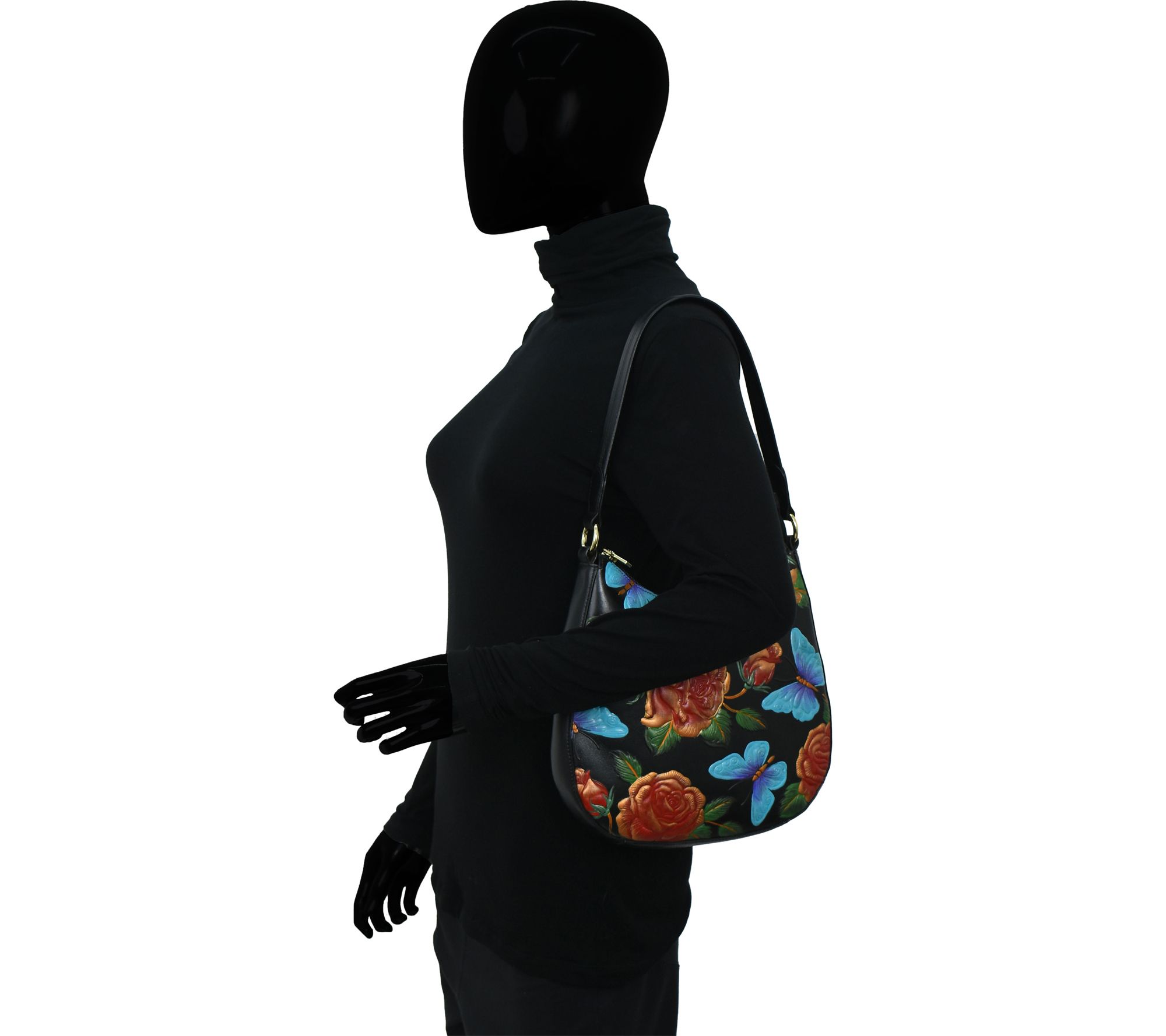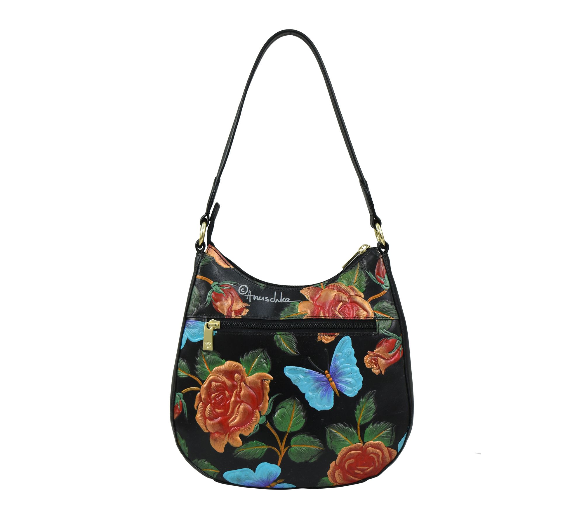 Showcasing vibrant painted designs on luxurious leather, this hobo bag brings color and artistry to your everyday ensembles. With a spacious interior and multiple pockets, it keeps your essentials organized whether you're heading to brunch or tackling errands. The single shoulder handle offers a comfortable fit for all-day wear. From Anuschka.