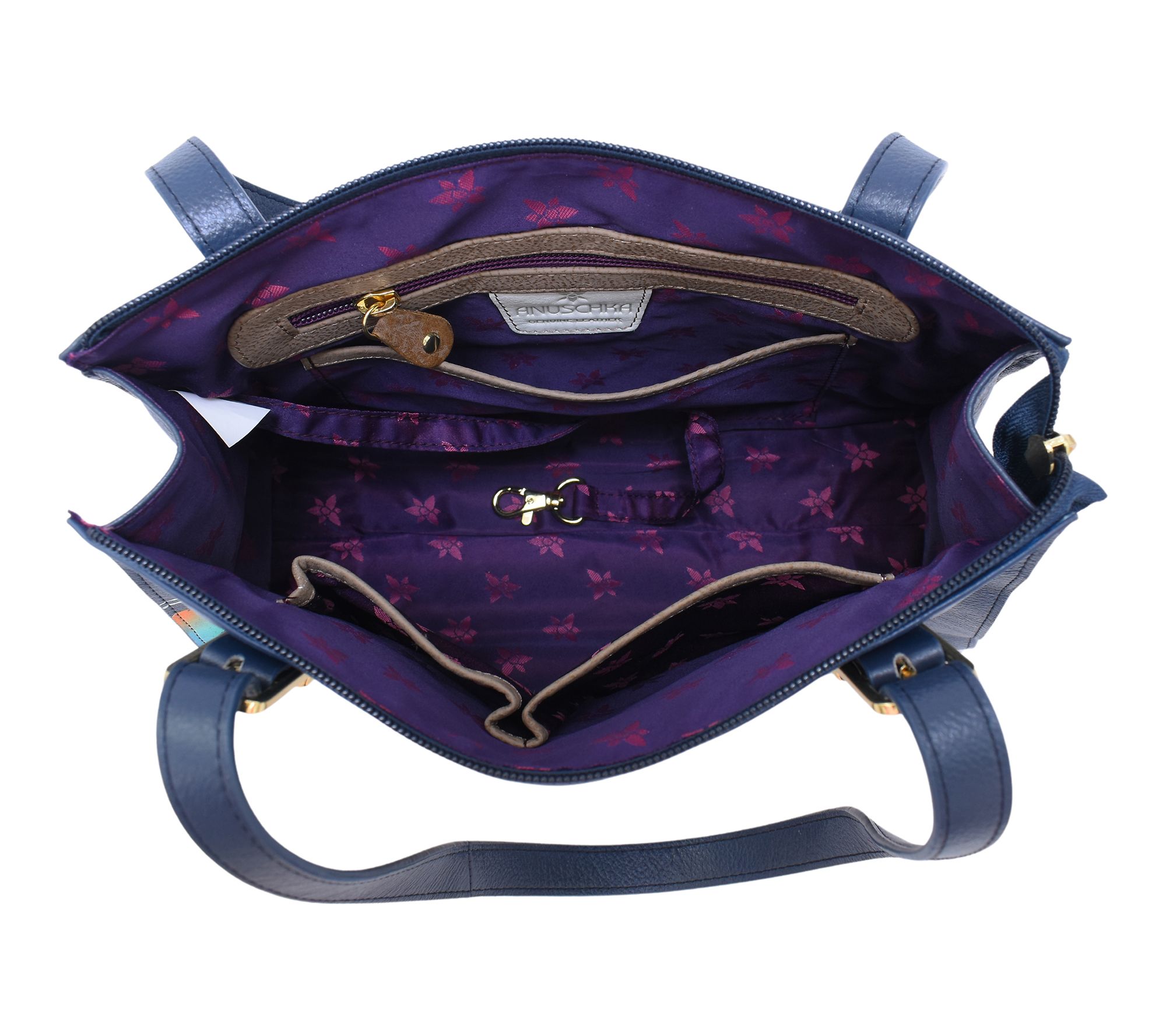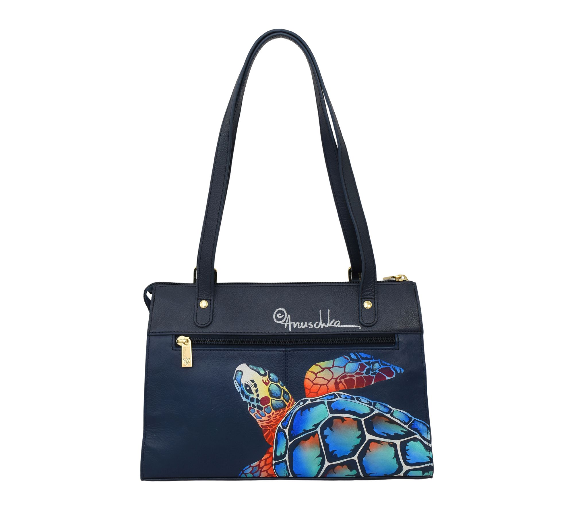 Whether you're heading to brunch with friends or traveling across town, this large shoulder bag stands out with vibrant, hand painted leather. Multiple pockets keep daily essentials organized while double handles offer easy carrying on busy days. From Anuschka.