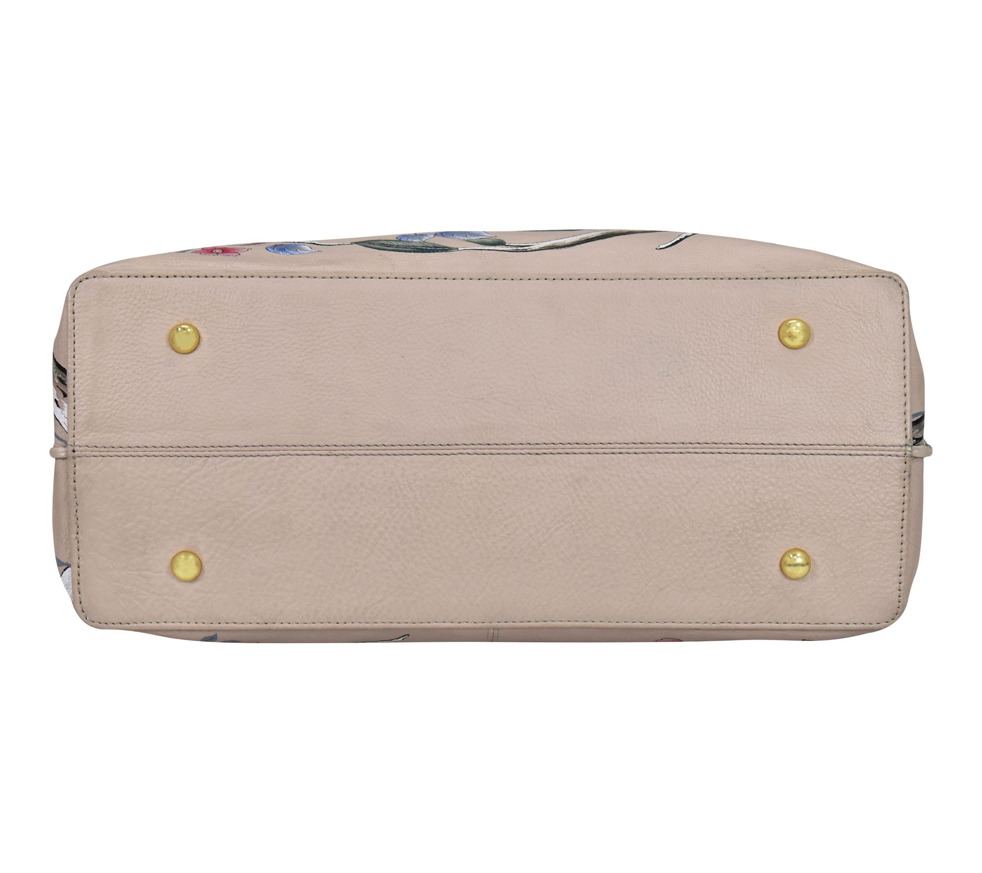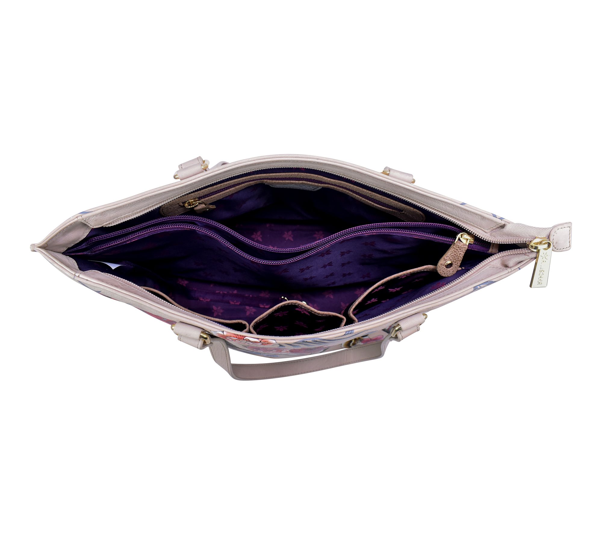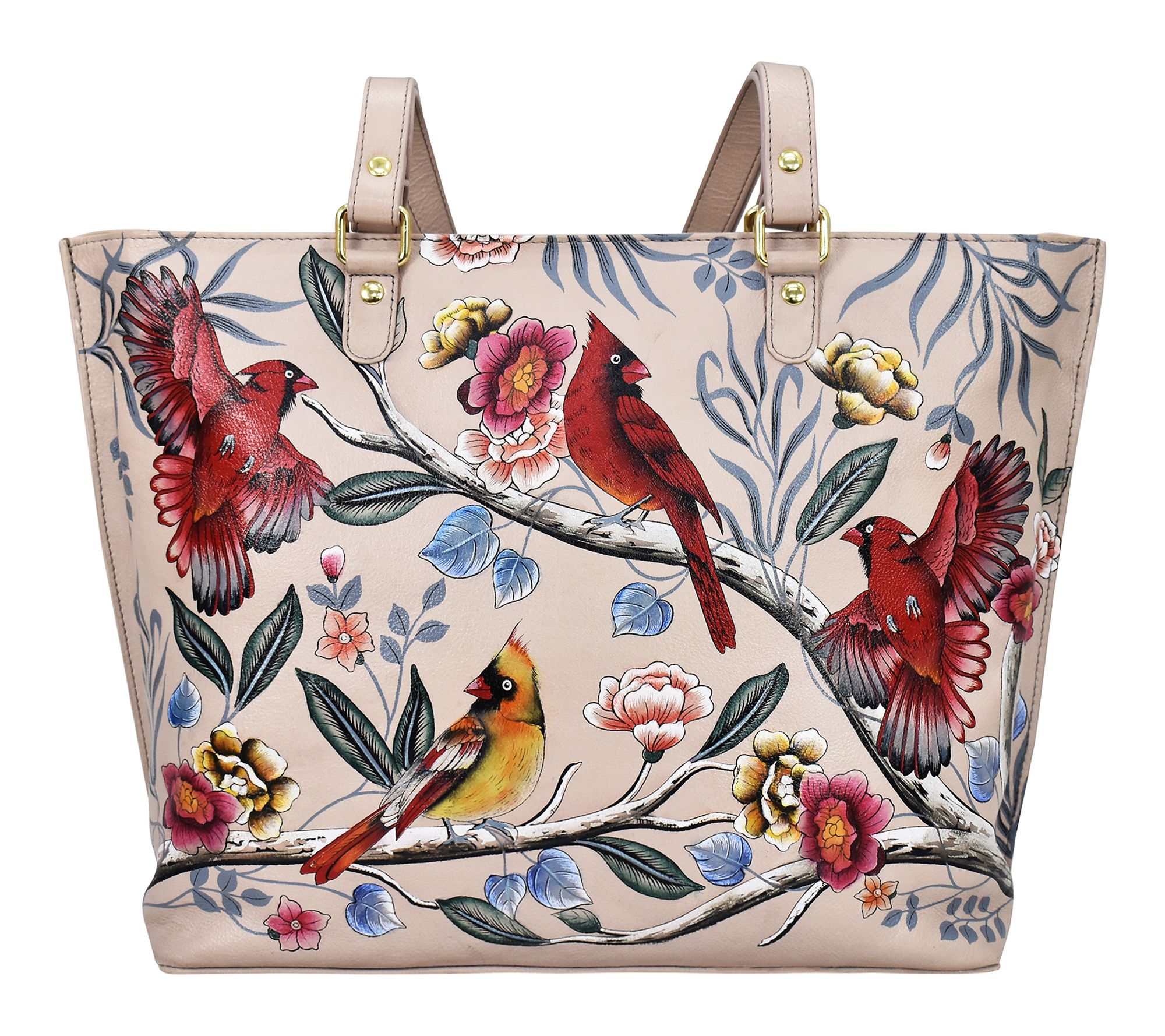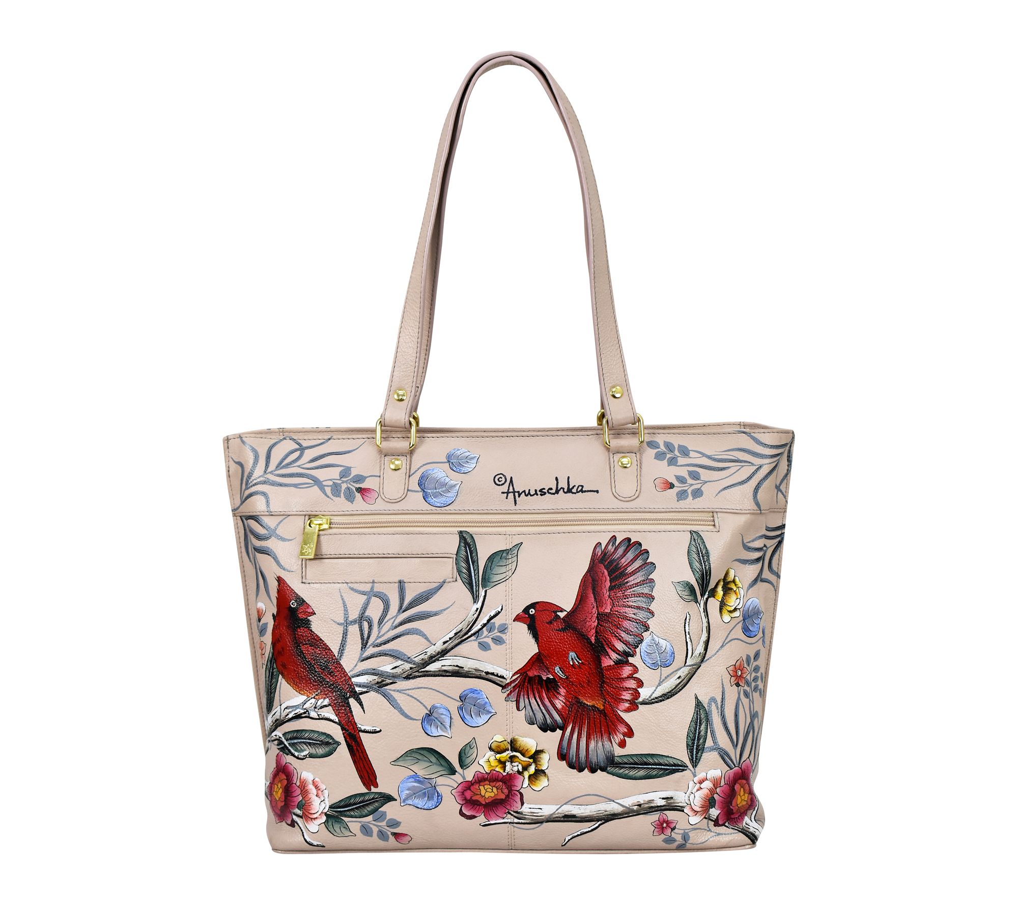 Brighten every day with the artistry and function of this large zip top tote, featuring hand painted original artwork on genuine leather. Spacious enough for your commute or weekend getaway, the sturdy double handles and organized interior make it easy to carry your essentials in style. A dedicated cell pocket keeps your phone close at hand. From Anuschka.