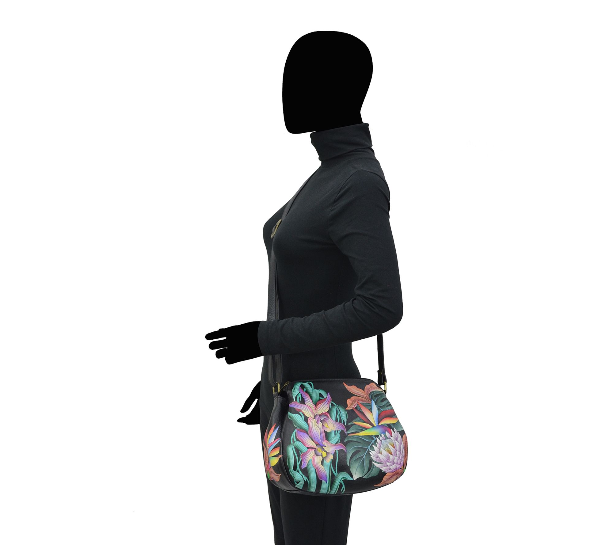 Show off your creative side at brunch or while running errands with this shoulder bag featuring hand painted original artwork. Three open compartments, zippered pockets, and an adjustable crossbody strap keep your essentials organized and easy to reach as you move through your day. From Anuschka.