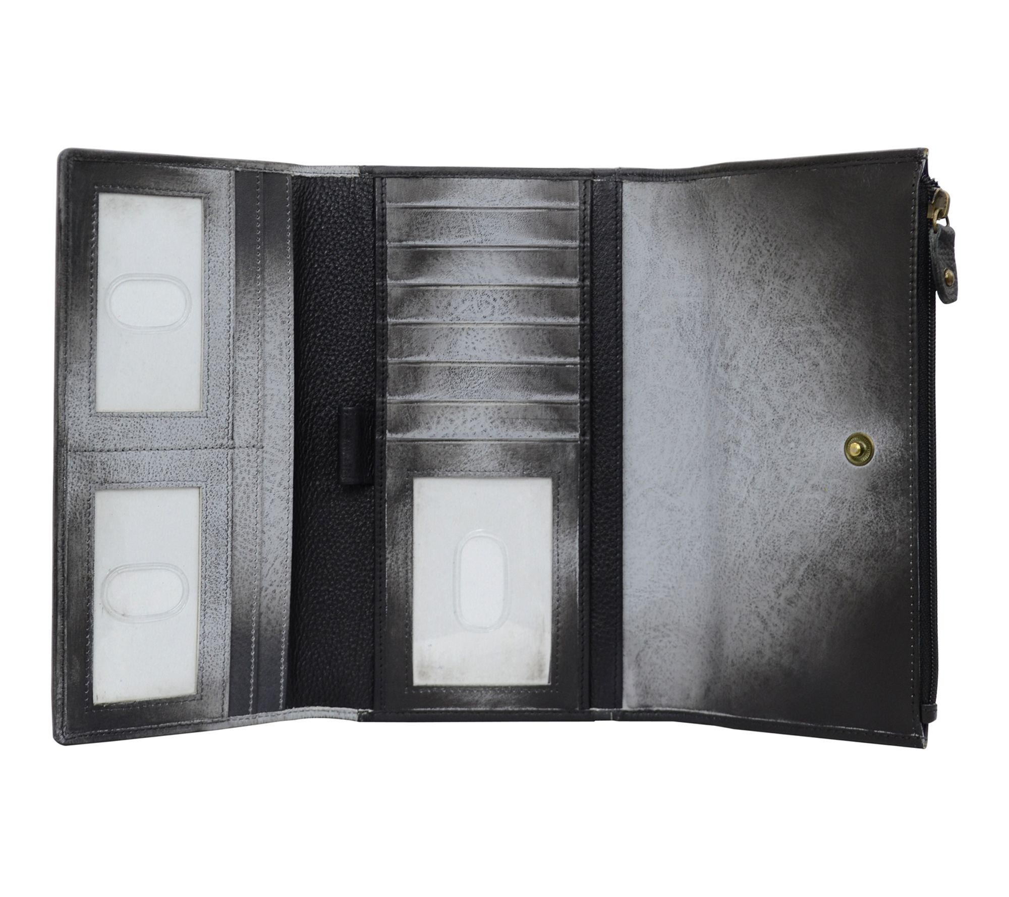 • Inside eight credit card holders, three ID Window, three multipurpose slip in pockets, zippered pocket at edge, rear zippered pocket with gusset