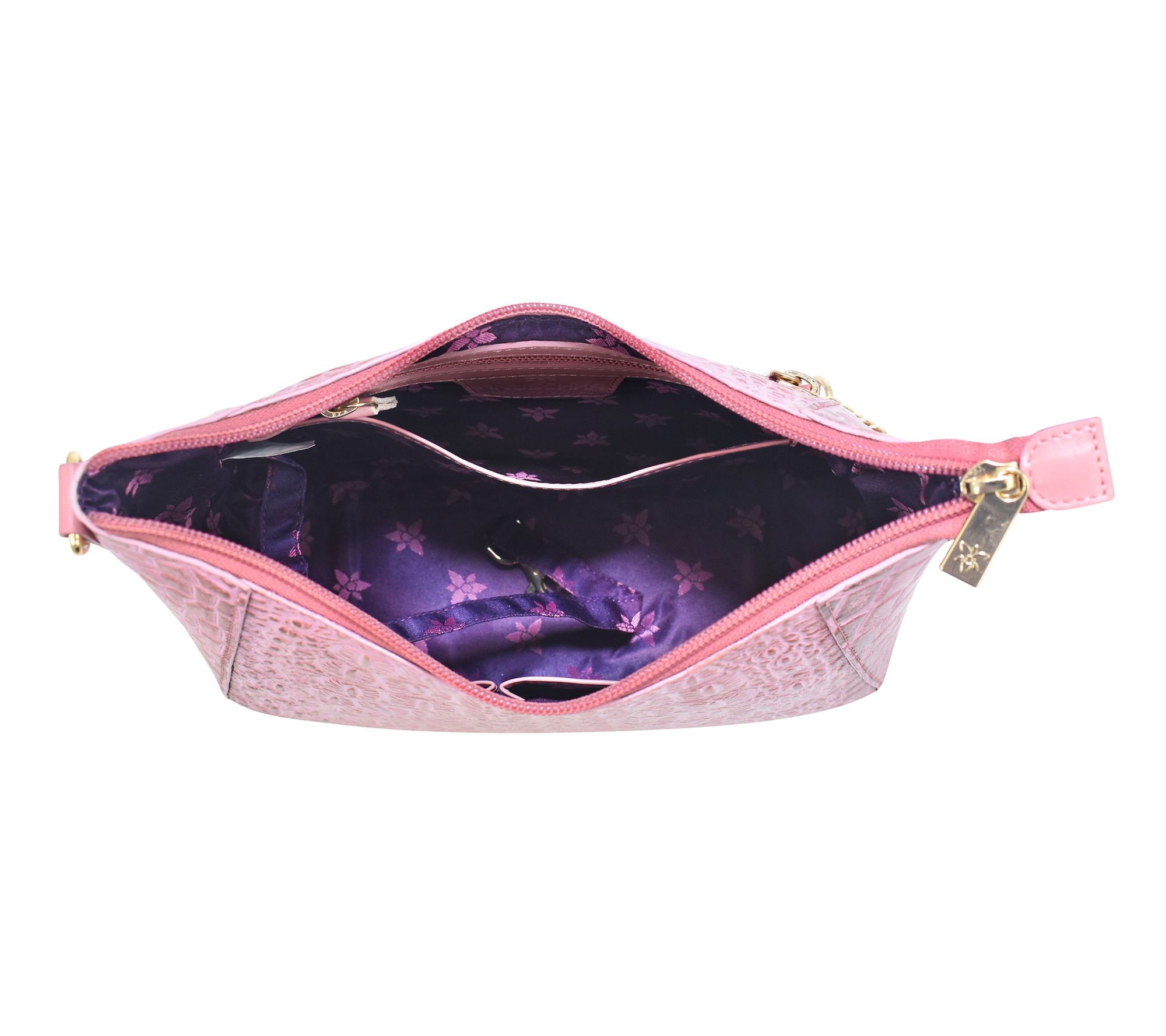 • Painted leather construction; zip-top closure; shoulder strap