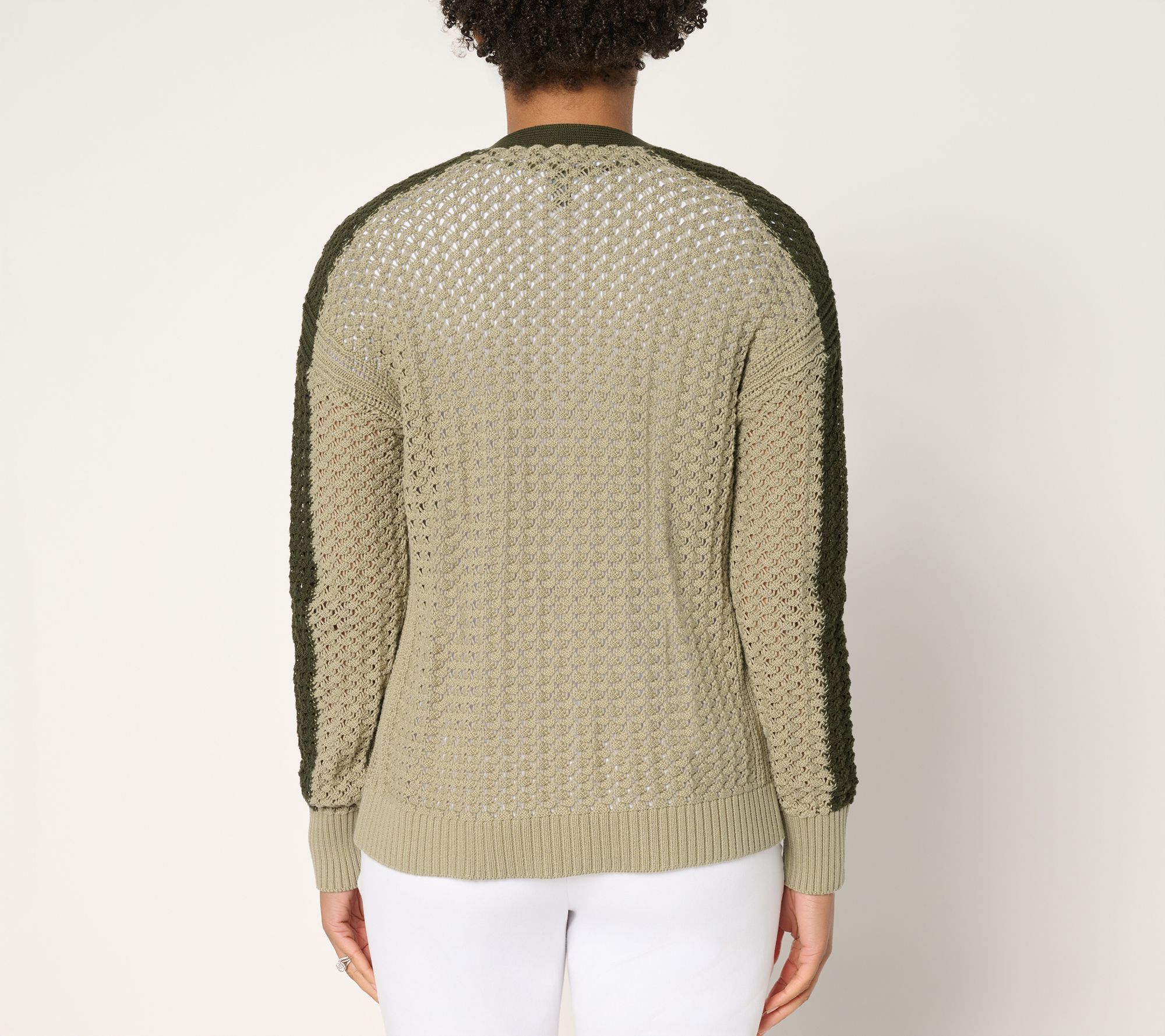 Add a layer of warmth and fashion with this color-block sweater cardigan. A dropped shoulder adds a casual touch, while the button front lets you style it how you like. From AnyBody®.