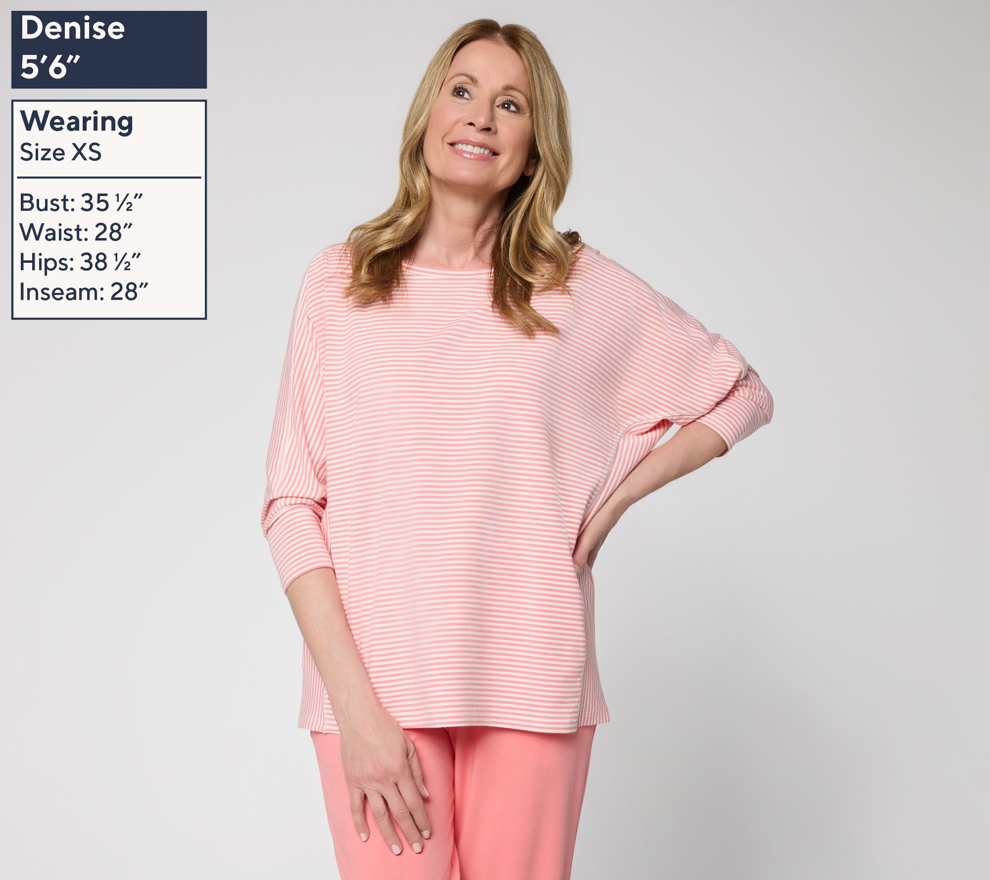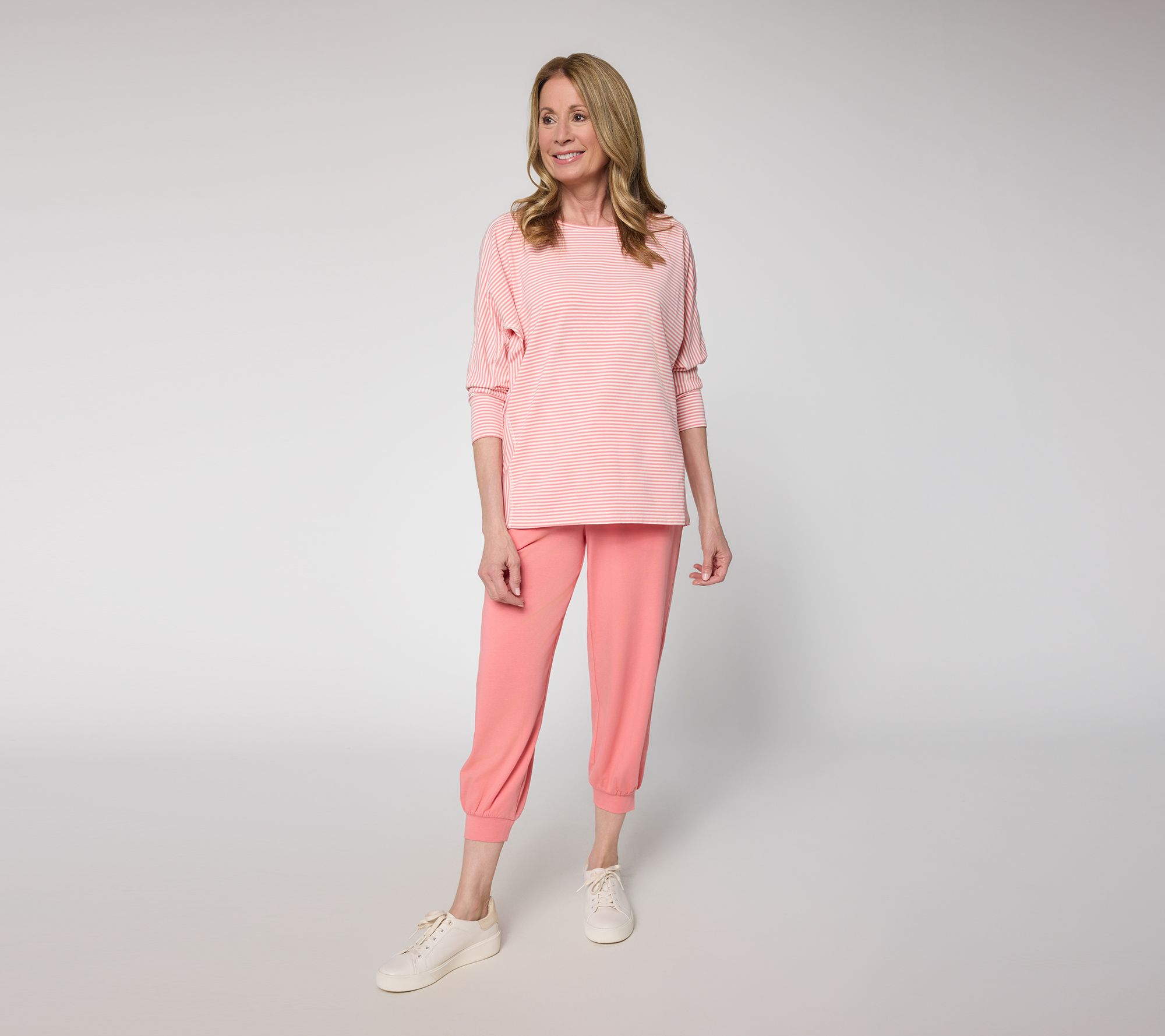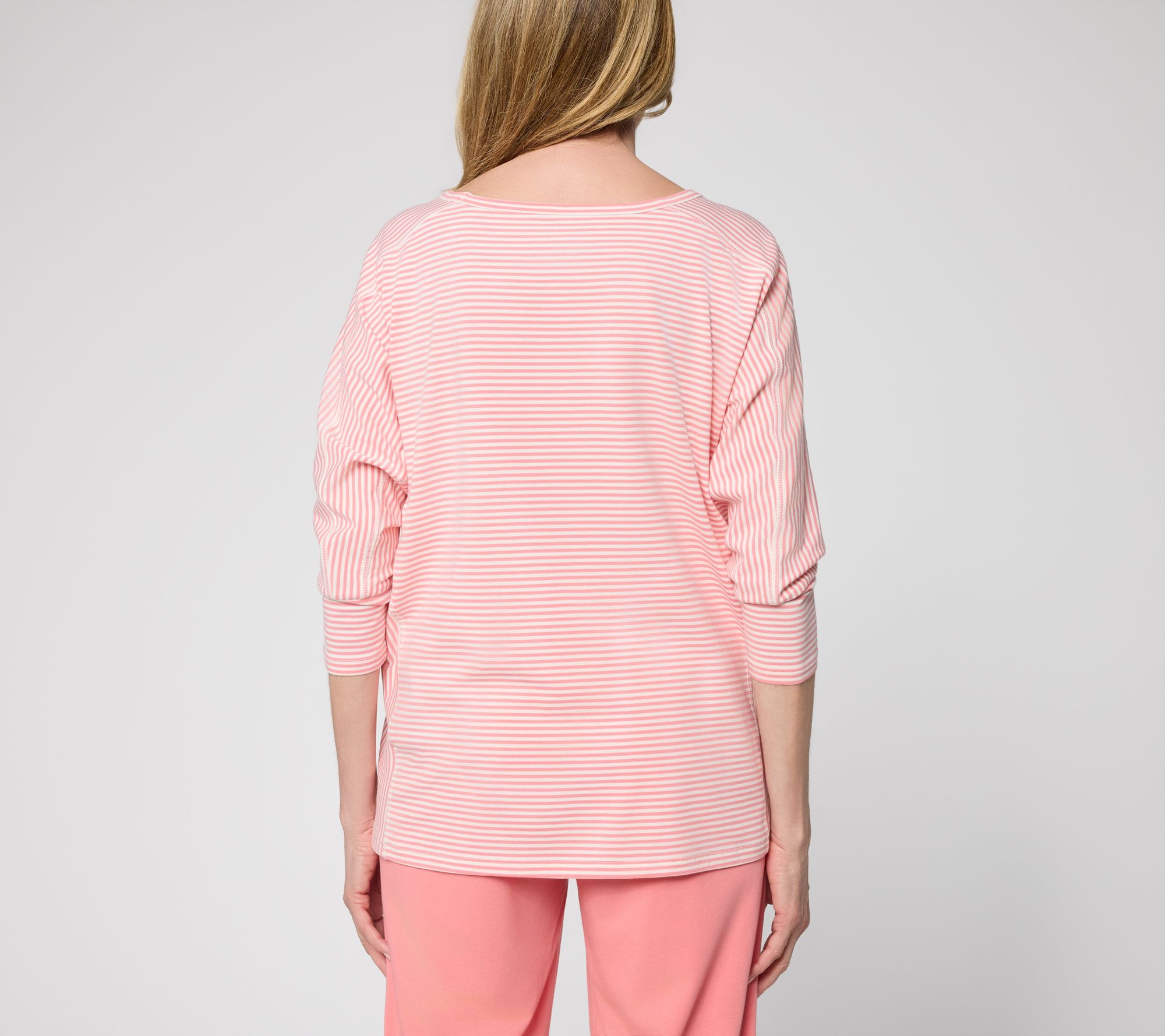 Chilly mornings or breezy nights call for something as cozy as this striped knit top. The relaxed silhouette and dolman sleeves make it a comfortable pick for hanging out at home or meeting up with friends, while the soft jersey fabrication moves with you throughout the day. From AnyBody®.