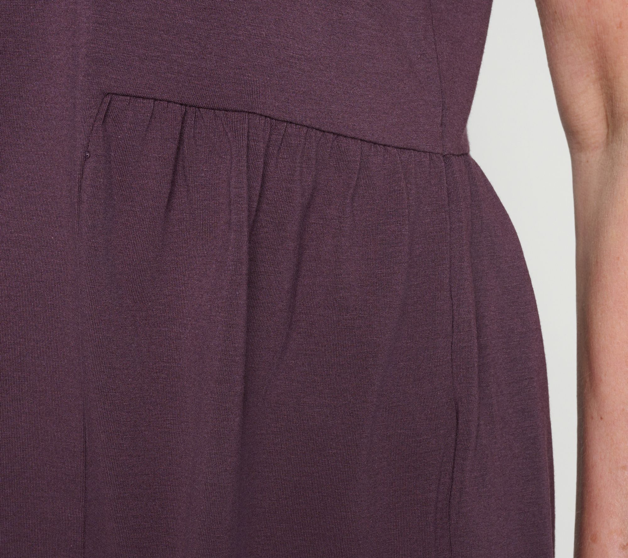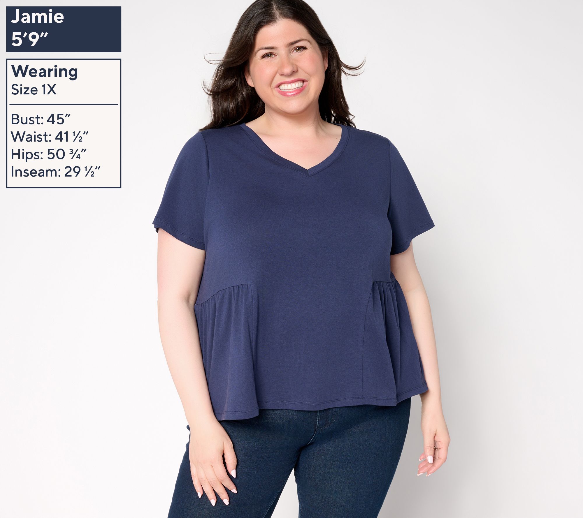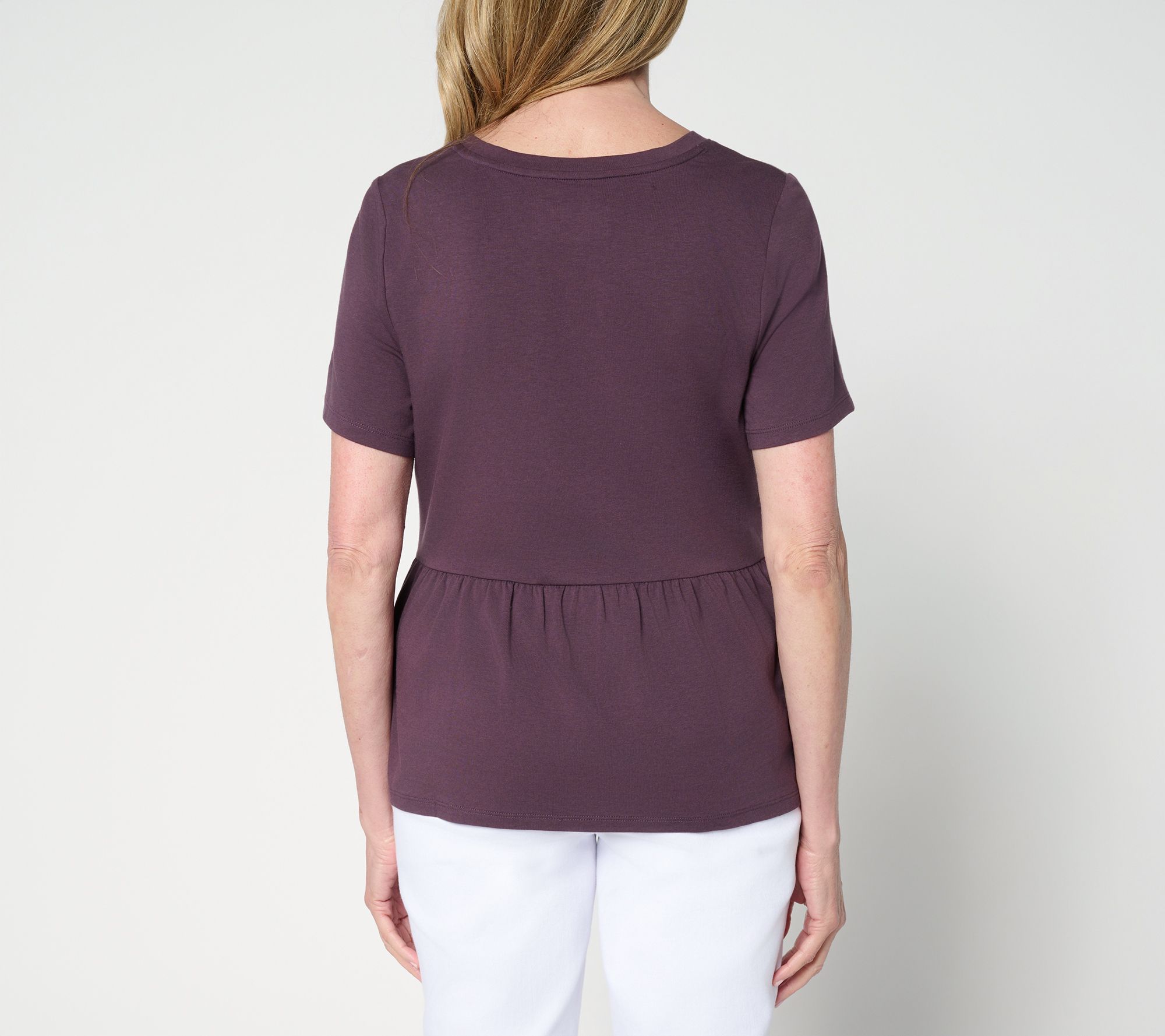 Think beyond the basic tee. With an easy shirred peplum, this Cozy KnitTM jersey top creates a playful, feminine silhouette that's easy to pair with denim or leggings for everyday errands, brunch, or lounging at home. From AnyBody®.