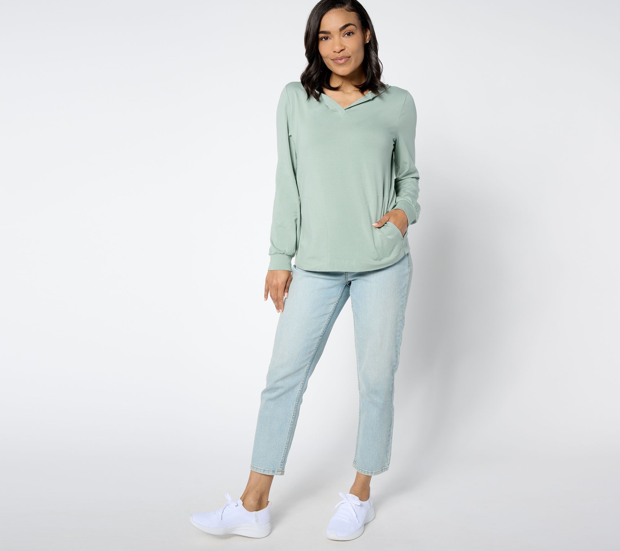 Cozy, comfy, and oh-so cute, this knit top is fashioned with a hood, V-neckline, and long sleeves. The relaxed fit makes it ideal for weekend lounging. From AnyBody®.