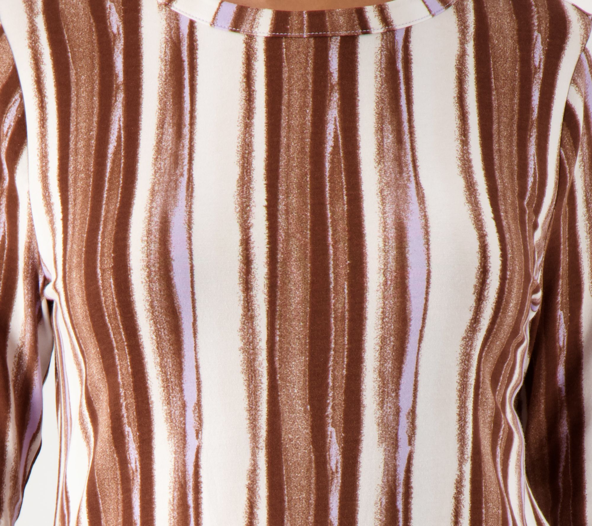Features: allover stripe pattern, crew neckline with wide binding, long sleeves, slightly curved bottom hem
