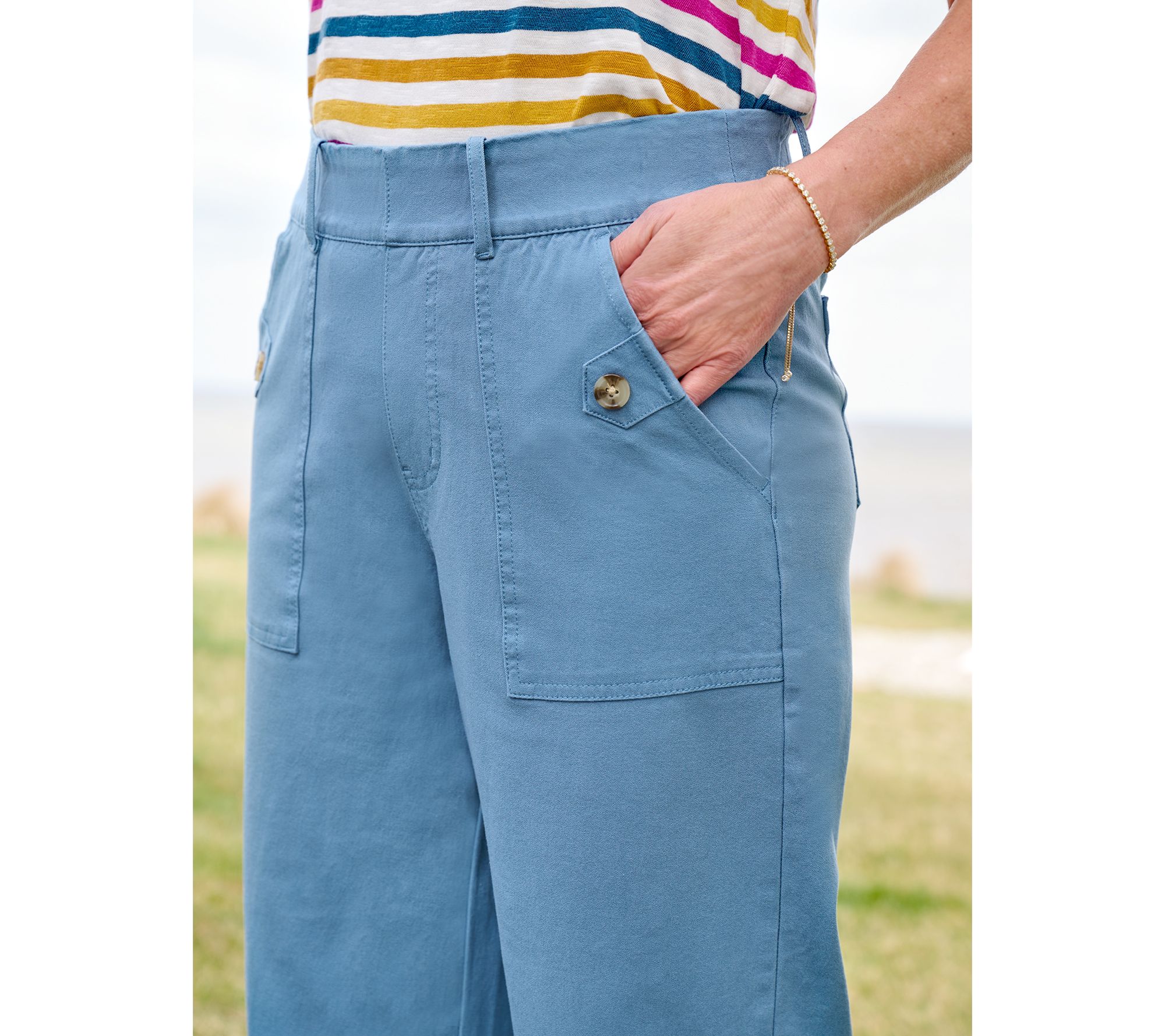 Not too long, not too short -- these cropped pants are just right for summer, and maybe even a warm-weather vacation this winter. You're going to adore the stretch twill fabrication that's supremely soft and oh-so comfy. And did you see those belt loops, the faux fly, and the button tabs on the pockets? You'll find tucking in your favorite tanks, tees, and sweaters is easy and effortless with a flat front elastic waistband!