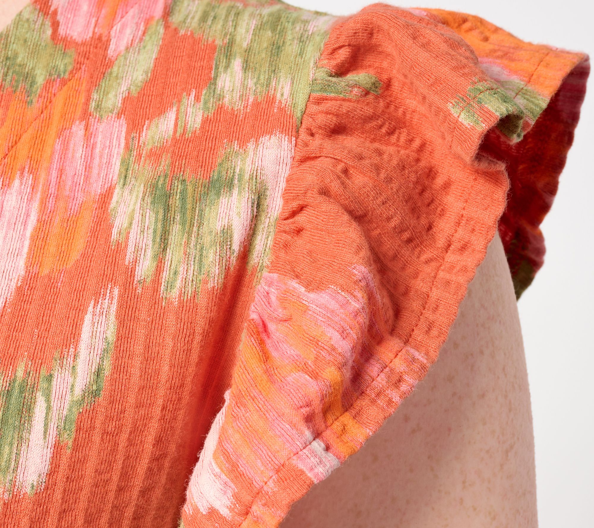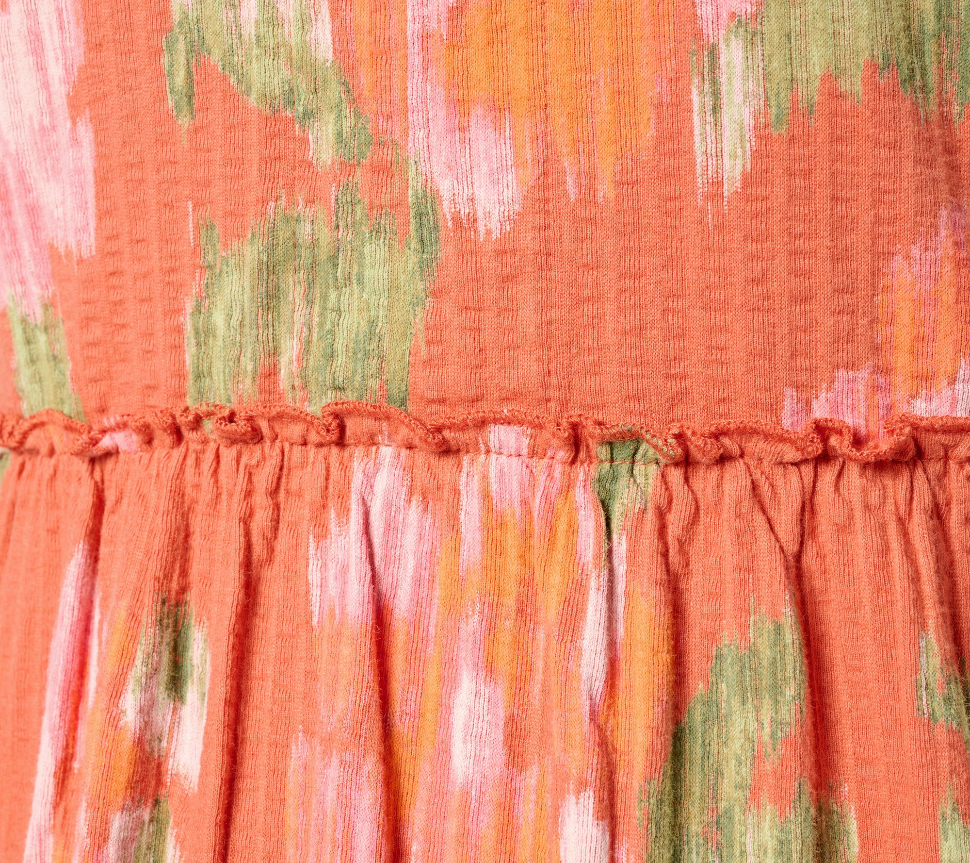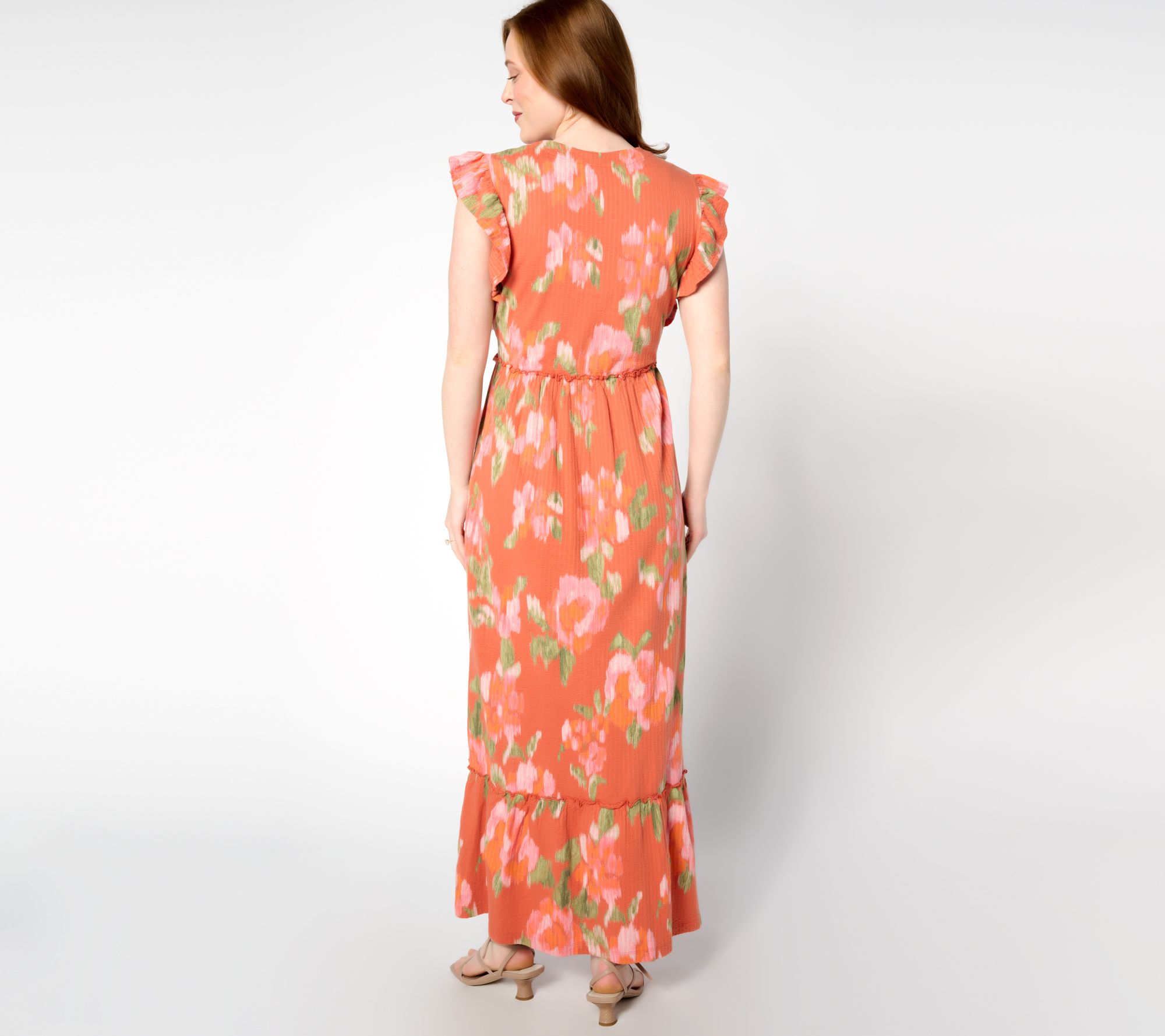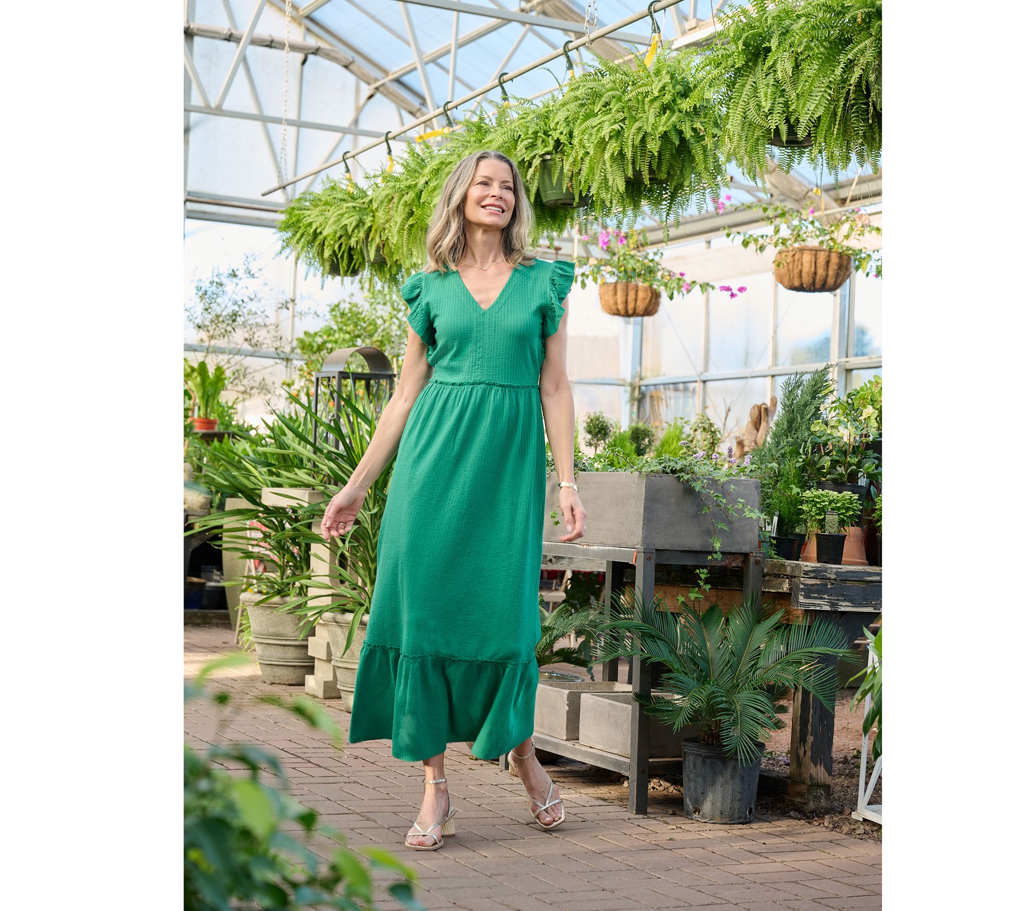 Features: V-neckline, flutter sleeves, waist seam with shirring and back elastic, tiered hem bottom with shirring, maxi length