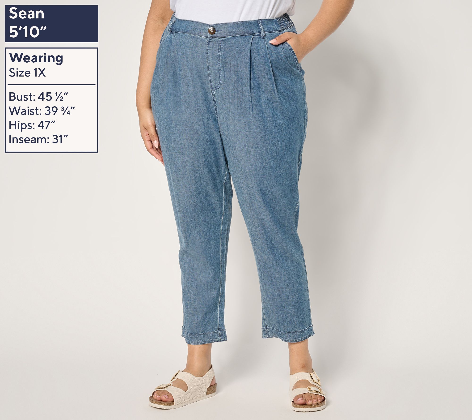 Drapey denim -- who knew? When true denim is too heavyweight and shorts or skirts are not in your sights, these tapered ankle pants come in clutch with a polished presence and lyocell-rich fabric that drapes like a dream, yet still nails a casual laid-back vibe. Pull them on and pull off two aesthetics at once. From AnyBody®.