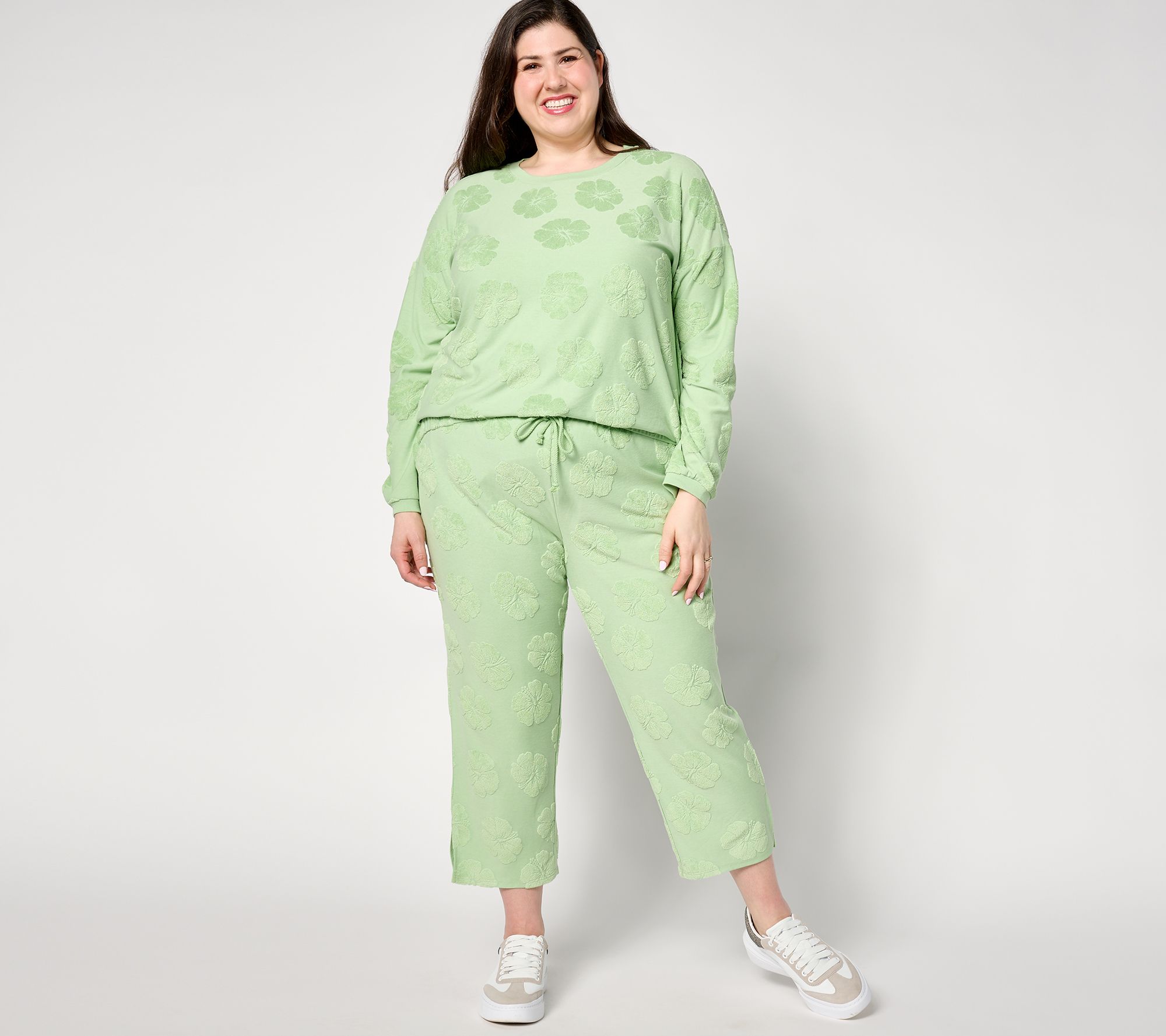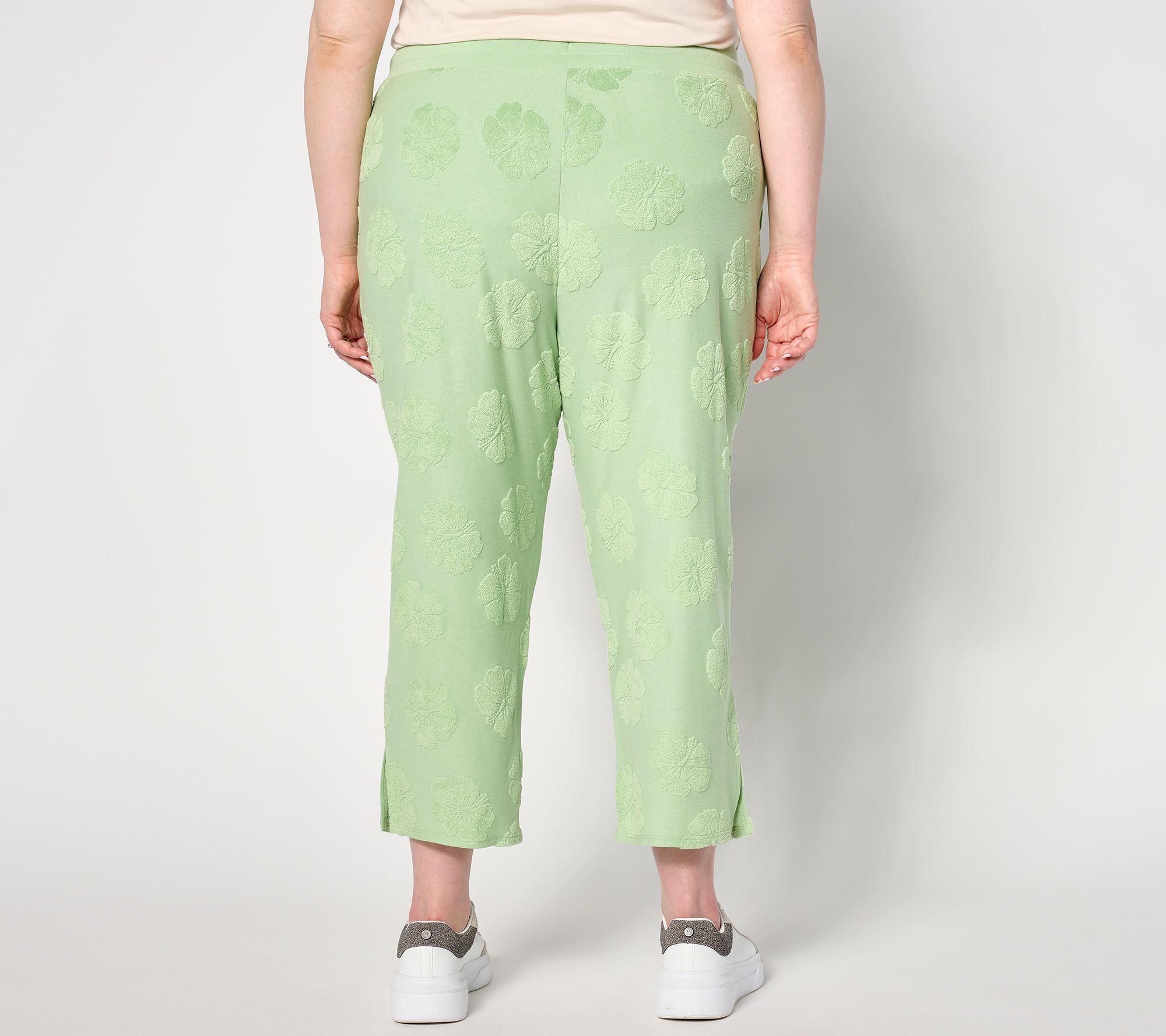You'll always be in a vacay state of mind whenever you slip into these tropical-inspired terry hibiscus cropped pants. No carry-on required. From AnyBody®.