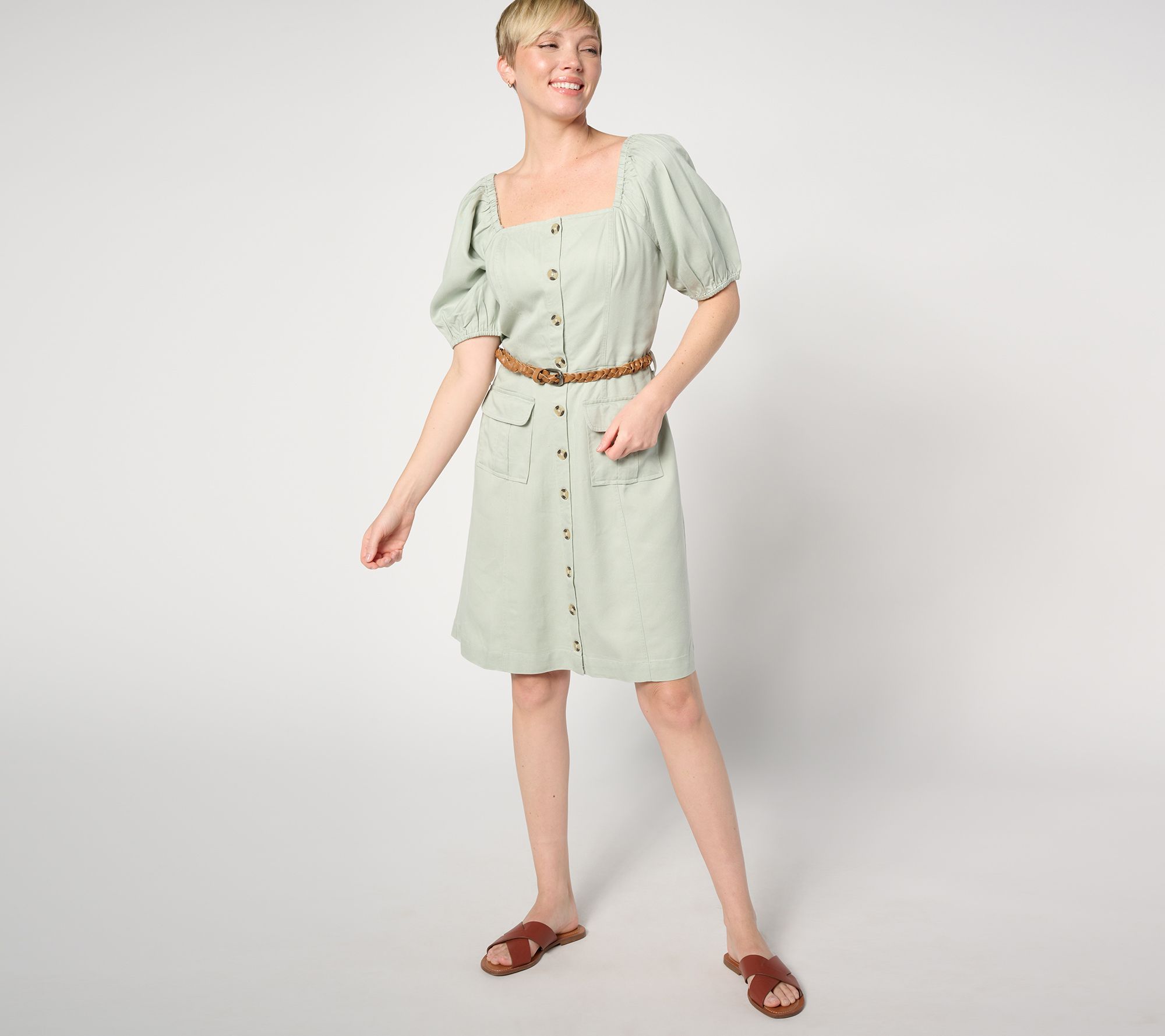 Flattering, fashionable, and oh-so cute, this belted cargo dress is designed with puff sleeves, a square neckline, and a button front. From AnyBody® Lounge and Sleepwear.
