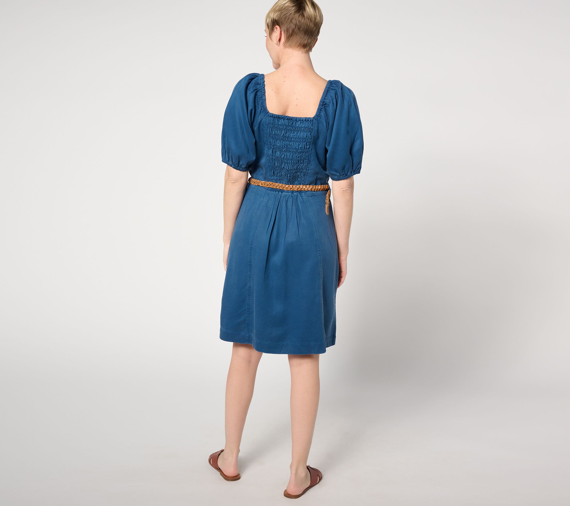 Features: puff sleeves, belted, square neckline, tunneled elastic at back bodice, shirring along sleeve caps, tunneled elastic sleeve cuffs, smocked back bodice, princess seams at front and back, applied patch cargo pocket, button front closure