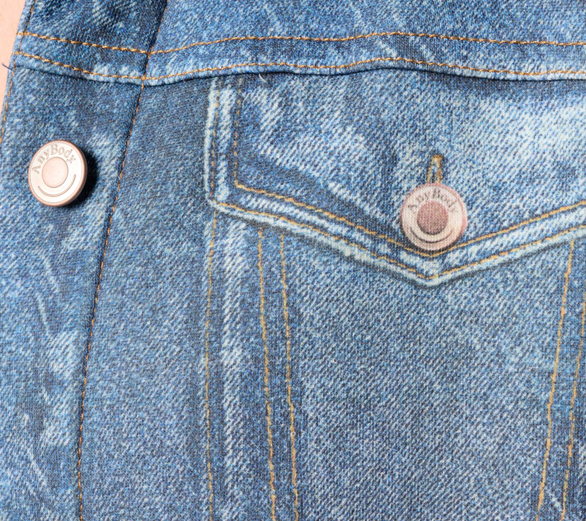 Features: collar, button-front closure, digitally printed on the outside to look like denim