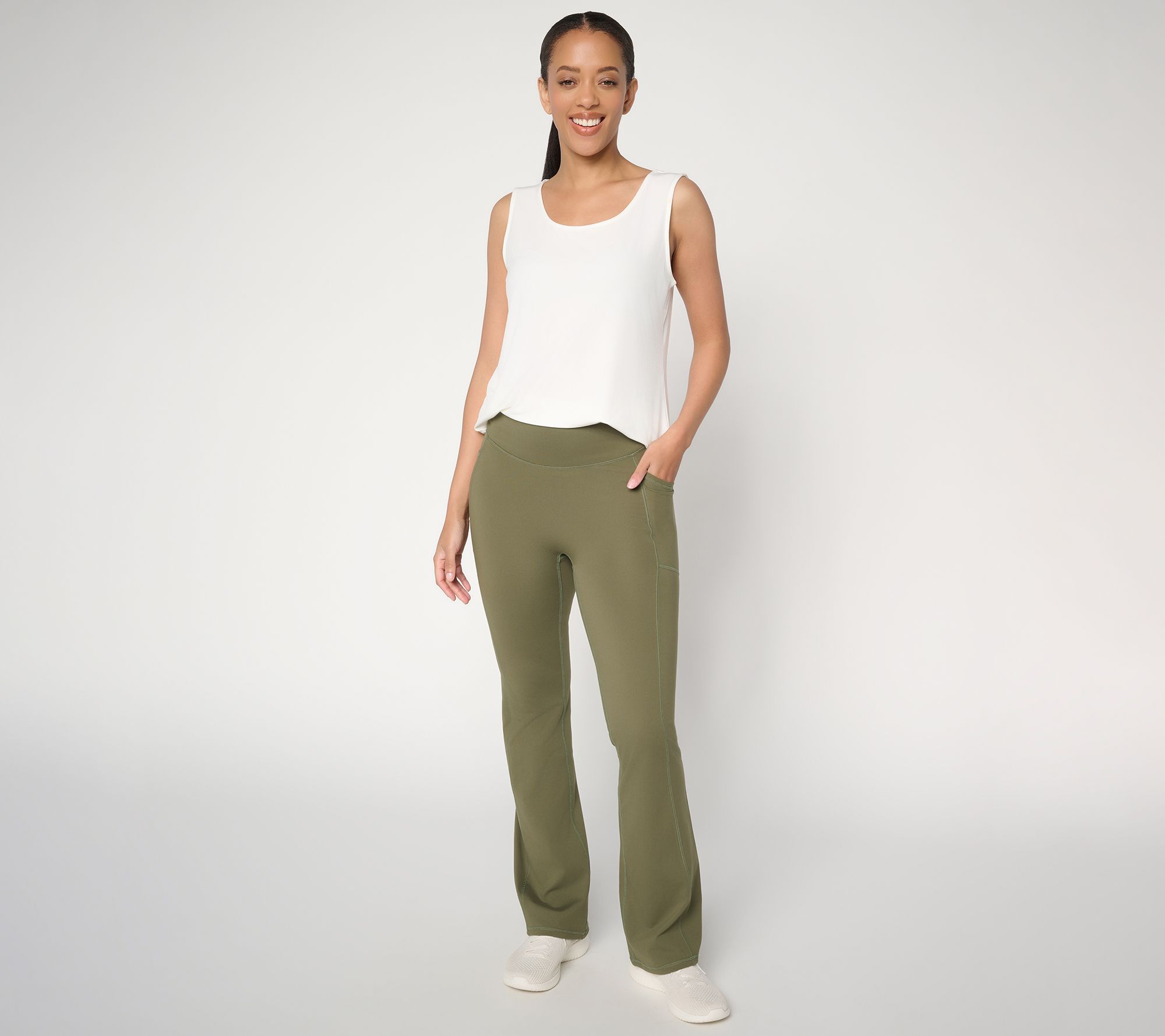 Scrolling for serious comfort? Found! Whether your day calls for quick errands or catching up with friends over coffee, these knit bootcut leggings move with you thanks to a soft peached finish and stretchy comfort. The fitted silhouette and full-length leg lend an elongated, flattering look. From AnyBody®.
