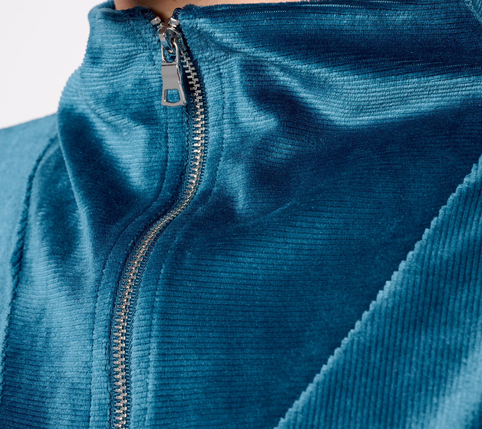 Features: set-in yoke with horizontal self funnel neck with zipper closure, set-in long sleeves with self cuff, straight bottom hem