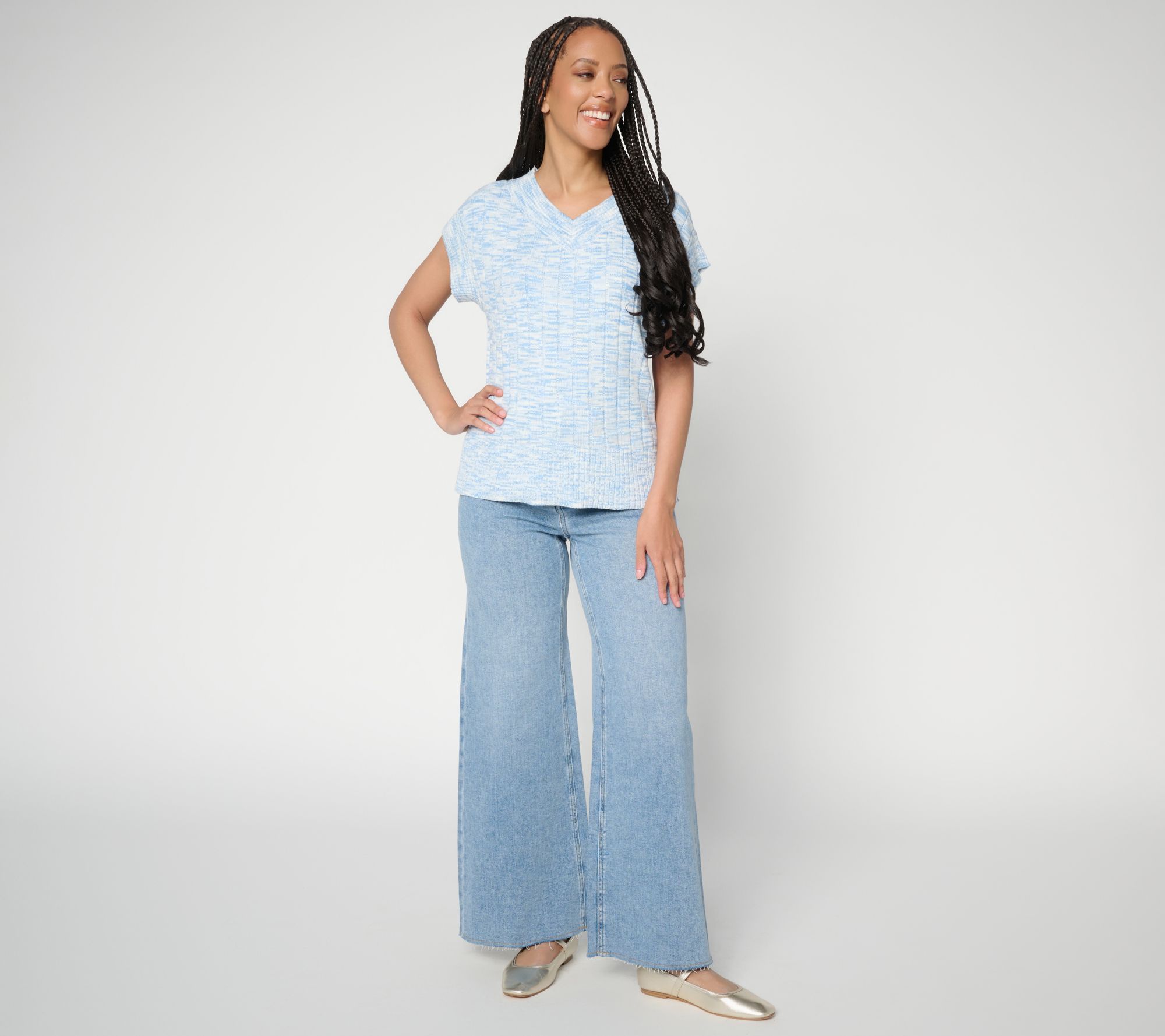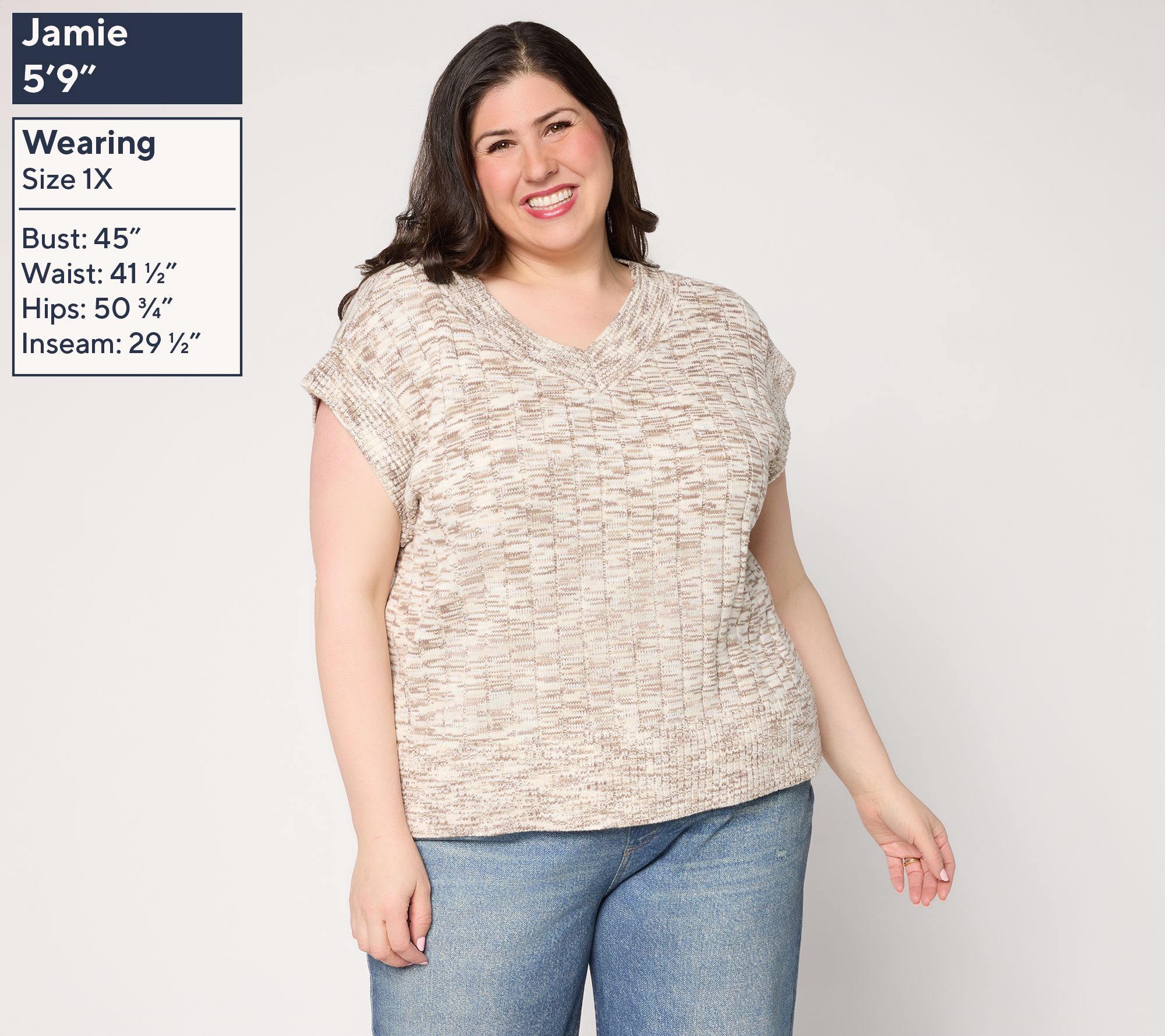 Now arriving: your summer sweater go-to. Space dyed for eye-catching interest, this lightweight V-neck features cap sleeves for a breezy bit of arm coverage while the cotton-rich knit secures its place in your top rotation with contrasting rib details. From AnyBody®.