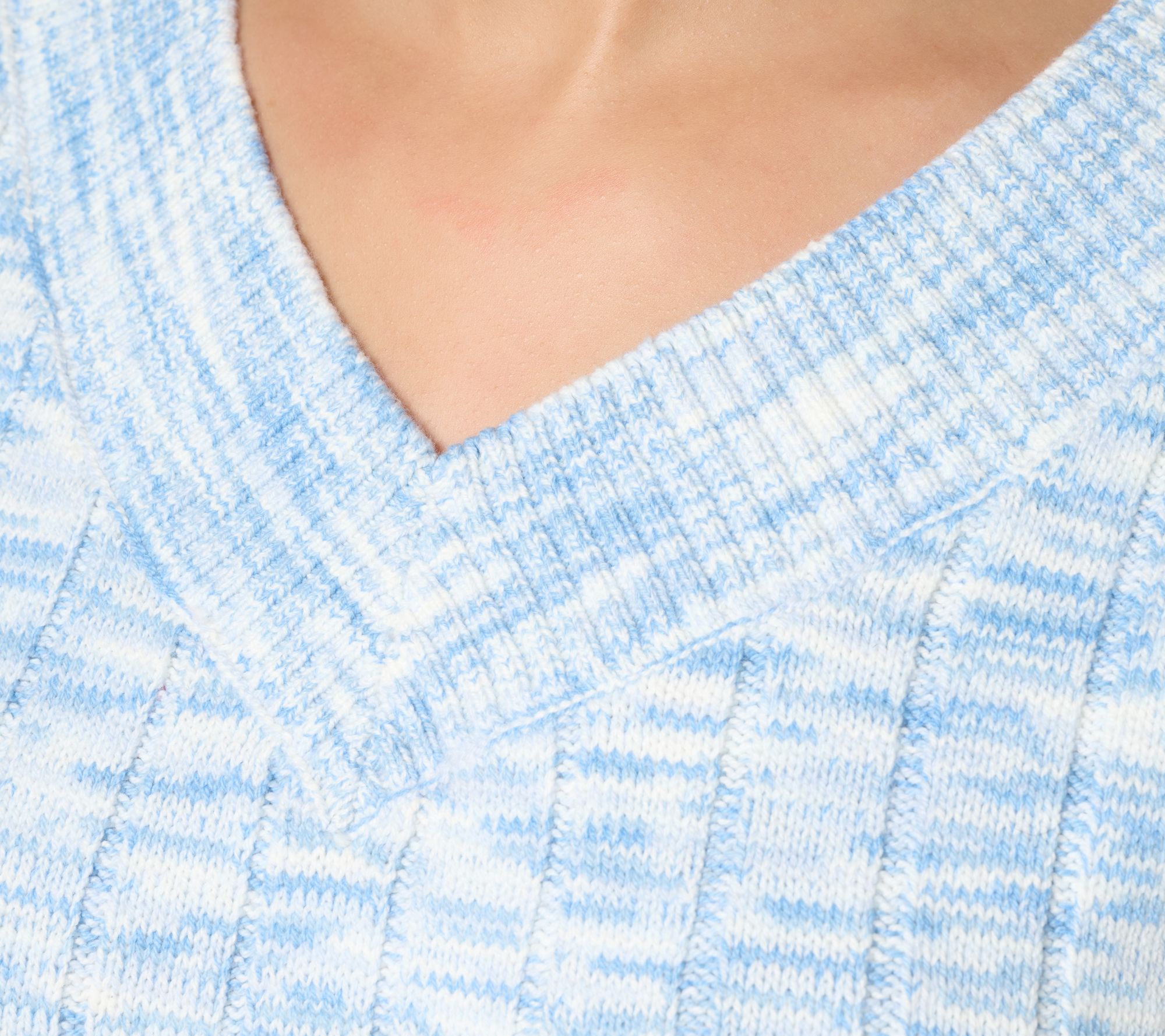 Features: V-neckline, space dye, wide ribbed detatil on front and back, smaller ribbed detail on hem, neckline, and cap sleeves