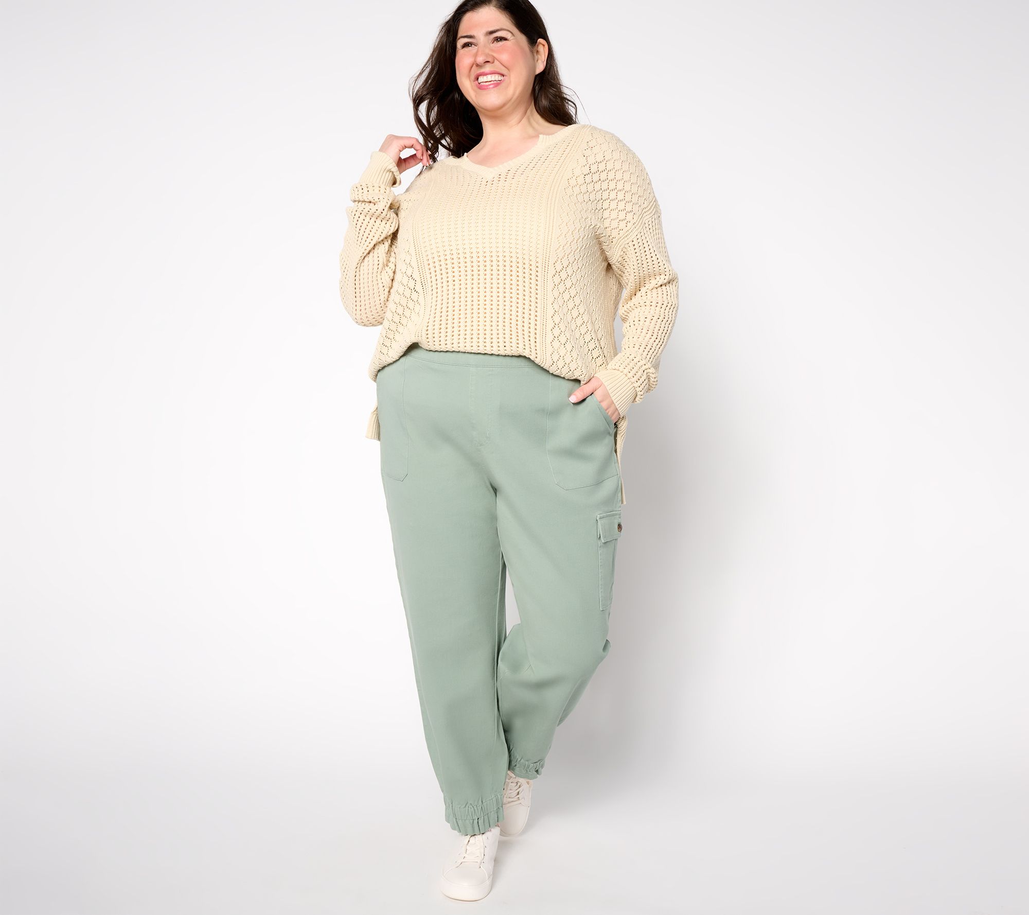 If there's one trend-fresh find you'll be adding to your closet this season, make it cargo! These twill pants feature an updated version of the much-loved side-pocket style -- turn your attention to the elastic gathering at the bottom ankle. The look leaves plenty of room to show off your new tennies, booties, or shooties! From AnyBody®.
