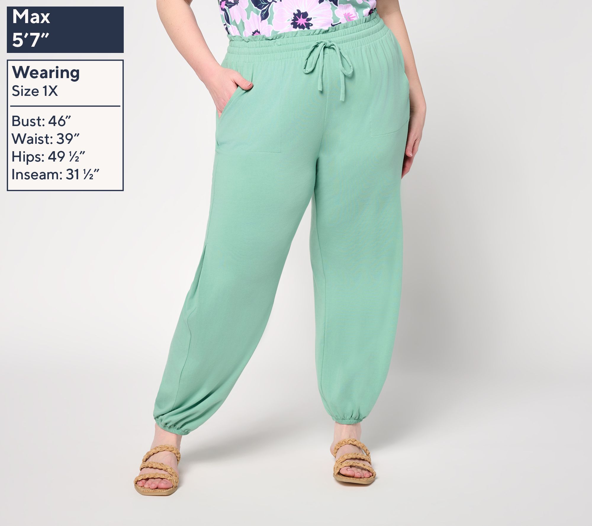 Features: pleated side seam, ankle length, jogger bottom