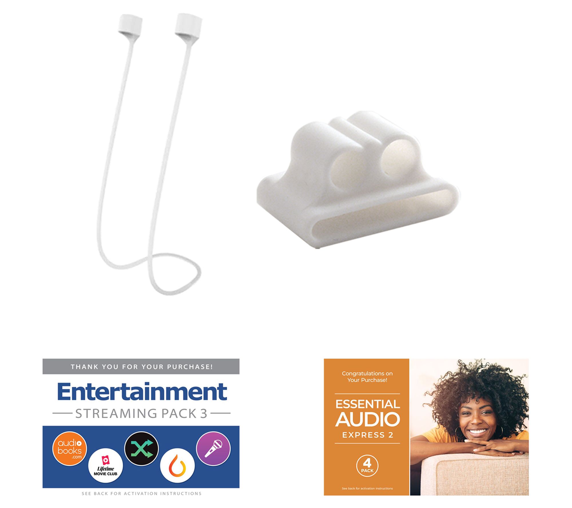 Includes fourth-generation Apple® AirPods® with USB-C charging case; magnetic neck wrap, sidekick, and two vouchers