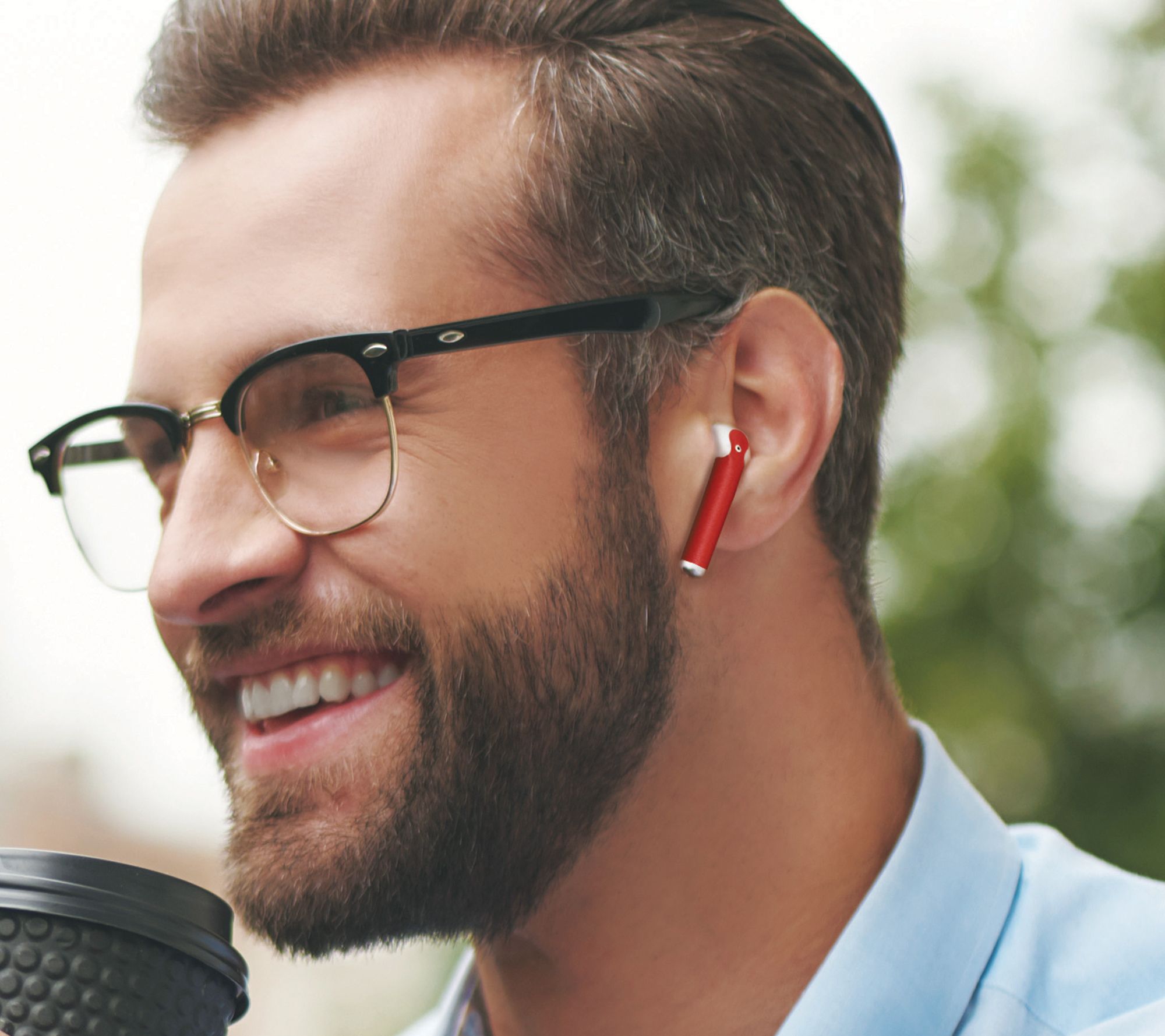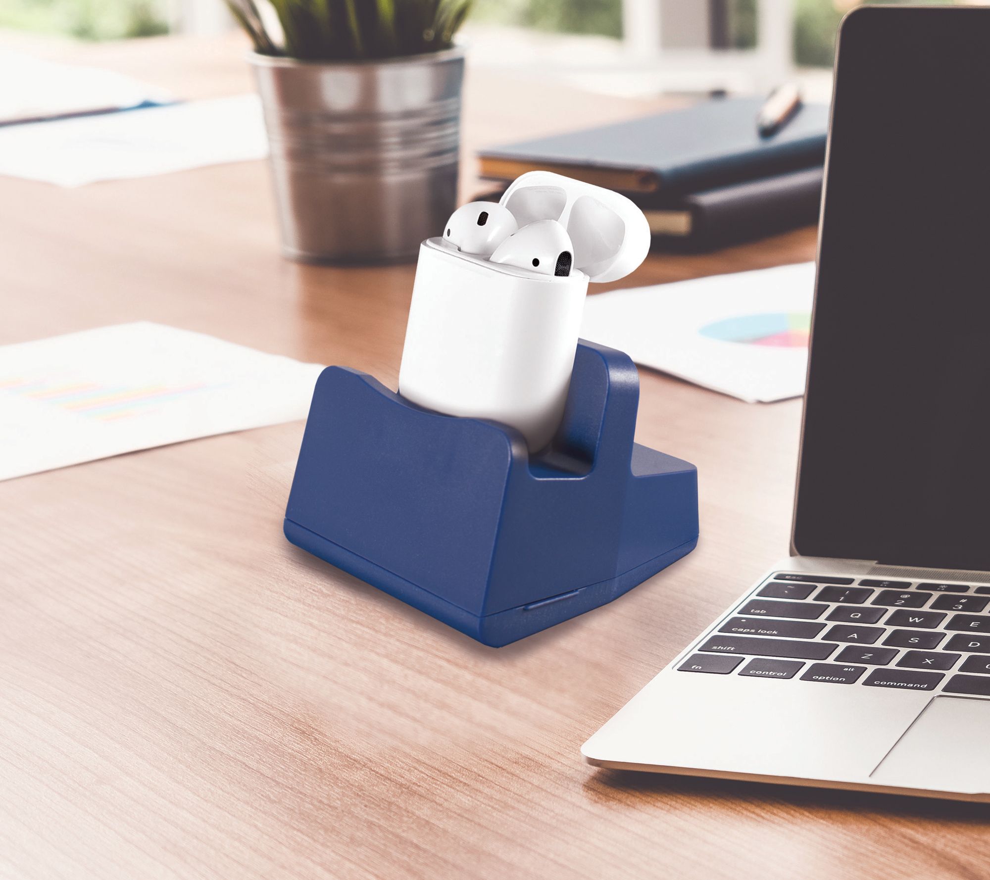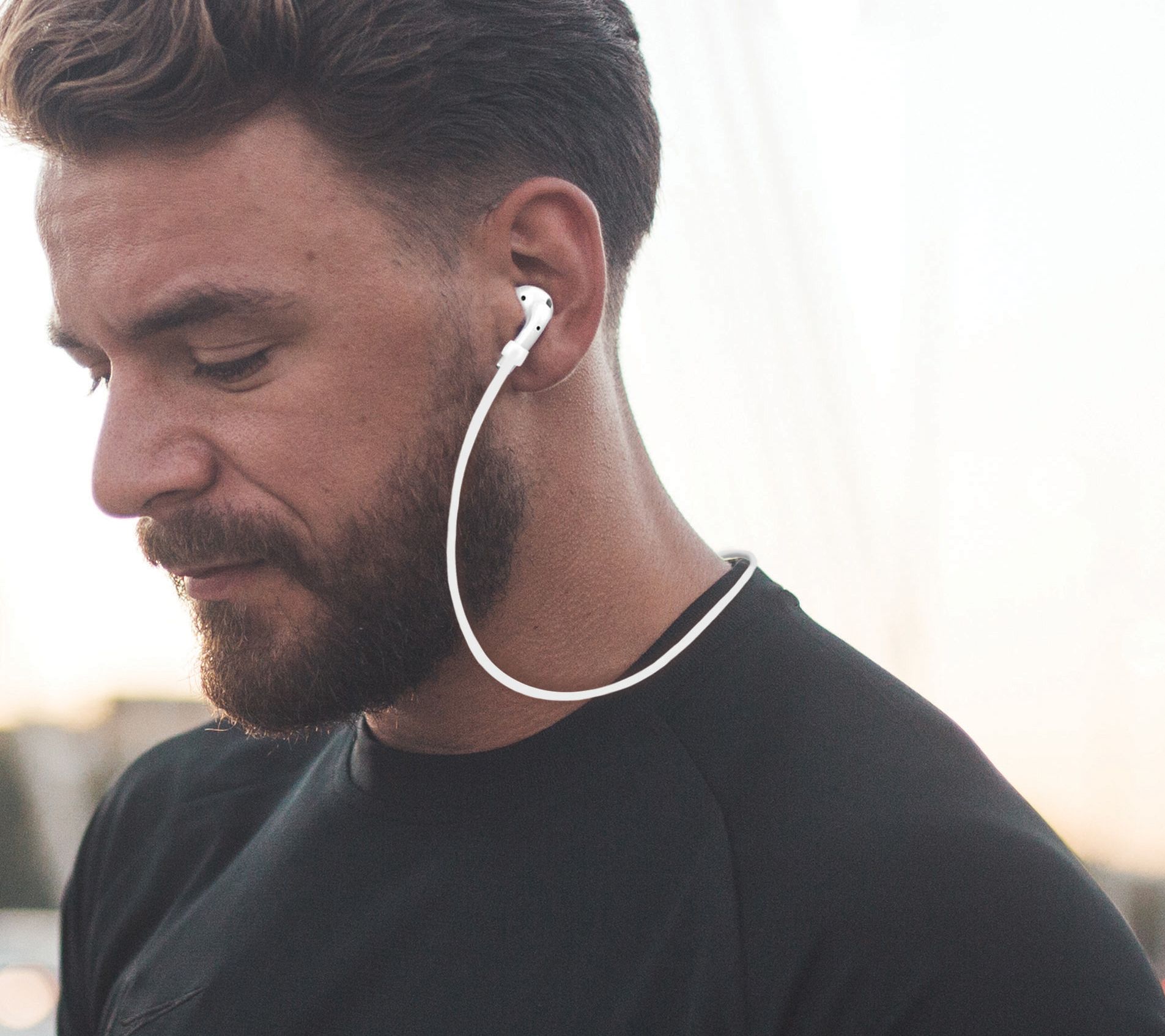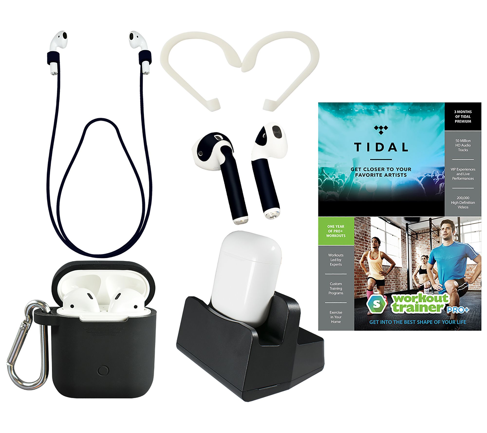 Includes second-generation Apple AirPods wireless headphones with charging case and Lightning-to-USB cable; silicone case with carabiner, charging stand, silicone neck wrap, Skin Wraps, AirHooks, and voucher