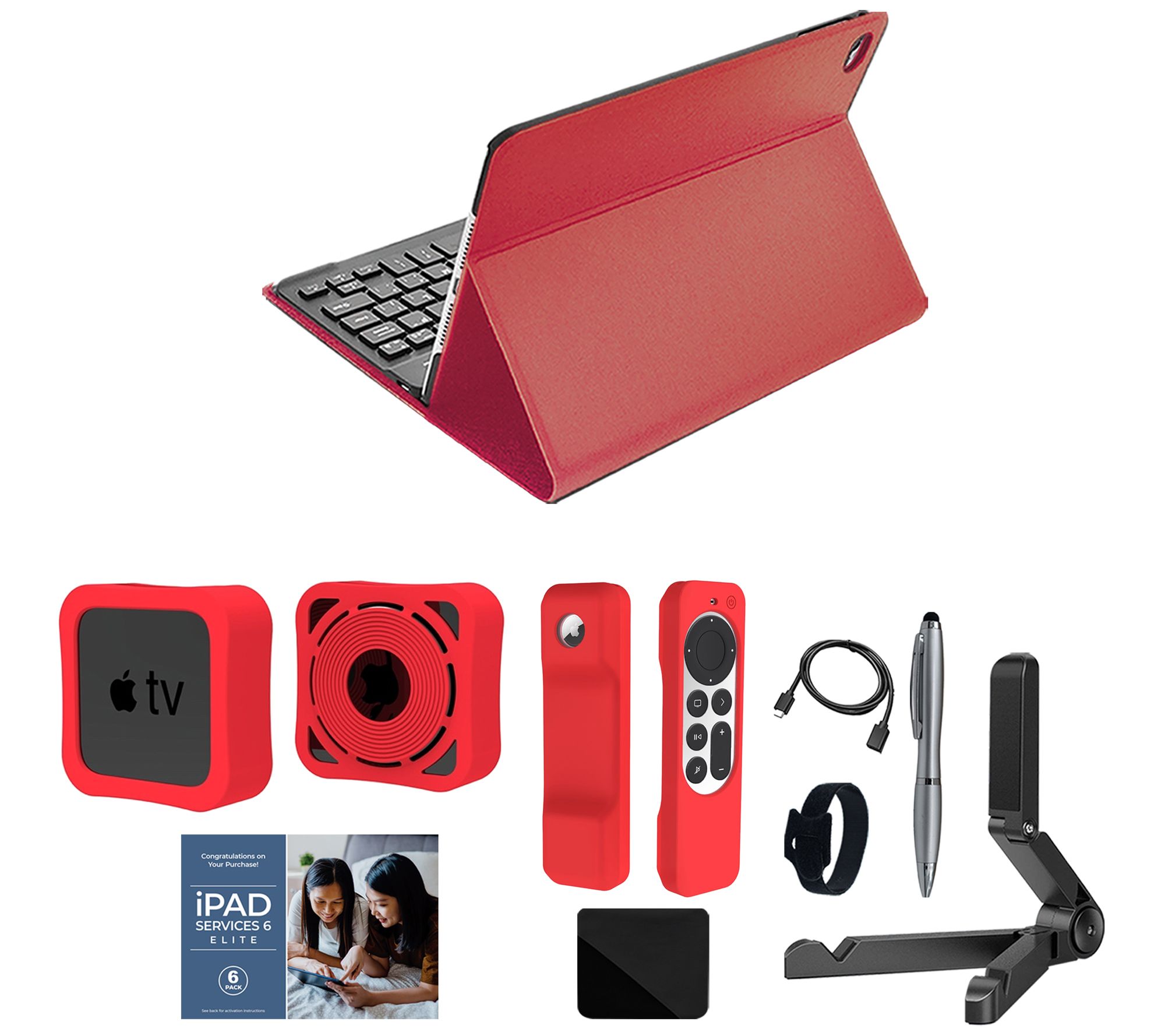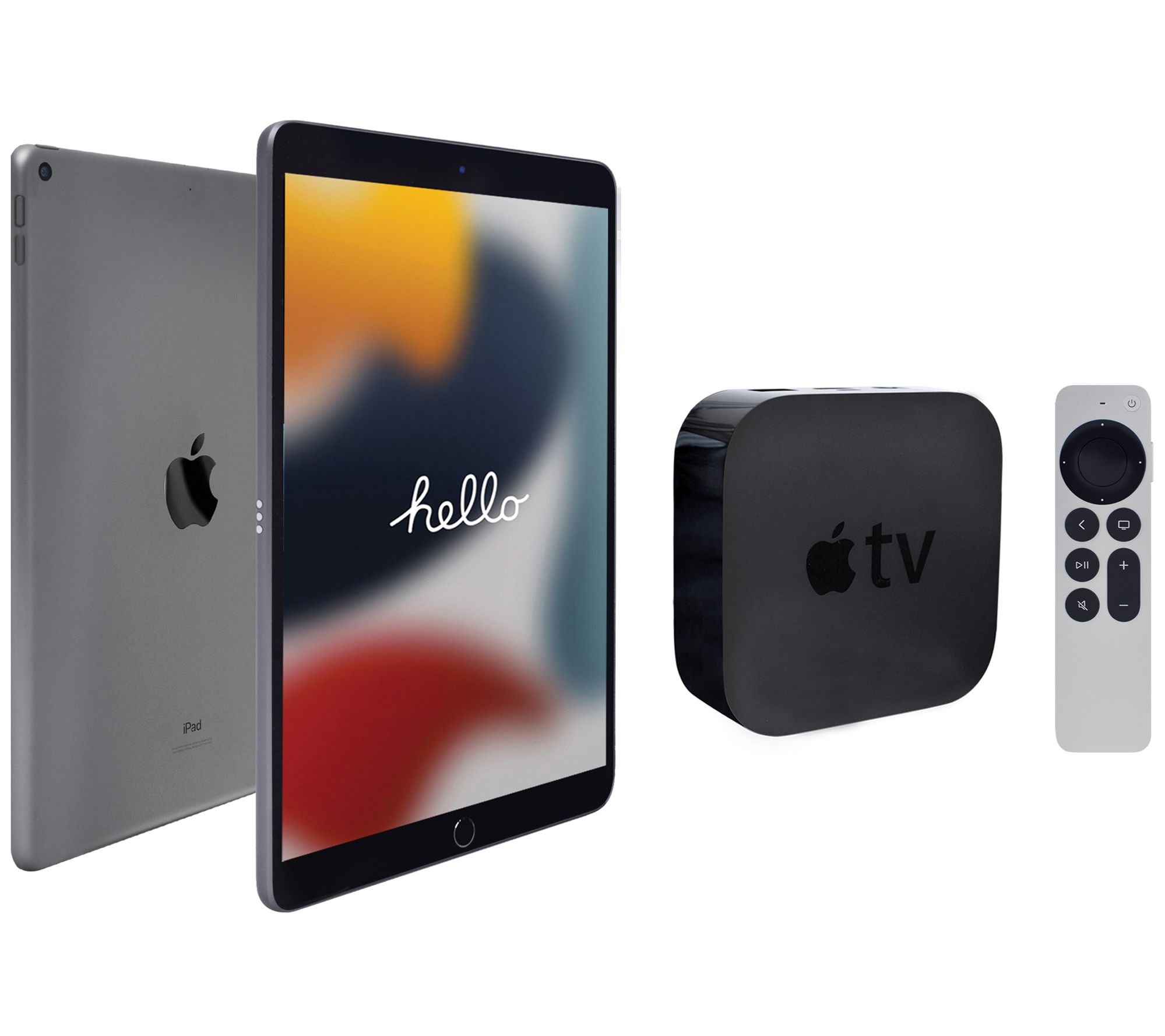 Includes 9th-generation iPad with lightning-to-USB-C cable and USB-C power adapter; Bluetooth keyboard, tablet stand, cleaning cloth, cable organizer, extension cable, and voucher; Apple TV 32GB with remote and silicone bumpers