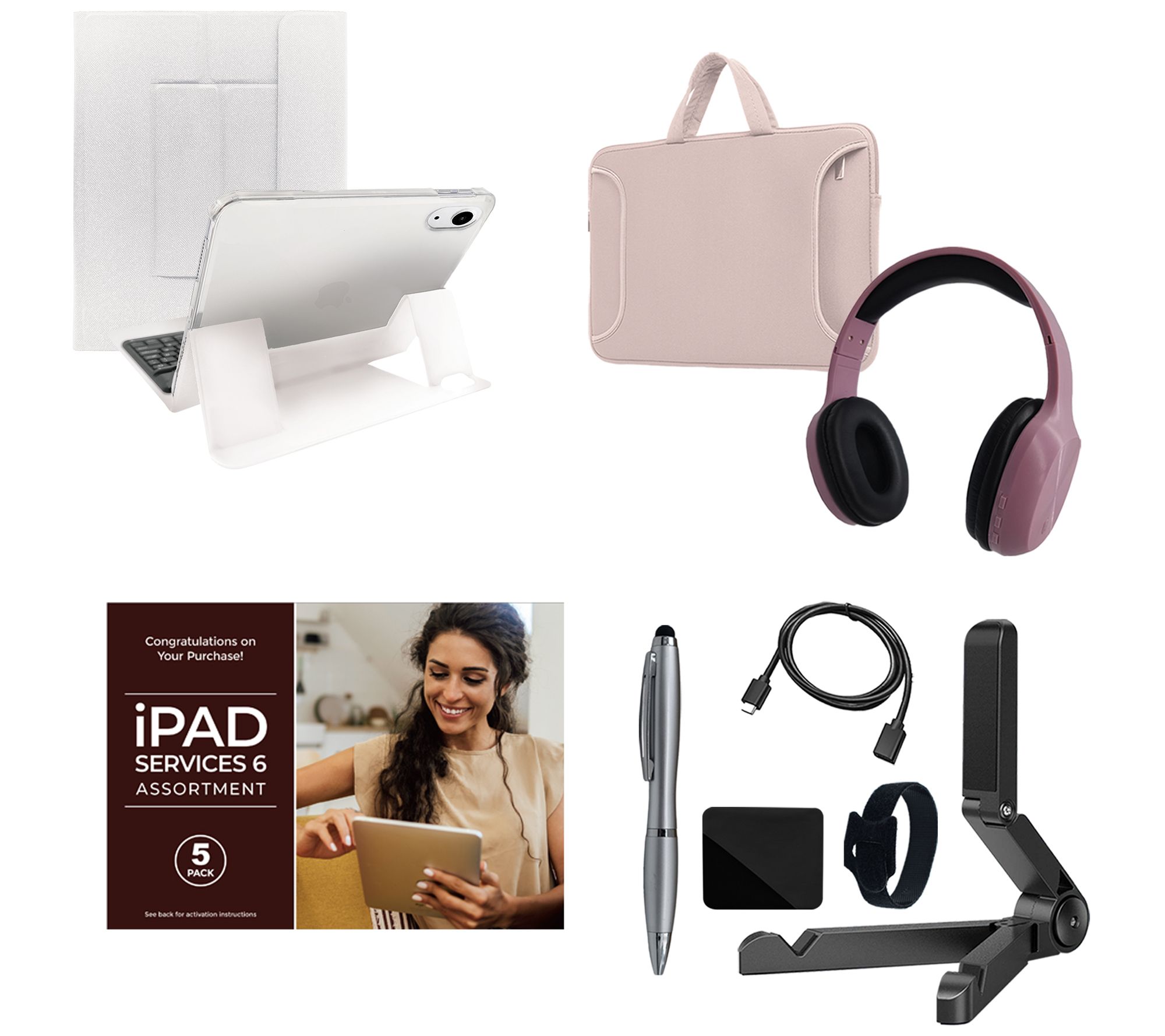 Includes 10th-generation iPad with USB-C charging cable and power adapter; Bluetooth keyboard, carry case, Bluetooth headphones, tablet stand, cleaning cloth, stylus, cable organizer, USB-C extension cable, and voucher
