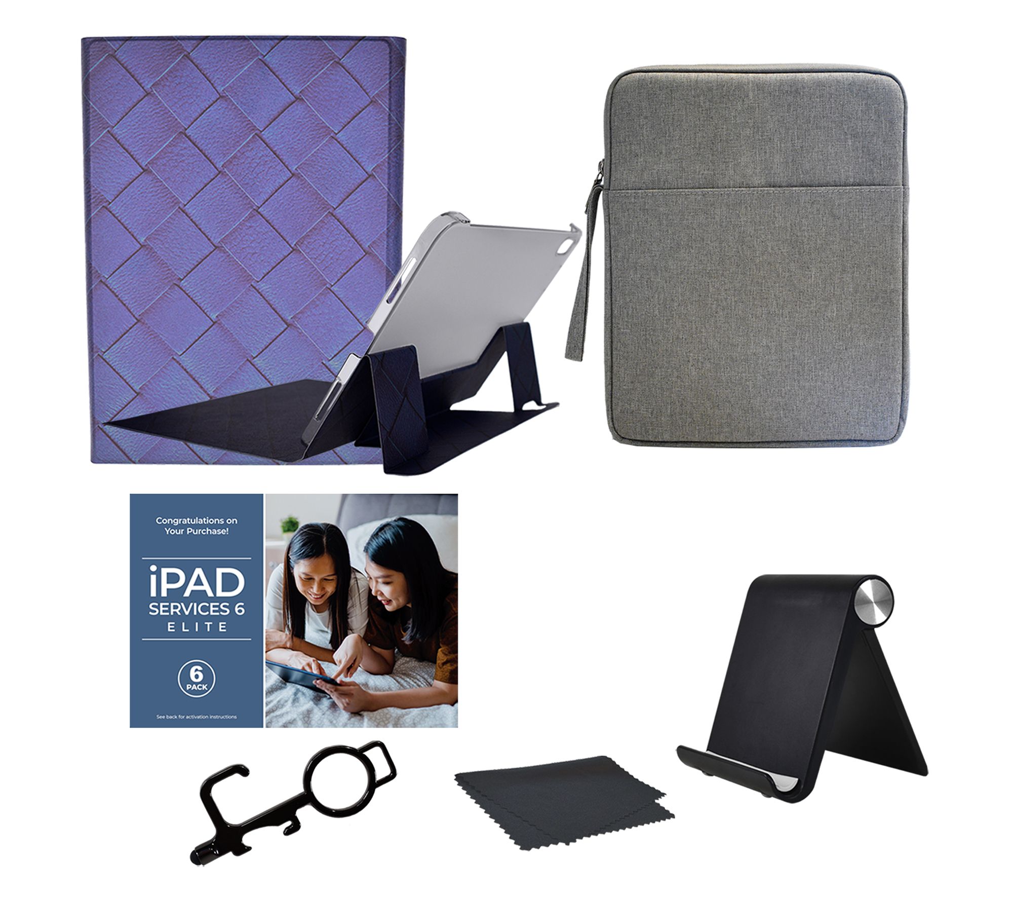 Includes 10th-generation iPad with USB-C charging cable and power adapter; portfolio case with keyboard, tablet stand, cleaning cloth, stylus/door opener, and voucher