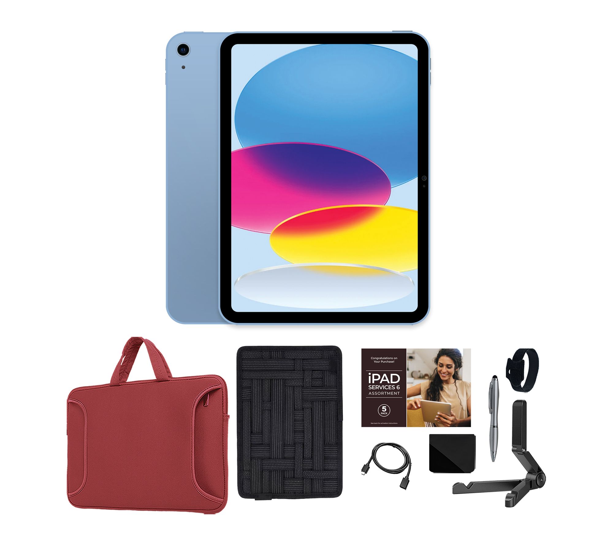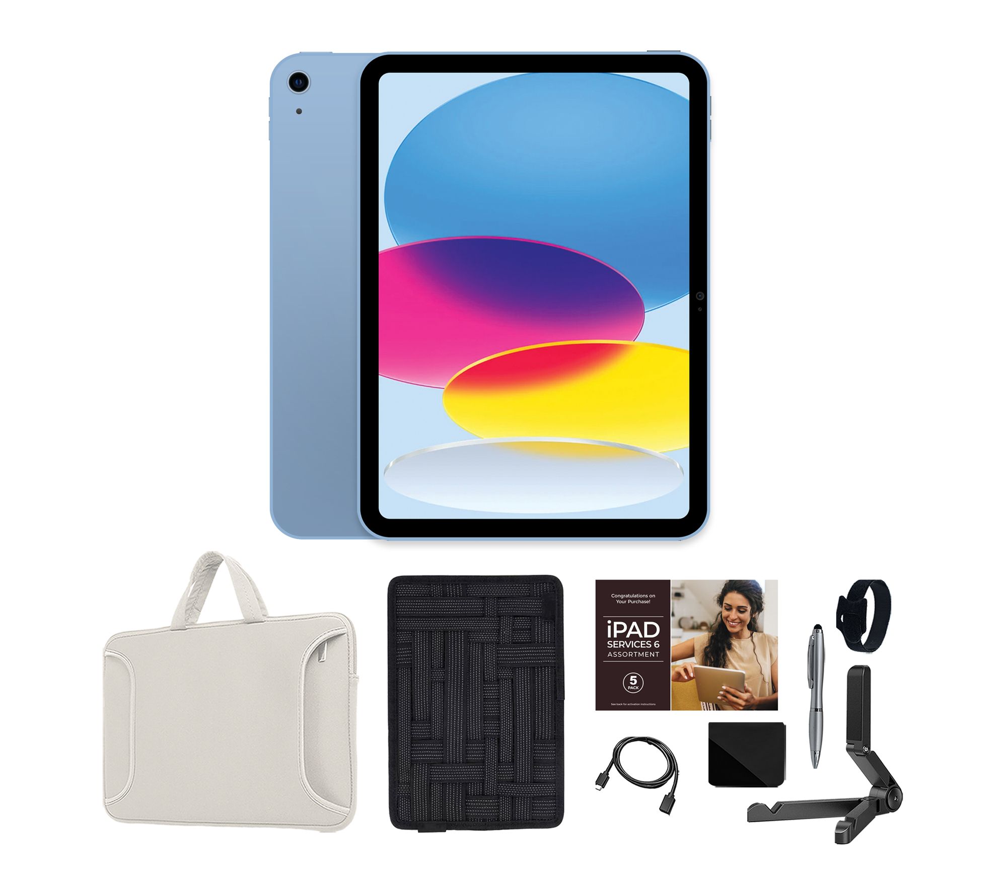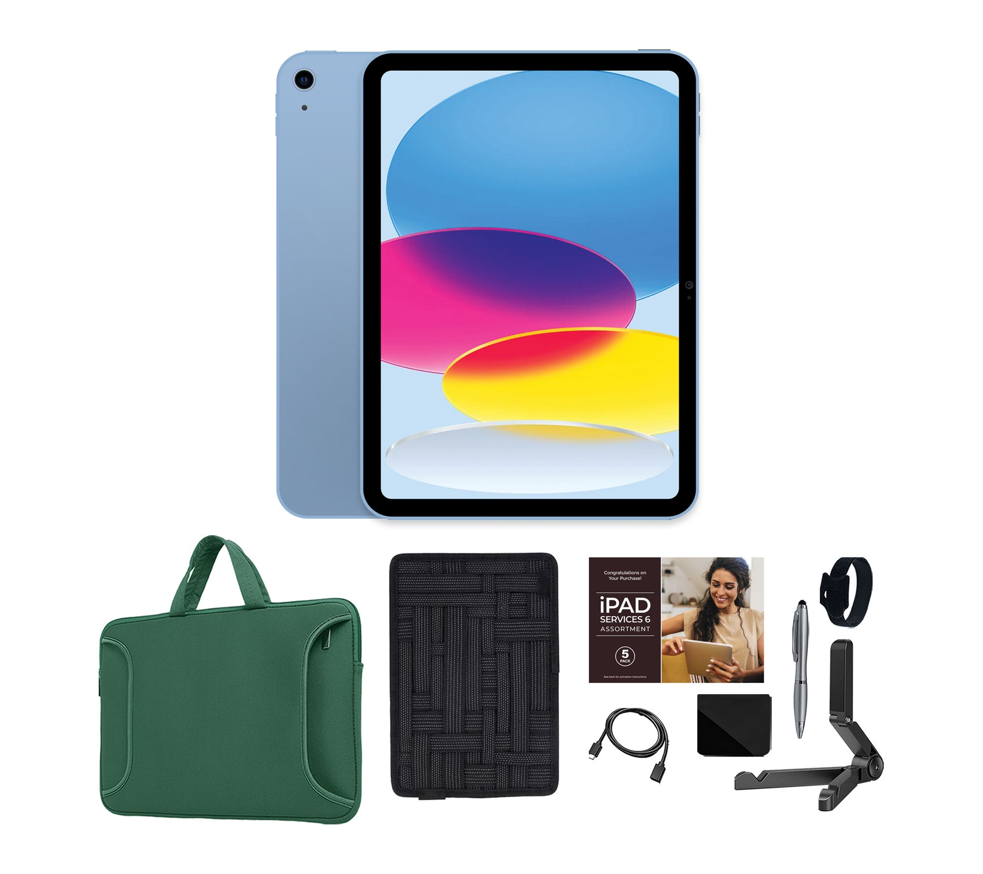 Includes iPad (A16), USB-C charge cable (1m), 20W USB-C Power Adapter, carry case, organizer case, tablet stand, cleaning cloth, stylus pen, extension cable, and cable organizer