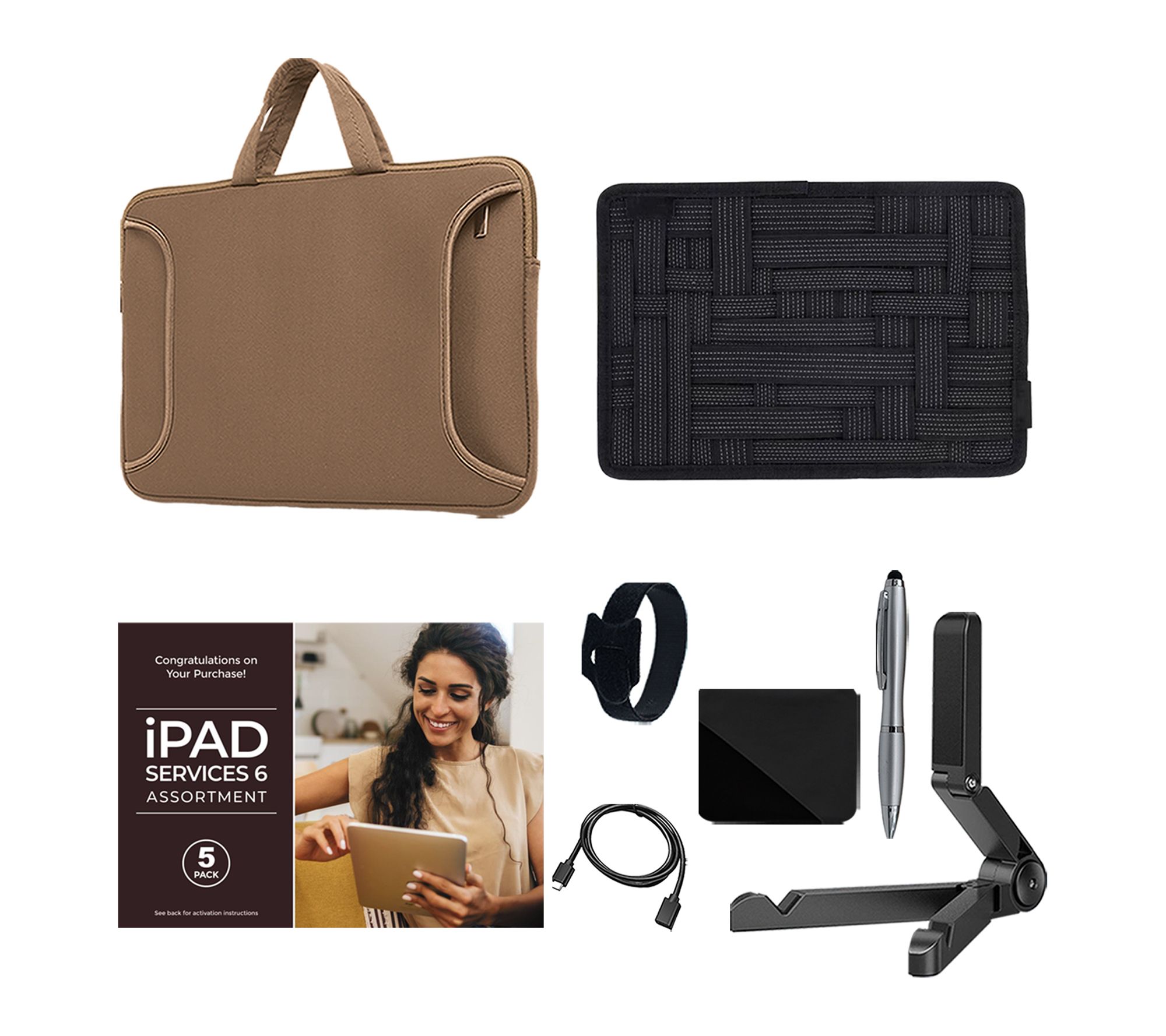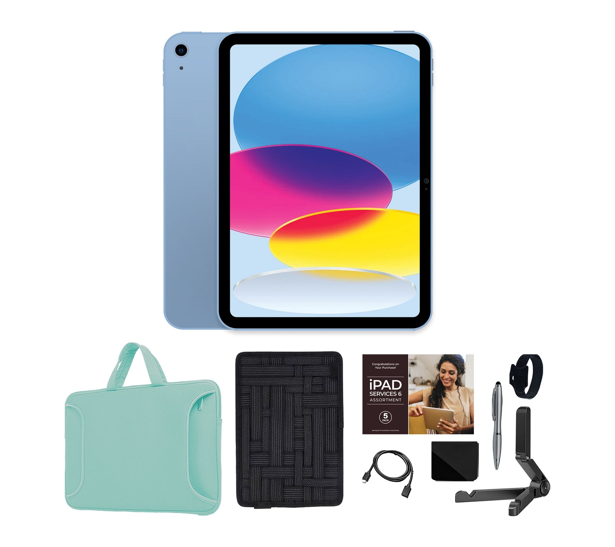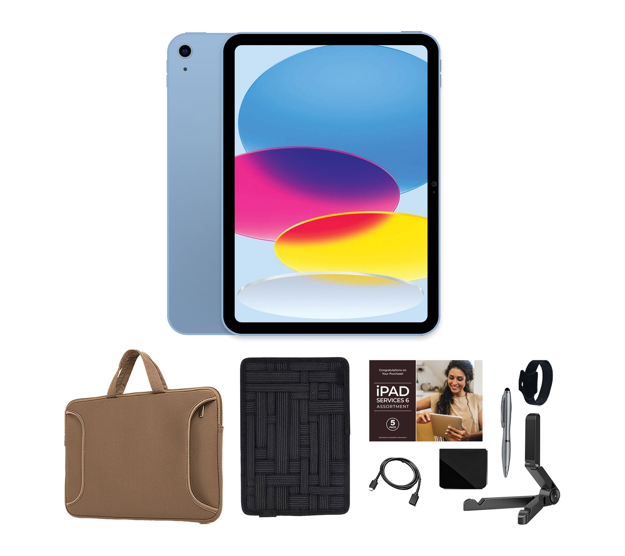 Includes iPad (A16), USB-C charge cable (1m), 20W USB-C Power Adapter, carry case, organizer case, tablet stand, cleaning cloth, stylus pen, extension cable, and cable organizer
