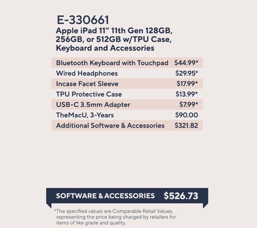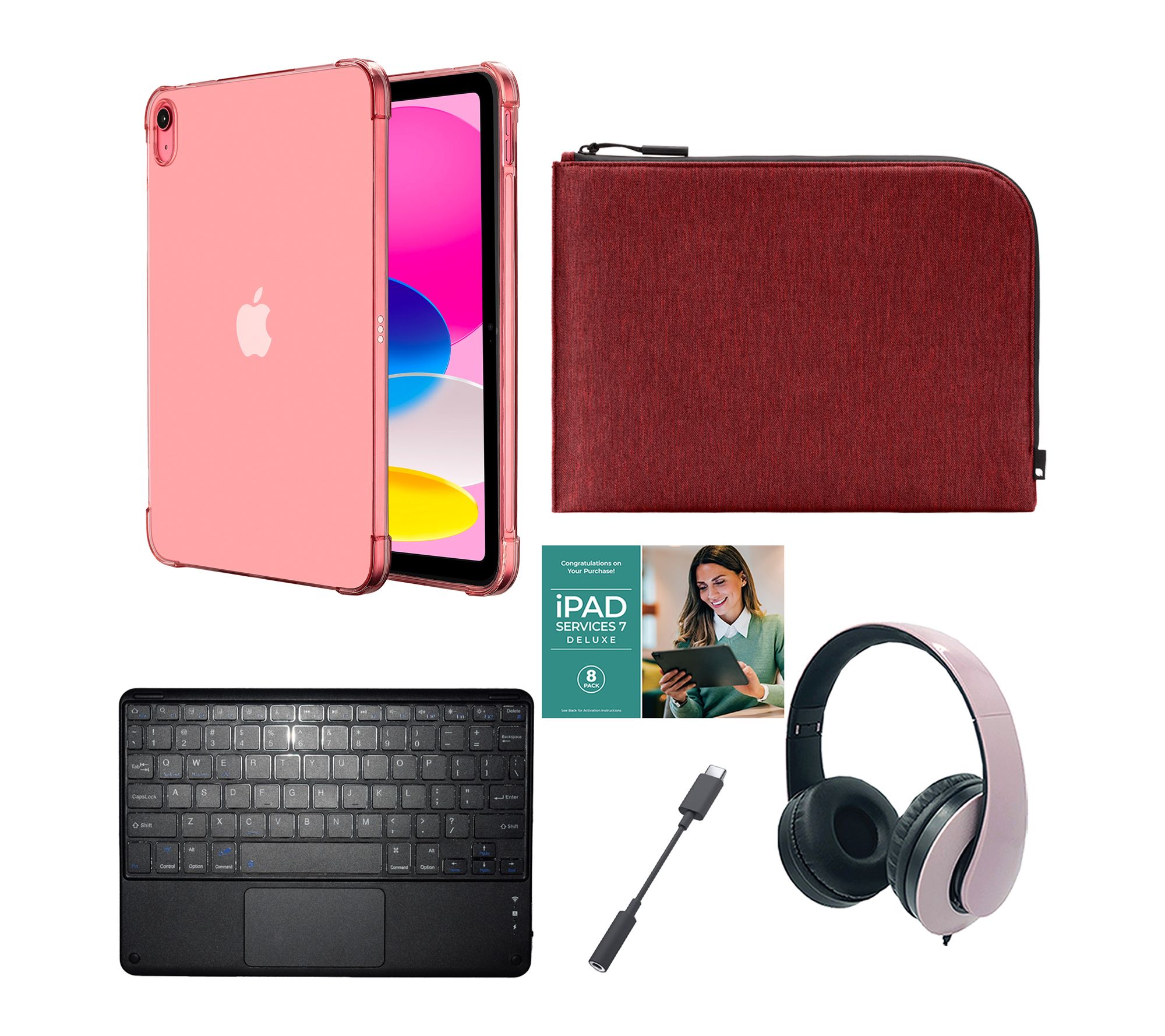 Includes 11th-generation iPad with USB-C charging cable and 20W USB-C power adapter; TPU case, Bluetooth wireless keyboard with touchpad, in-case sleeve, wired headphones, USB-C to 3.5mm adapter, and iPad Services 7 Deluxe voucher