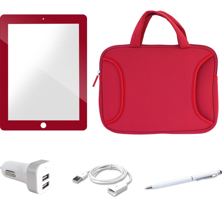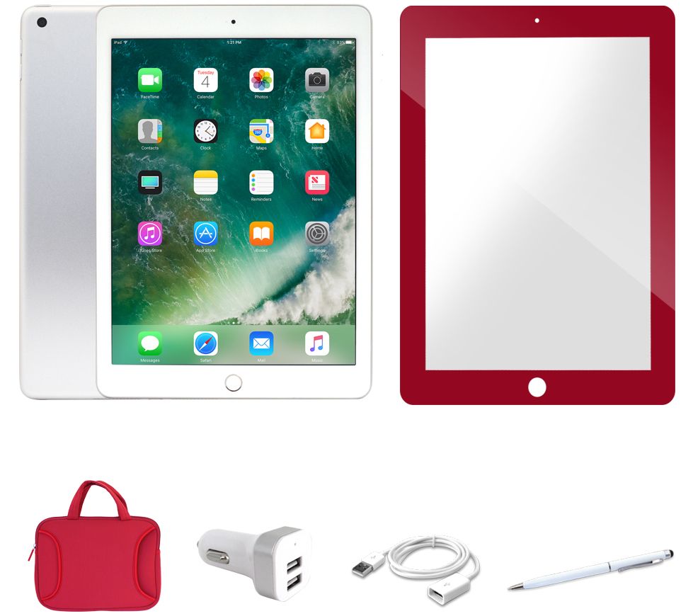 Includes iPad with Lightning-to-USB cable and USB power adapter; screen protector, neoprene case, two-port USB car charger, stylus, and 6'L USB extension cable