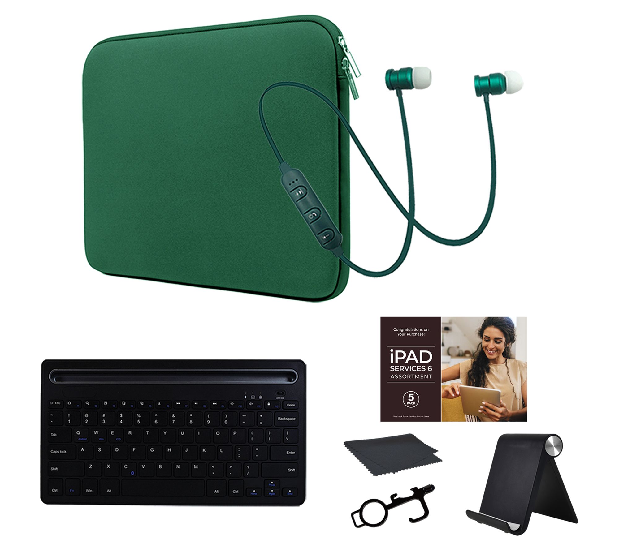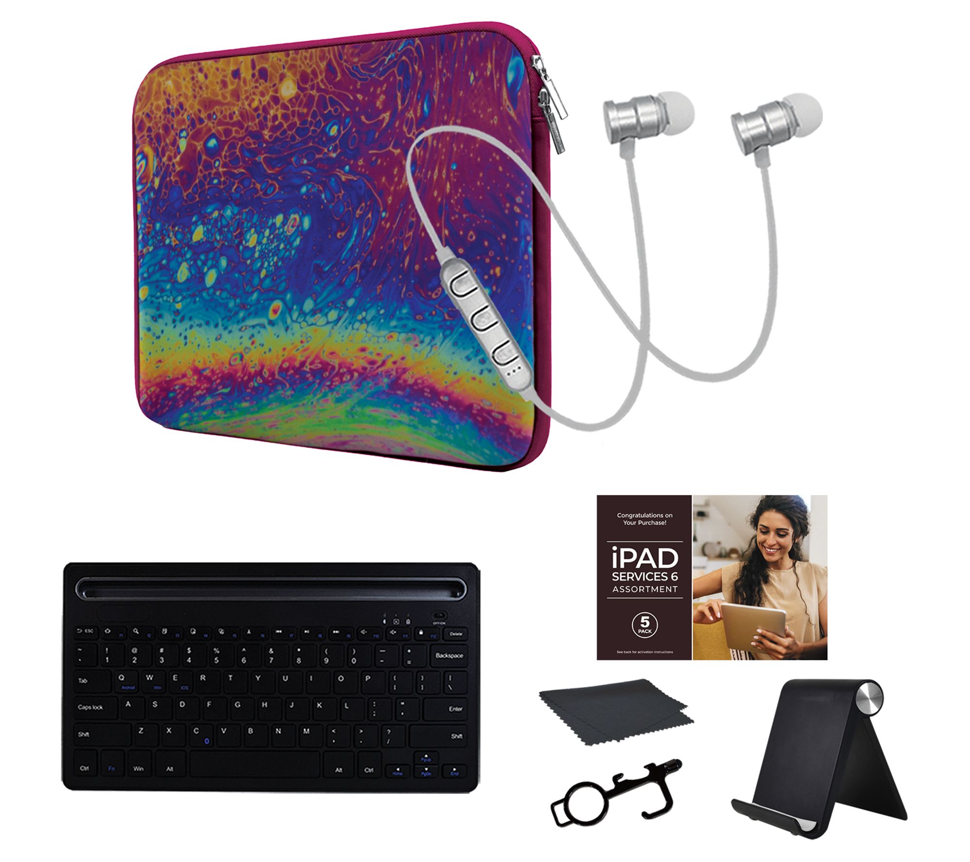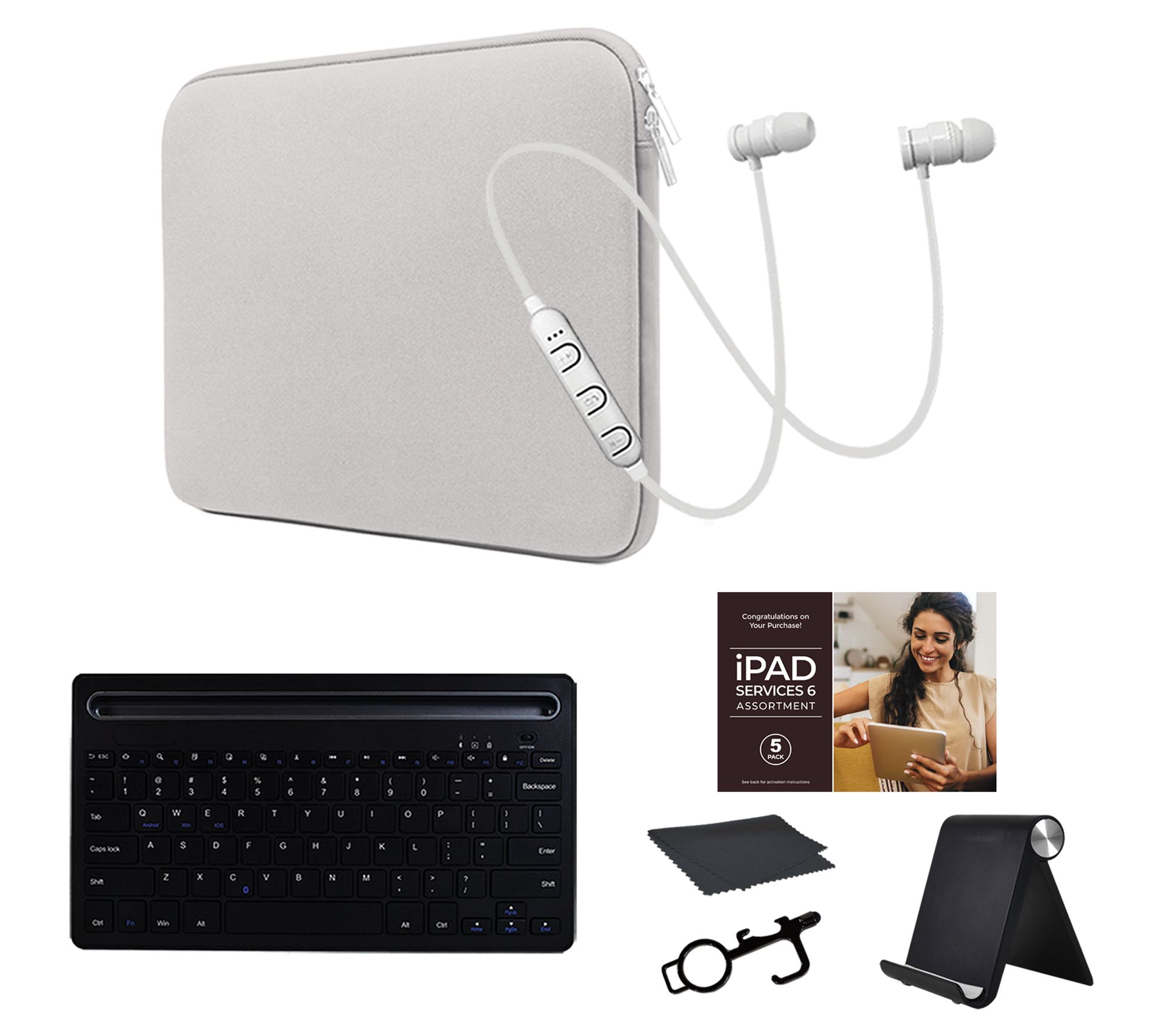 Includes Apple iPad Air with 20W USB-C power adapter and USB-C charging cable; carry case, over neck earbuds, wireless keyboard, tablet stand, stylus pen, microfiber cloth, and voucher