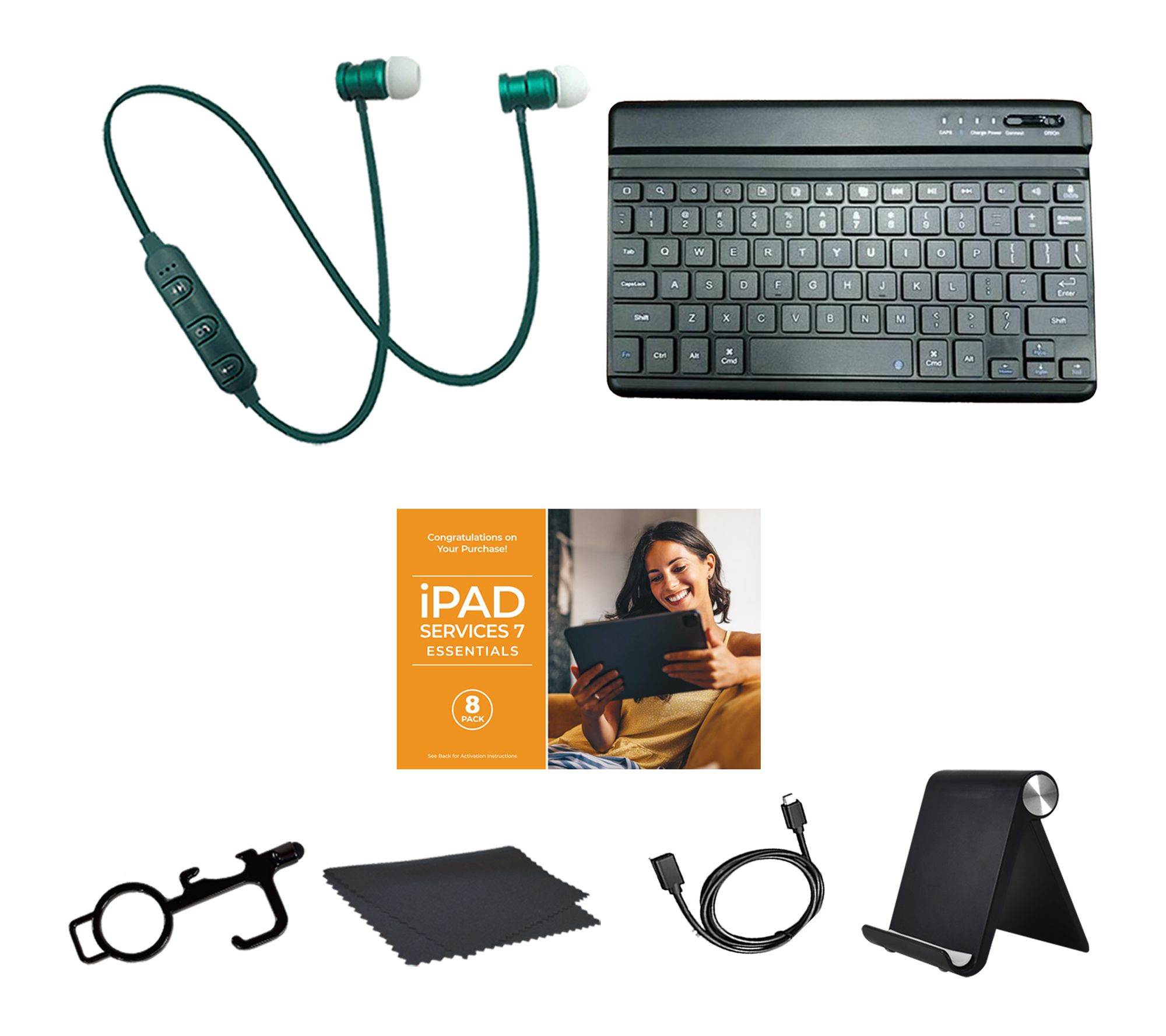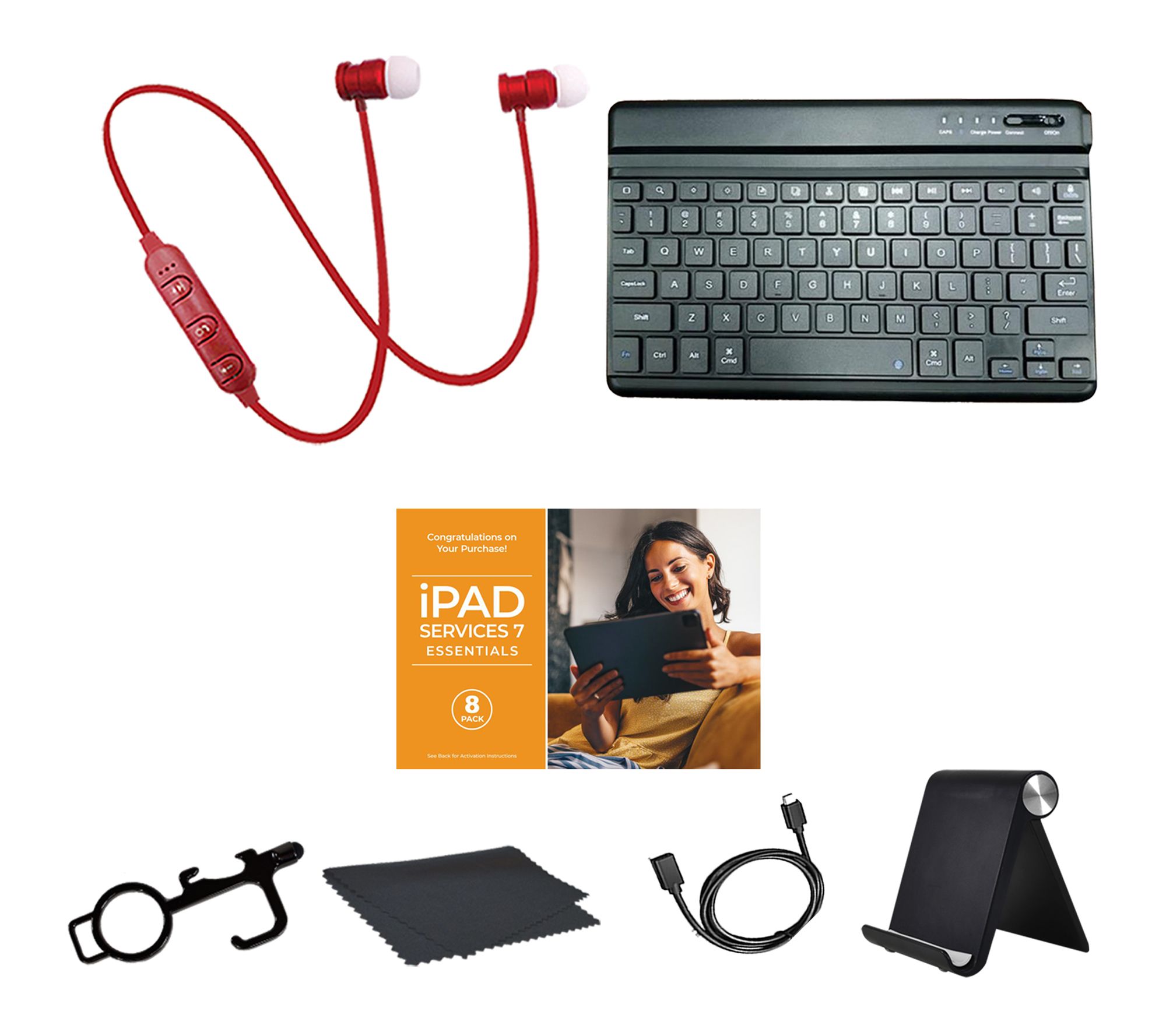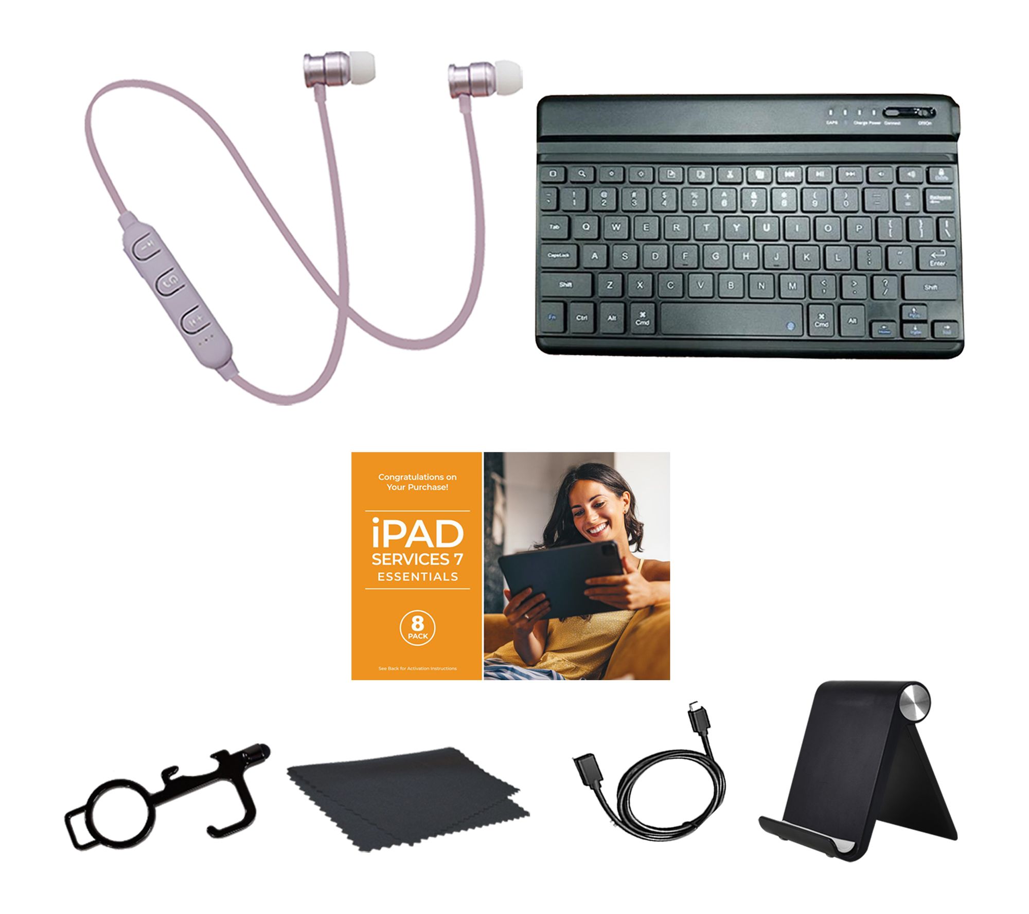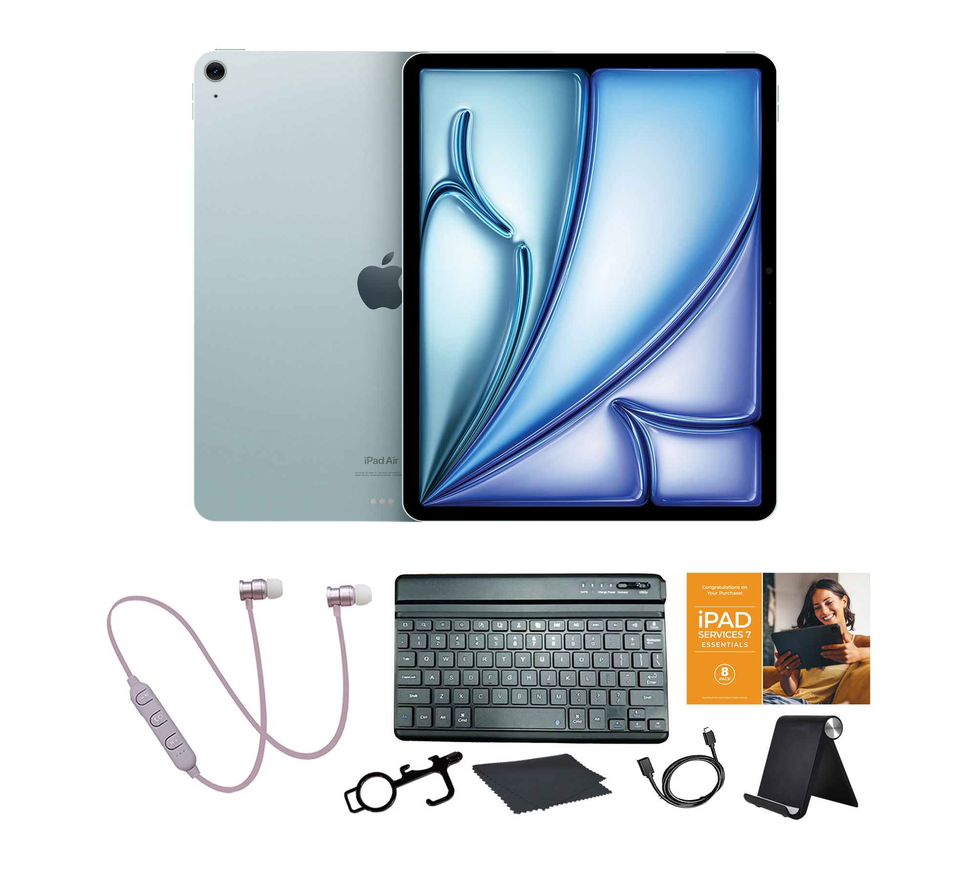 Includes iPad Air, USB-C charge cable, wireless keyboard, Bluetooth earbuds, and 20W USB-C power adapter