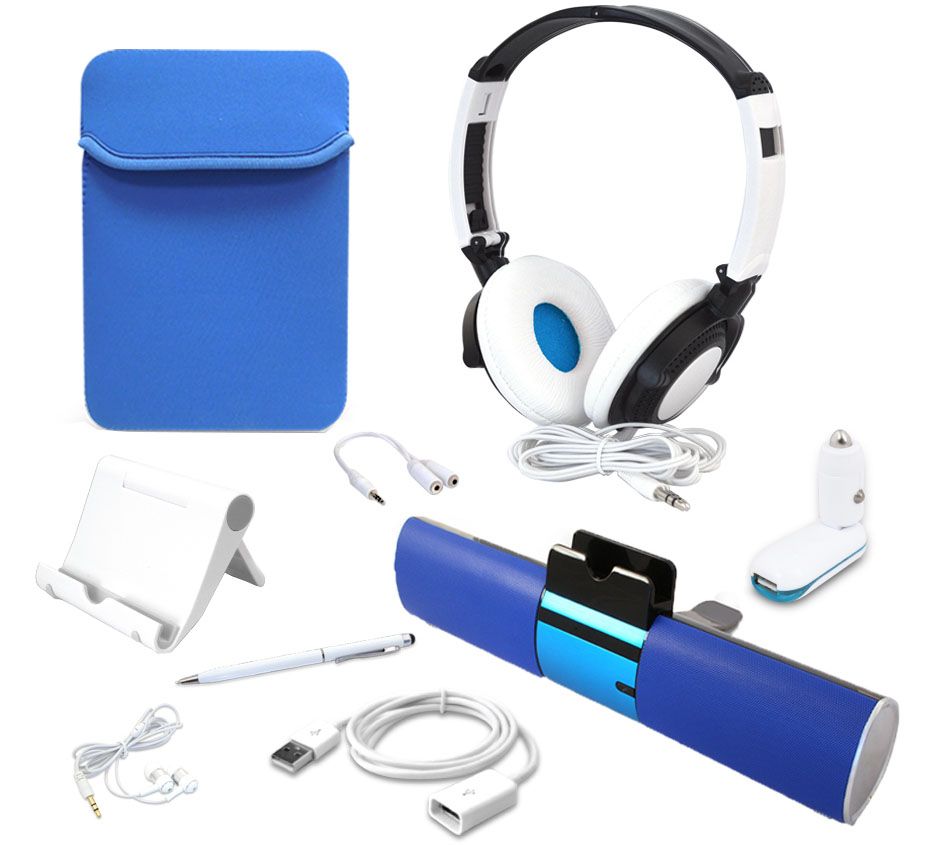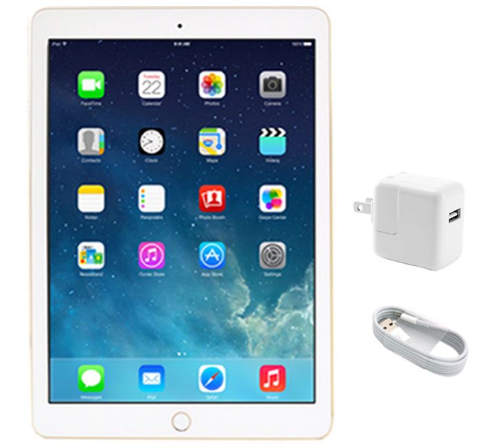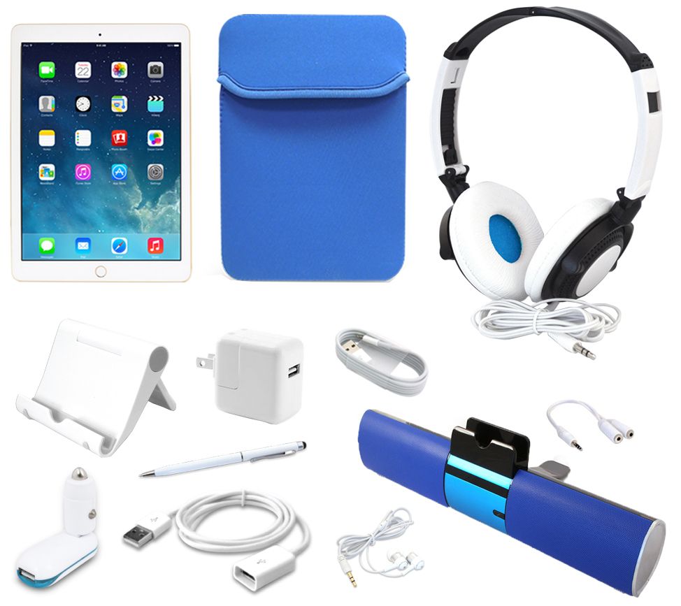 Includes iPad Air 2 with Lightning-to-USB cable and USB power adapter; 2-in-1 stylus pen, earbuds, 6'L extension cable, tablet stand, headphone splitter, neoprene sleeve, car charger, Bluetooth speaker bar, and DJ-style headphones