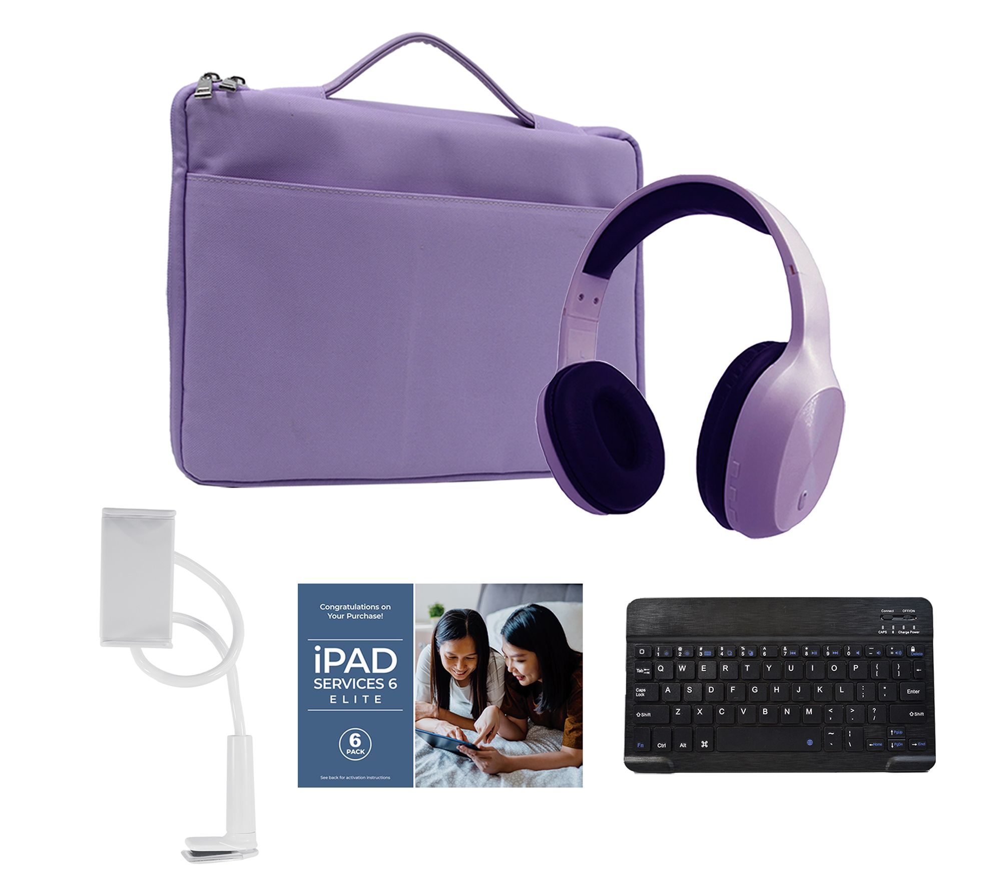 Includes Apple® iPad mini® 6 tablet with USB-C charging cable and USB power adapter; Bluetooth keyboard, carry case, Bluetooth headphones, gooseneck tablet holder, and voucher