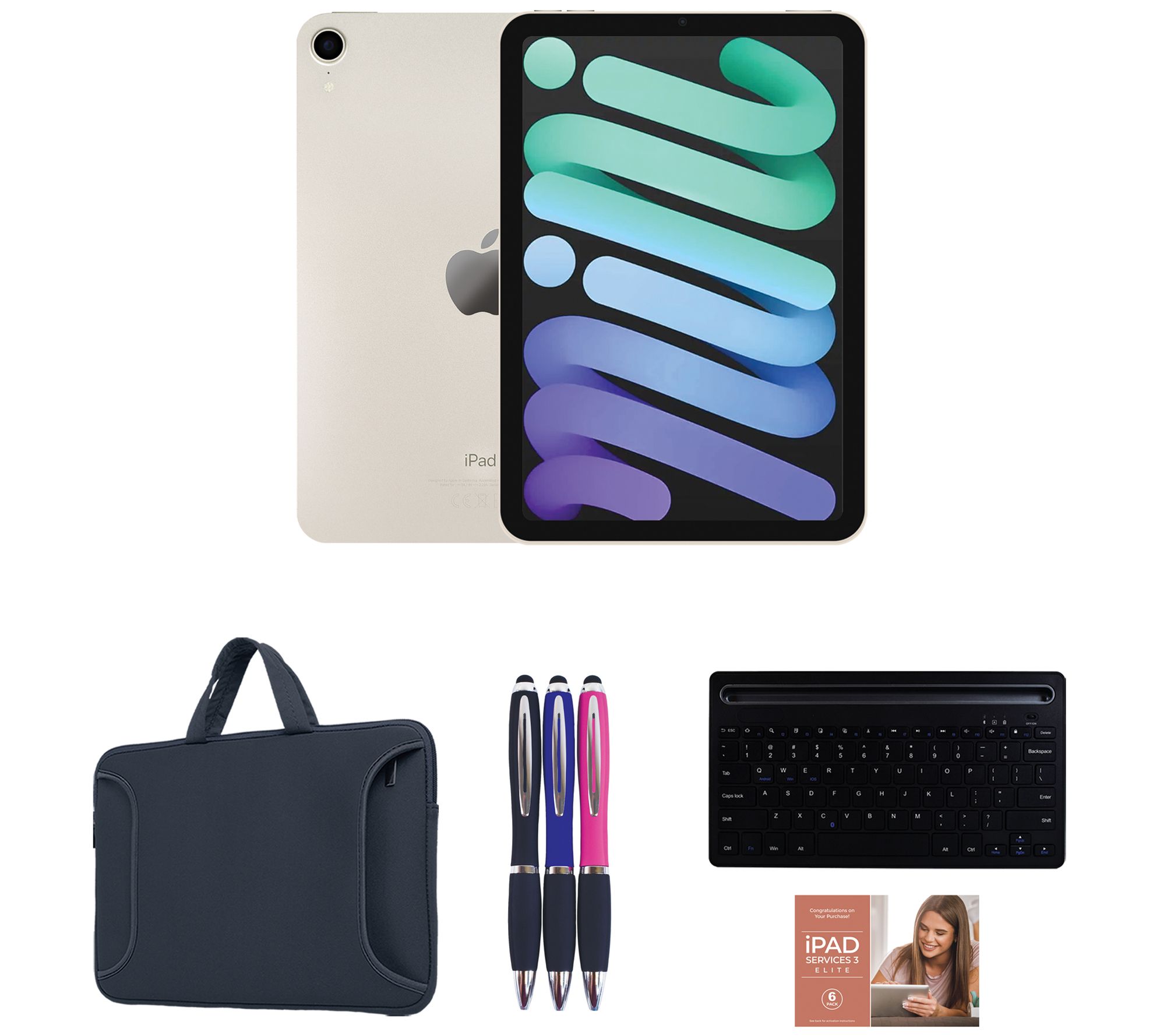Includes Apple® iPad mini® 6 tablet with USB-C charging cable and USB power adapter; Bluetooth keyboard, carry case, three stylus pens, and voucher
