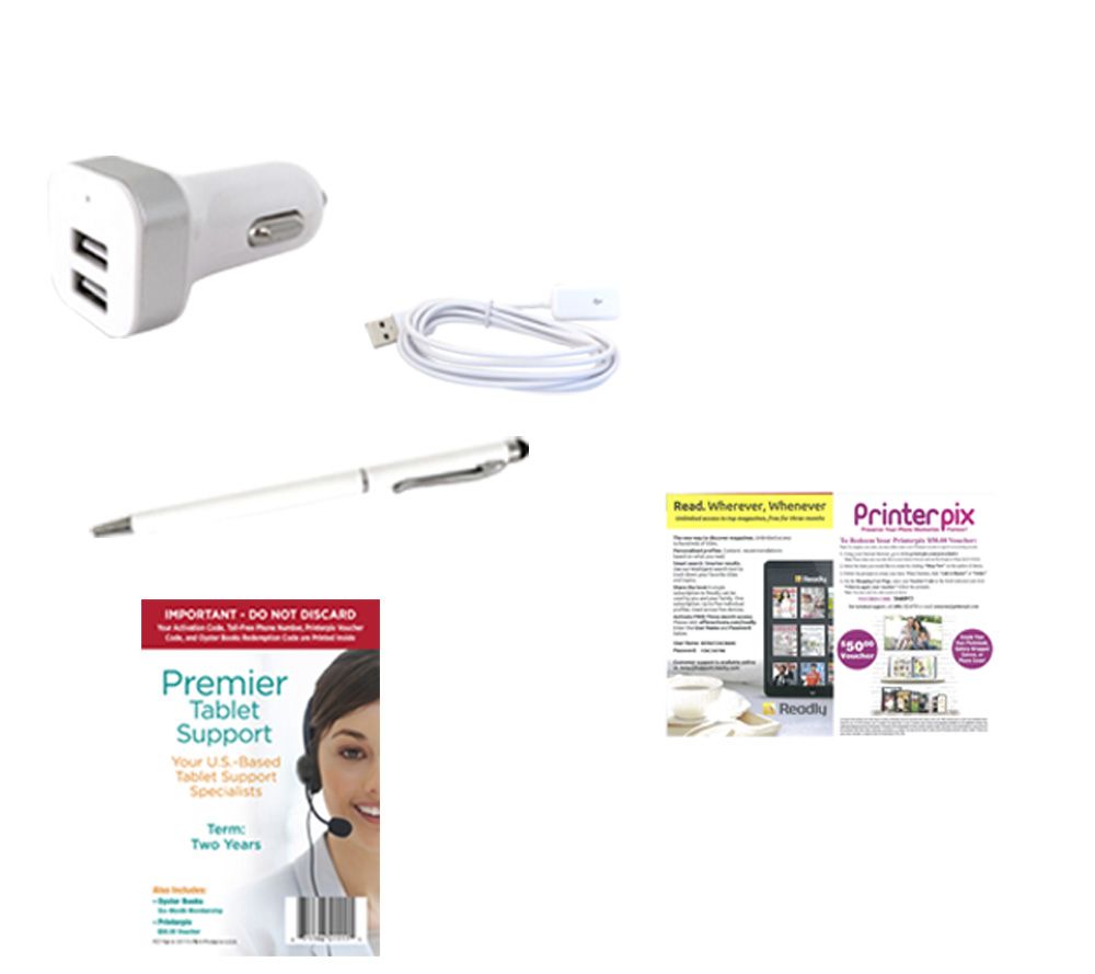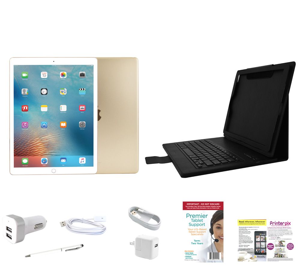 Includes iPad Pro with Lightning-to-USB cable, and USB power adapter; 2-in-1 stylus pen, 6'L extension cable, car charger, portfolio Bluetooth keyboard, 2 years of tablet tech support, Printerpix voucher, and Readly book voucher