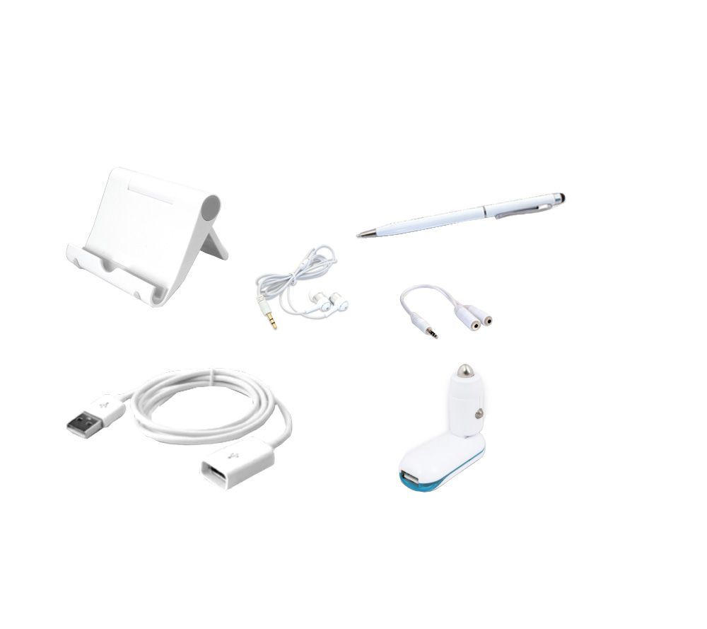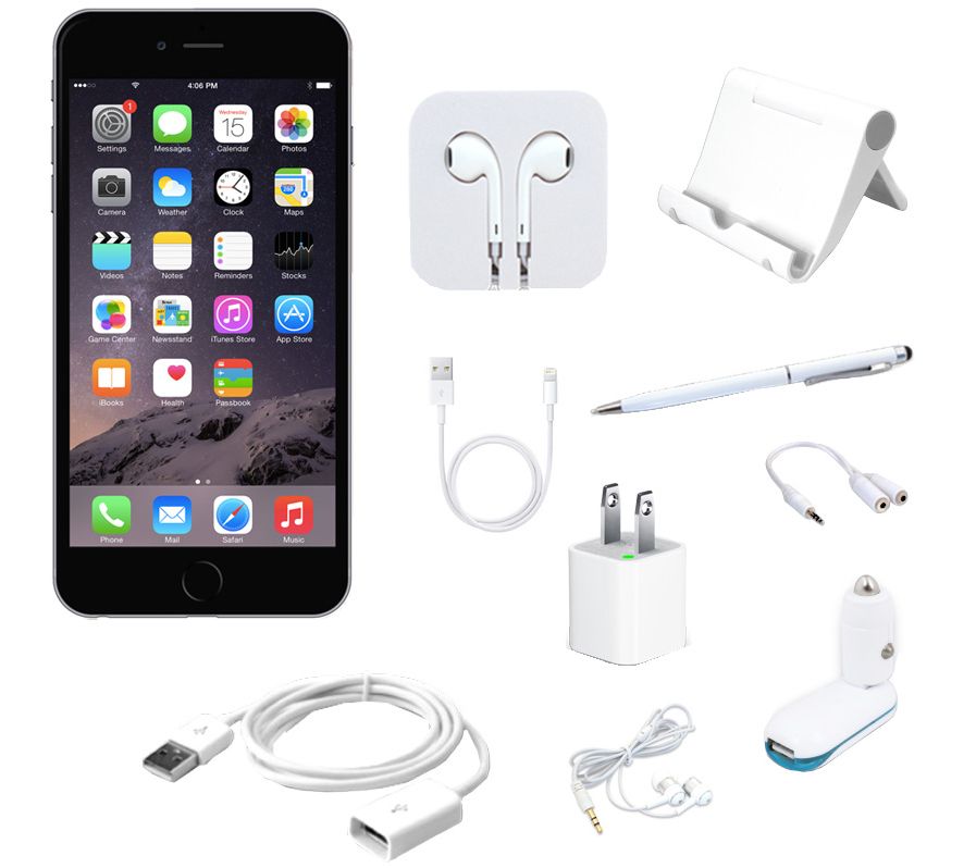 Includes iPhone 6 Plus, USB power adapter, Lightning-to-USB cable, EarPods, and guide; 2-in-1 stylus pen, earbuds, 6'L extension cable, tablet stand, headphone splitter, and car charger