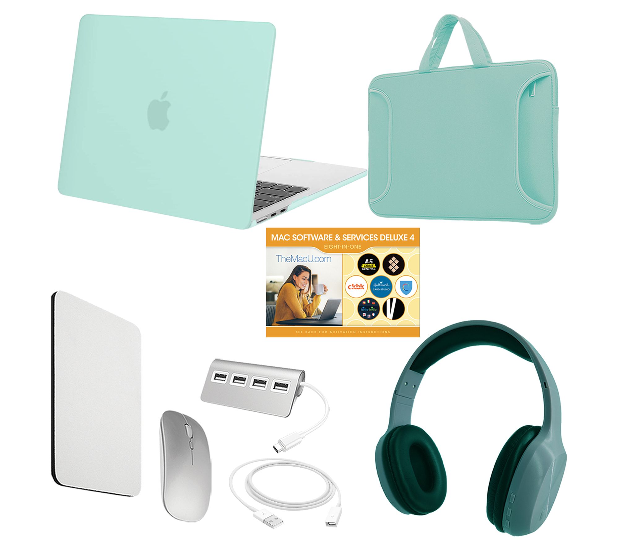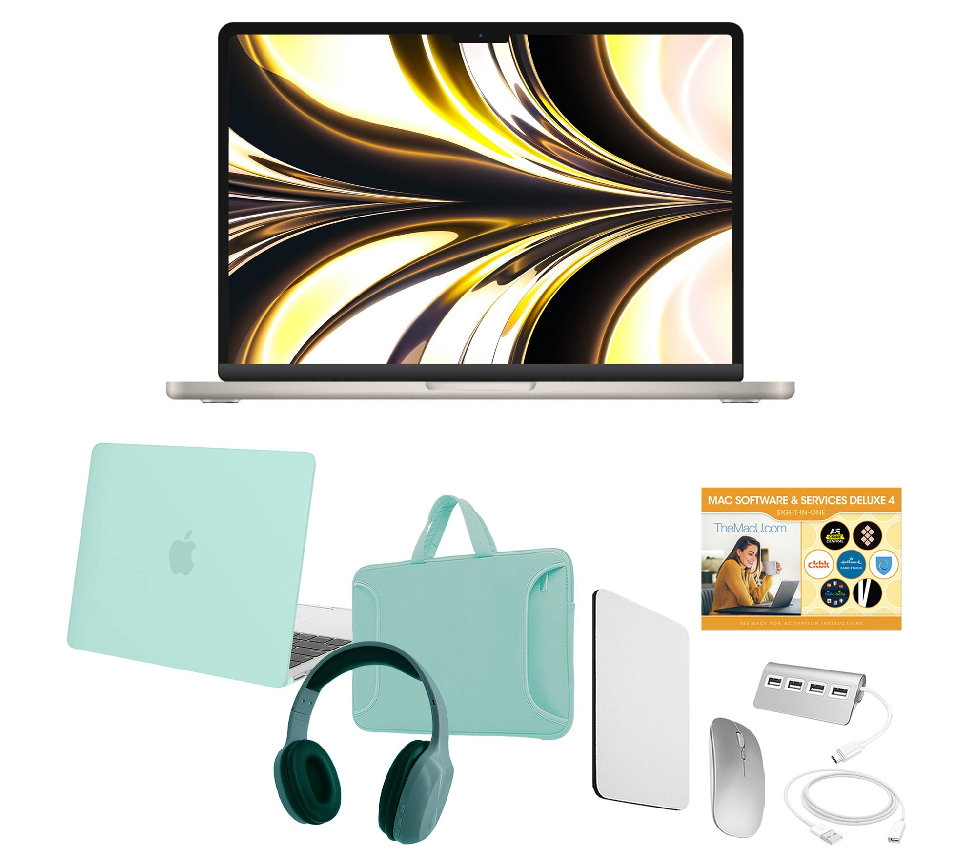 Includes MacBook Air with USB-C power adapter and USB-C to MagSafe 3 cable; carry case, Bluetooth headphones, fitted clip case, wireless mouse with AA battery, mouse pad, four-port USB-C hub, 6' USB extension cable, and voucher