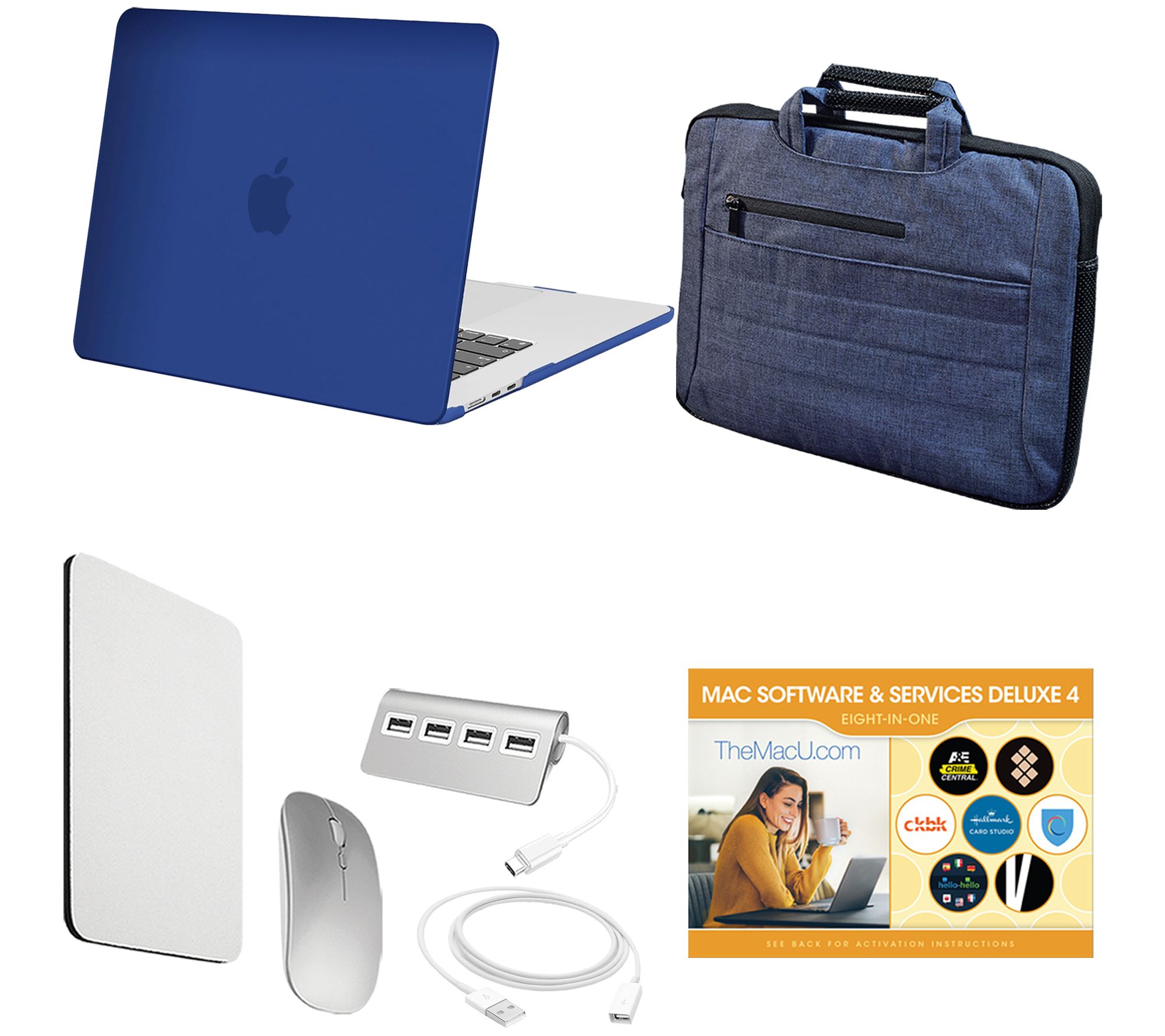 Includes MacBook Air, USB-C to MagSafe 3 cable, USB-C power adapter; fitted clip case, carry case, wireless mouse, mouse pad, 4-port USB-C hub, USB extension cable, voucher