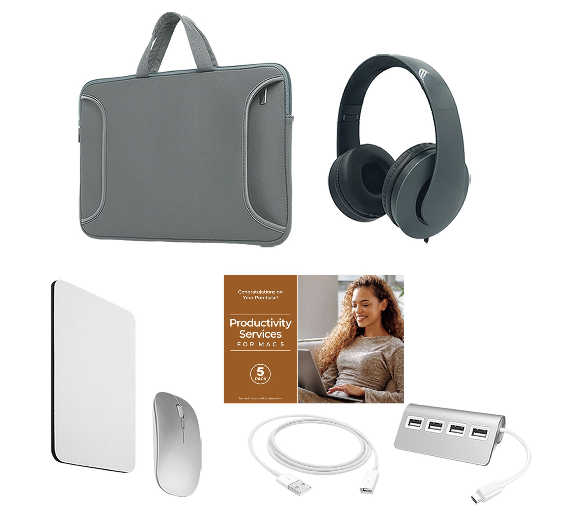 Includes MacBook Air, USB-C to MagSafe 3 cable, USB-C power adapter, neoprene sleeve, wired headphones, wireless mouse, mouse pad, USB extension cable, four-port USB-C hub, and voucher