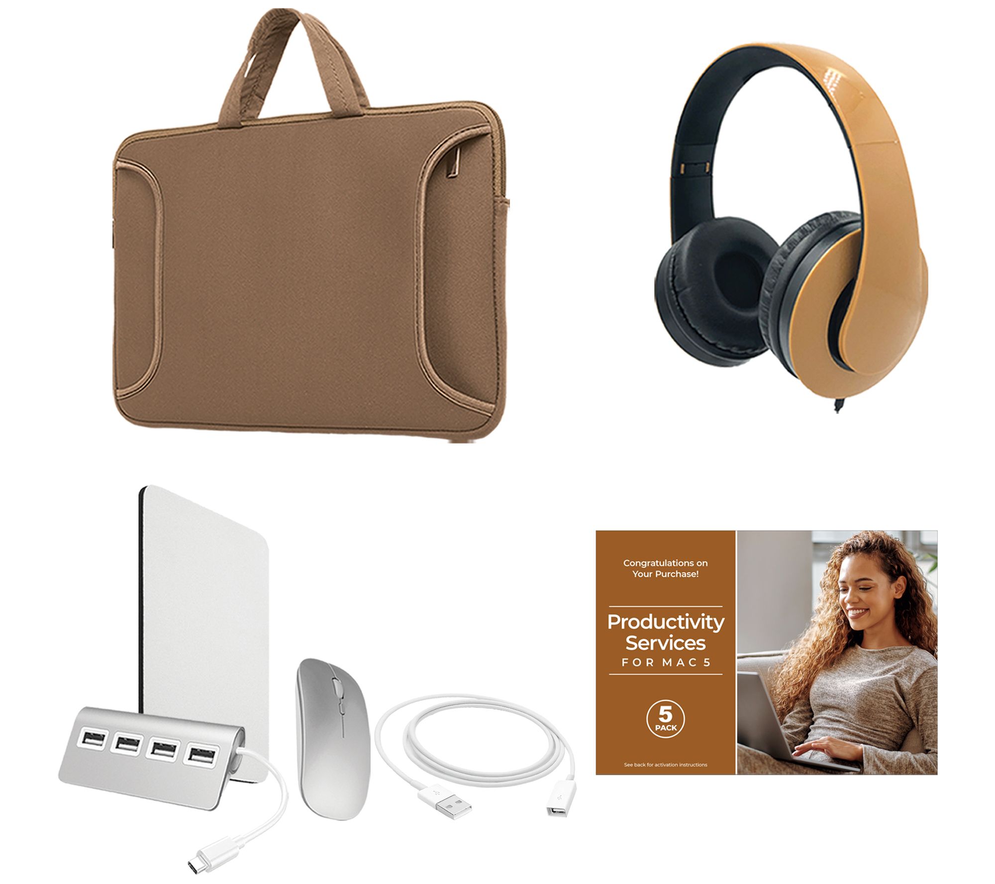 Includes MacBook Pro with USB-C power adapter and USB-C charging cable; carry case, clip case, headphones, wireless mouse, four-port USB hub, USB extension cable, and voucher
