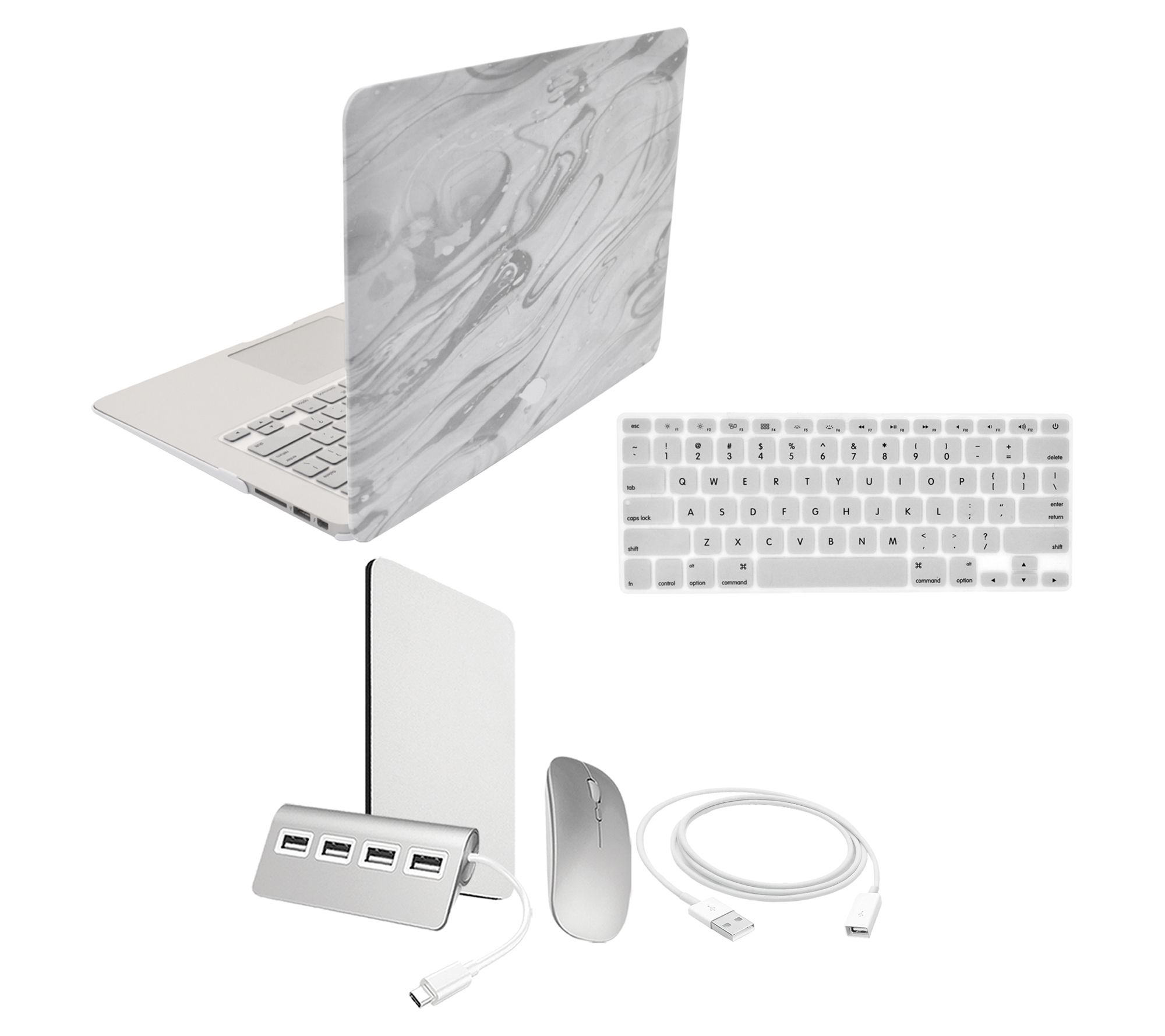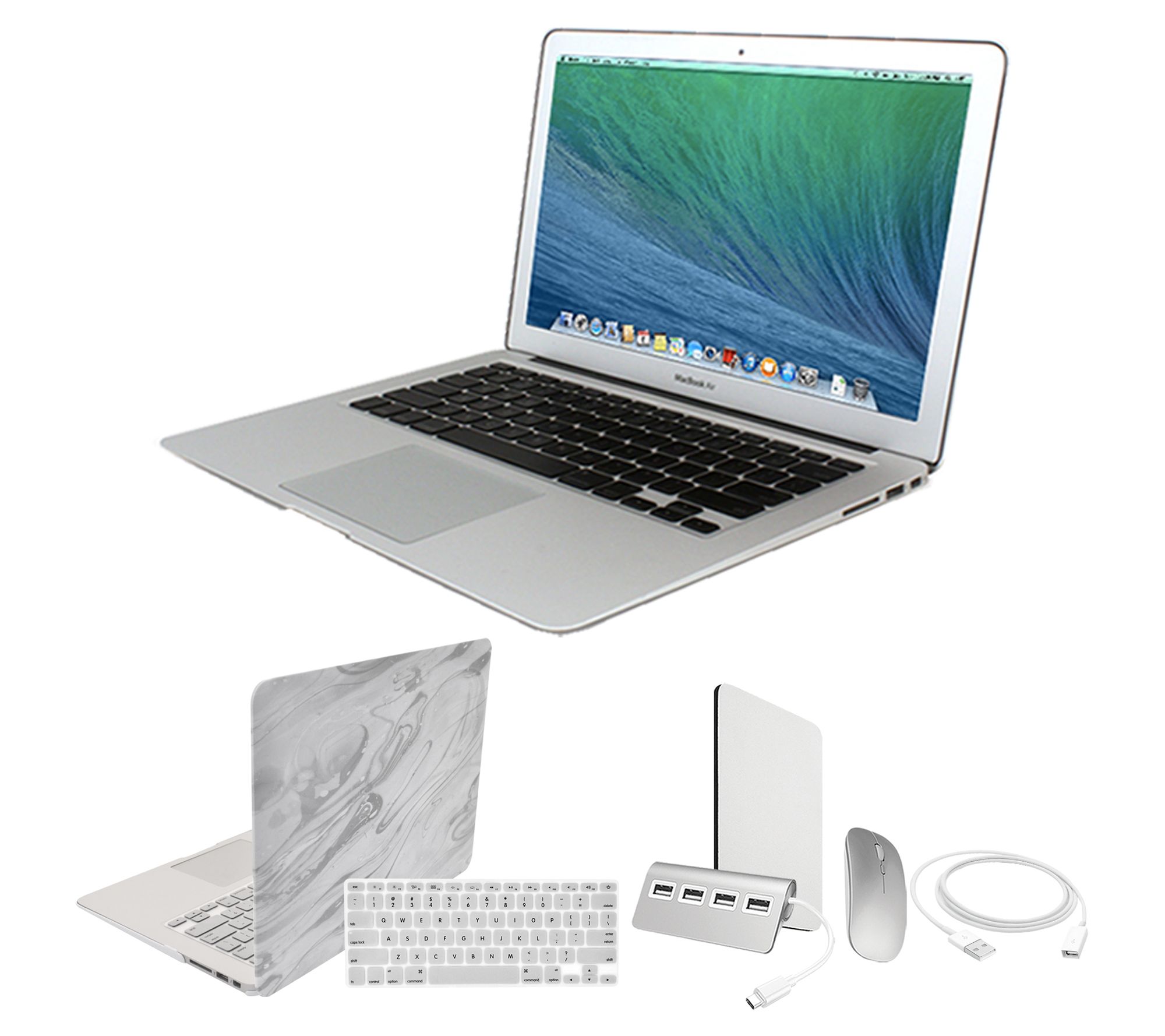 Includes refurbished MacBook Air with power adapter, AC wall plug, and power cord; fitted clip case, keyboard overlay, wireless mouse, mouse pad, four-port USB hub, USB extension cable